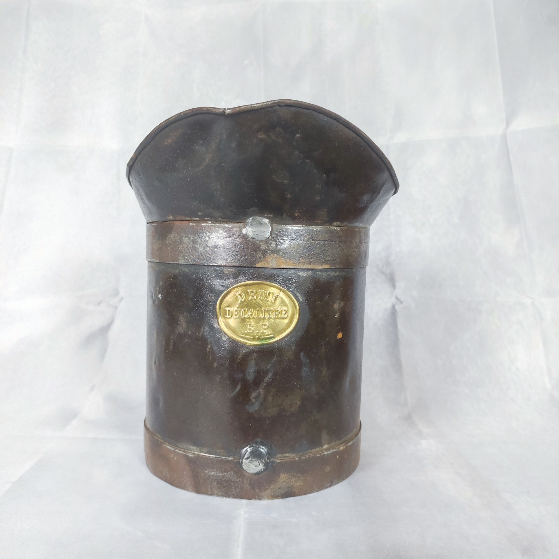 Plechová nádoba s mosazným štítkem „D’EAU DE CAMILLE 54,2“