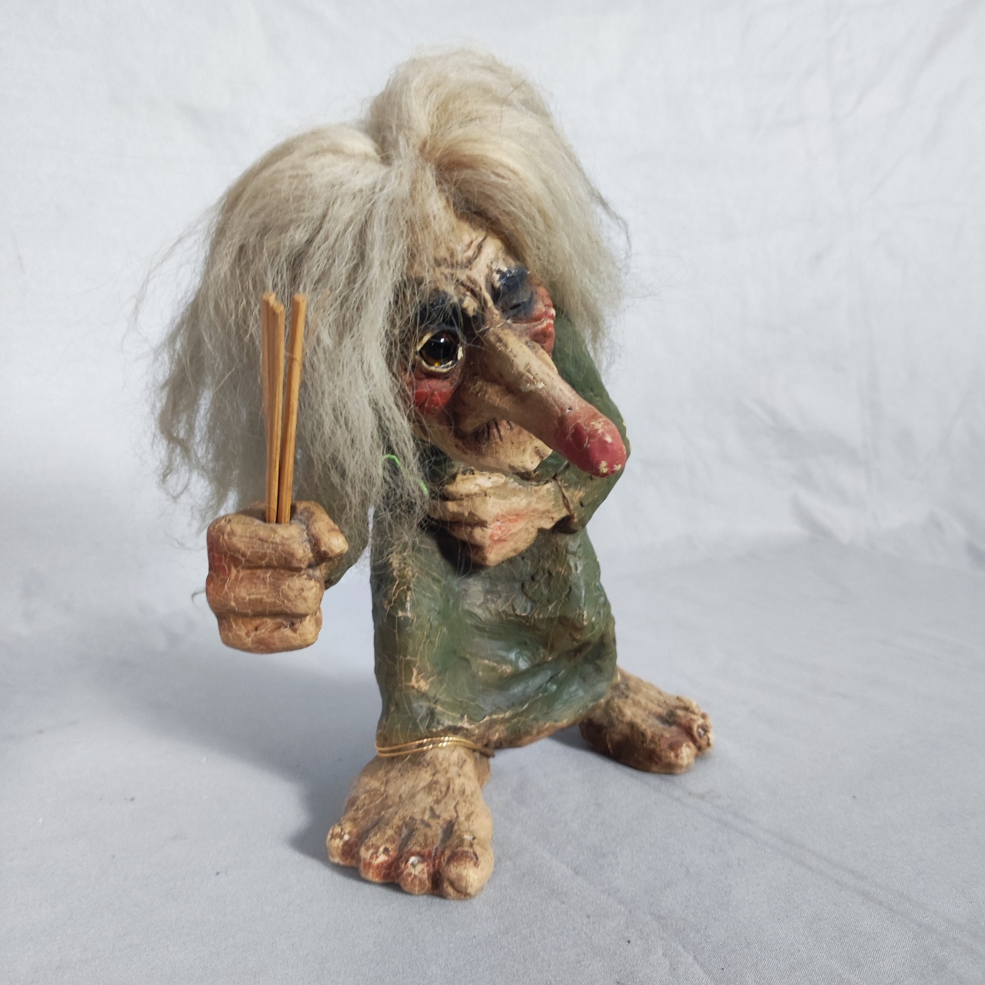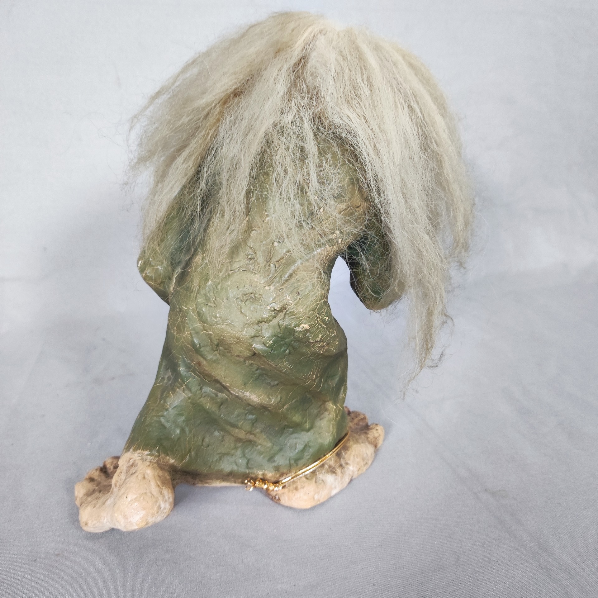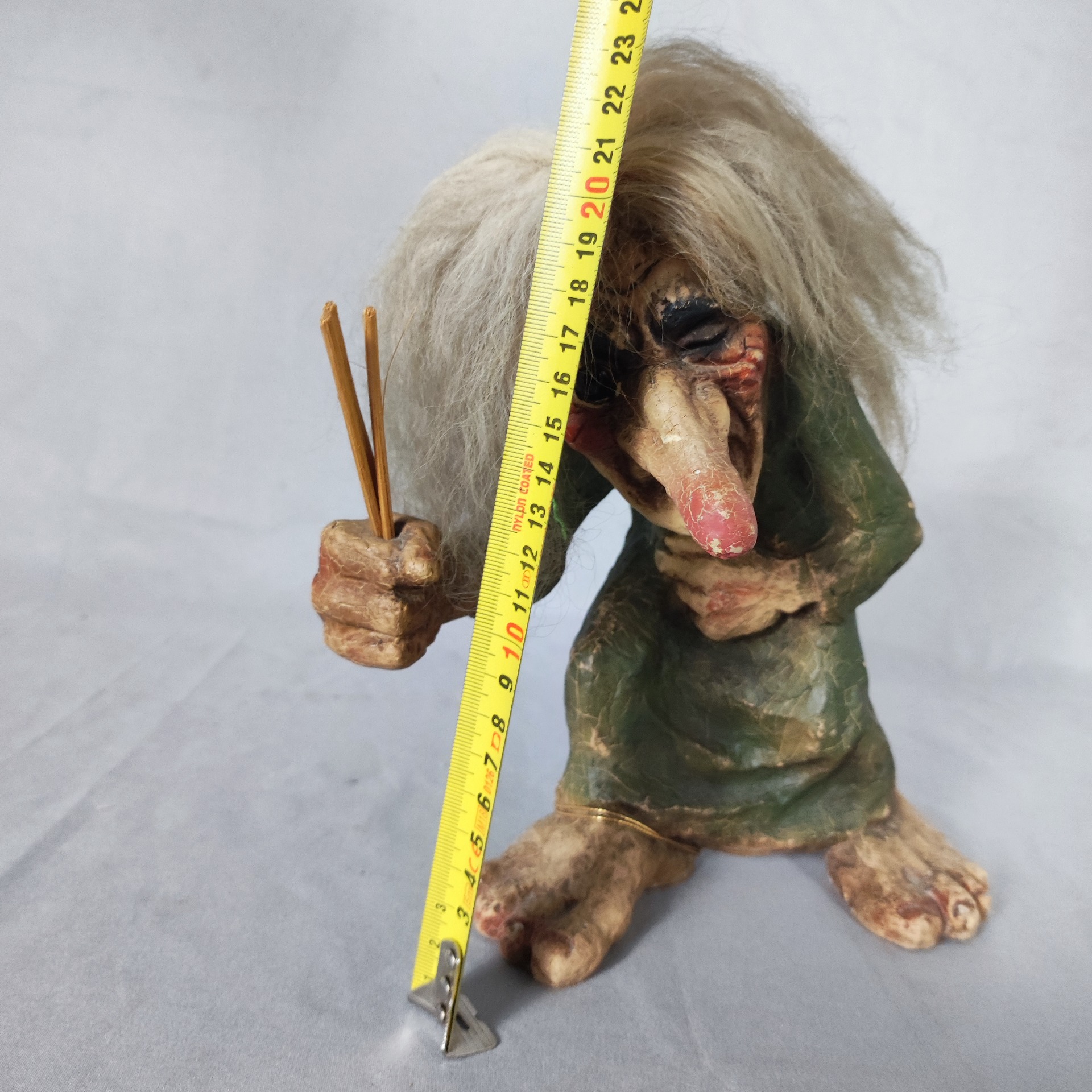 Postava je z resinu, ručně malovaná, s přirozenou patinou a drobnými stopami stáří, které k tématu patří. Vlasy jsou místy lehce rozcuchané, barva má jemné otěry, vše odpovídá charakteru a stáří figurální dekorace. Bez prasklin, stabilní, zachovalá jako celek.