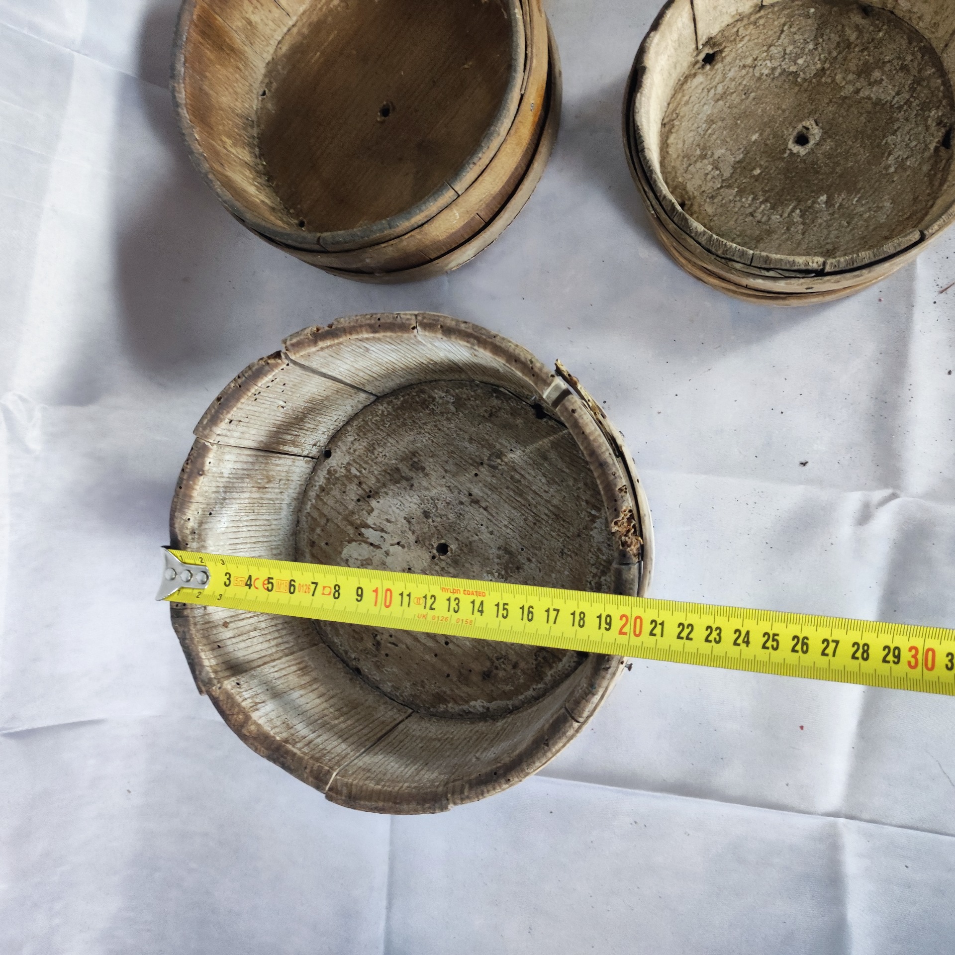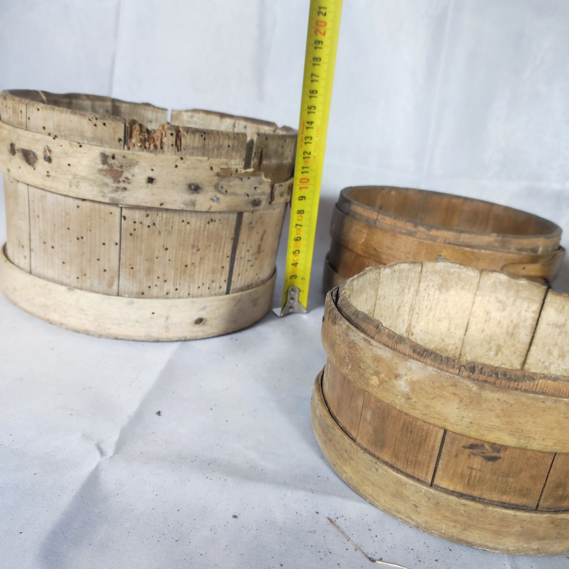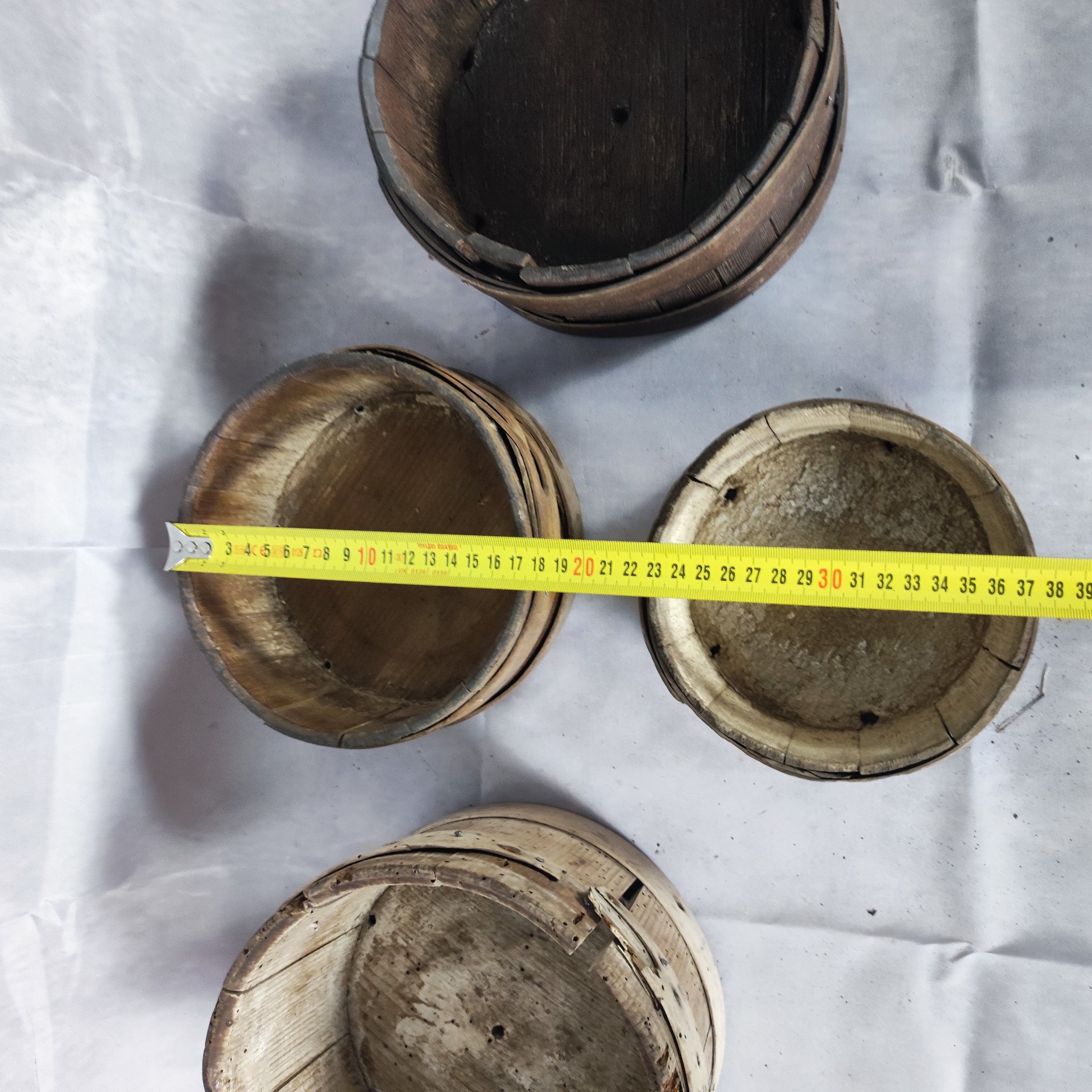 Koupeno od jednoho pána, co vyklízel starý dům plný zapomenutých věcí. Tyhle čtyři dřevěné díže ležely v koutě stodoly, každá jiná, každá z jiného času. Jedna na mouku, druhá na zelí, třetí snad na vodu, čtvrtá kdysi jen tak po ruce. Když se na ně díváš vedle sebe, působí jako čtyři generace jednoho rodu – tichý obraz venkova, který nikam nespěchá.