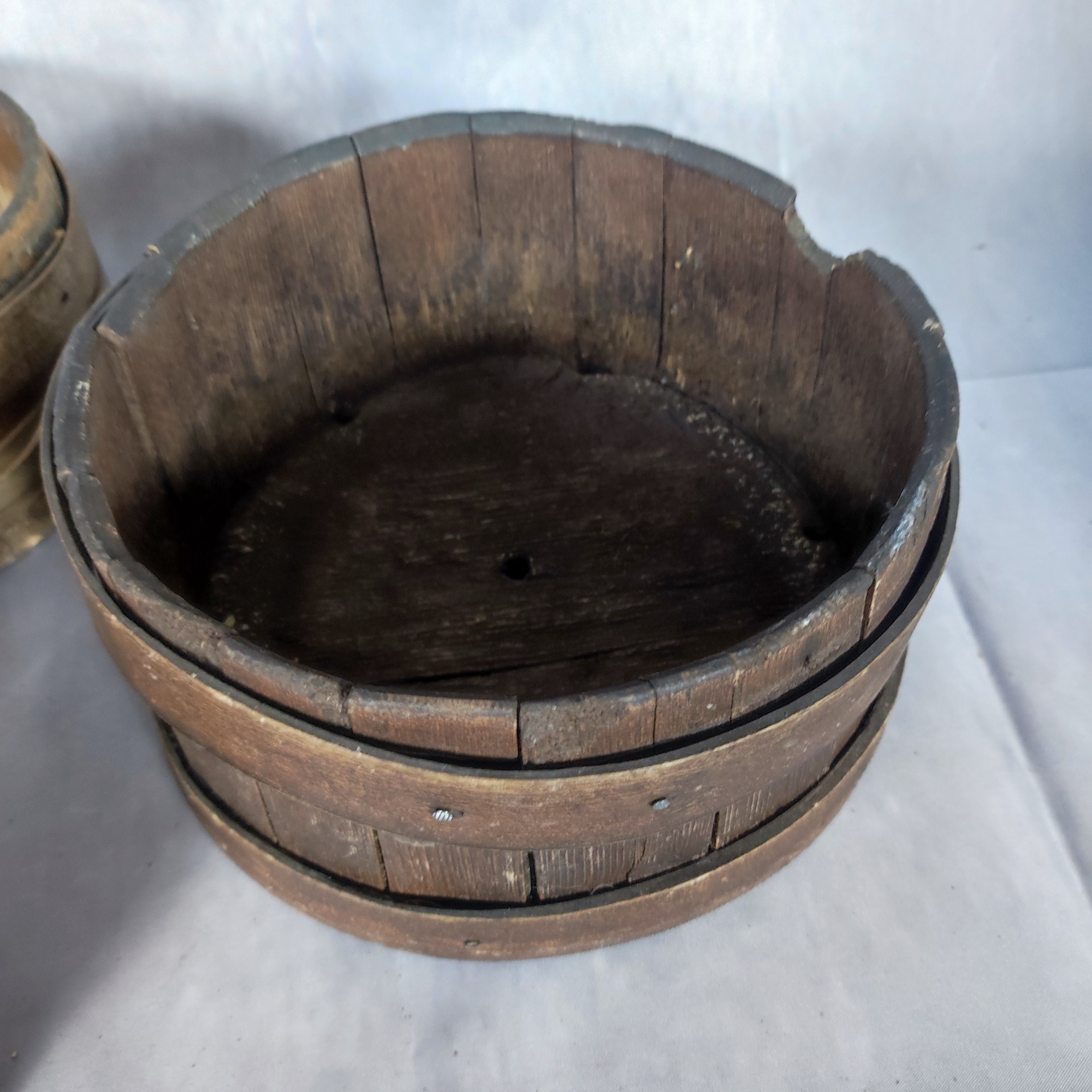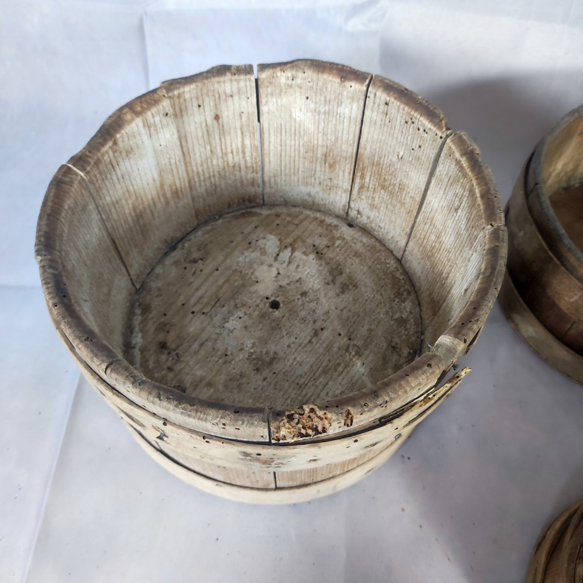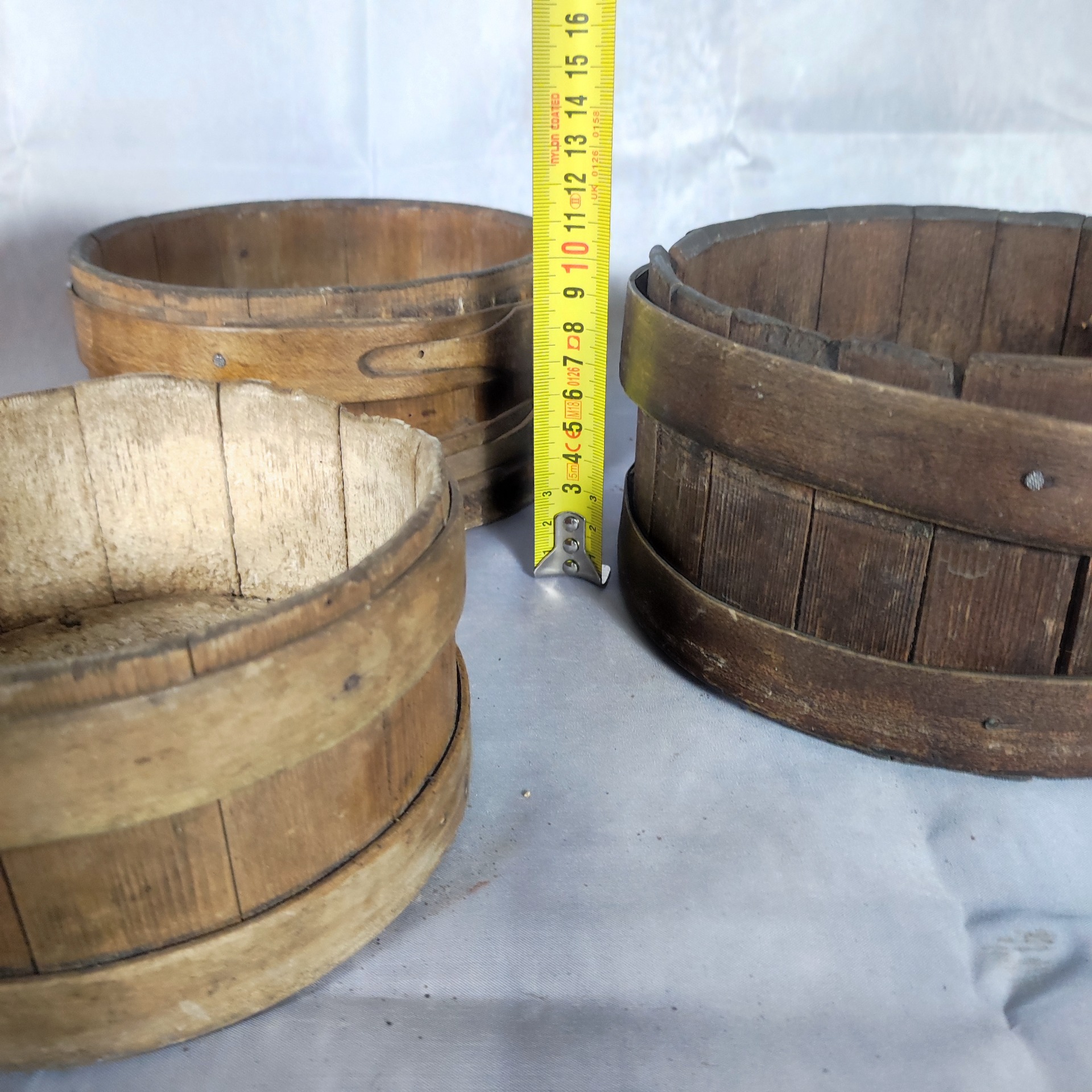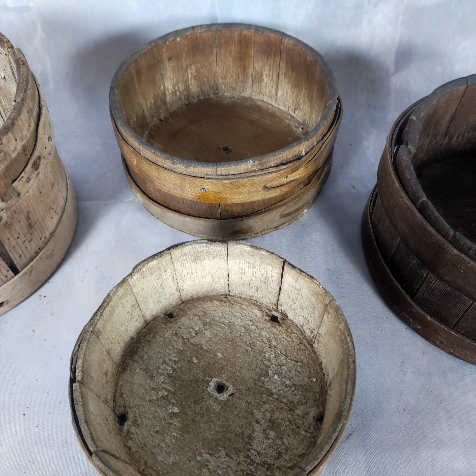 Koupeno od jednoho pána, co vyklízel starý dům plný zapomenutých věcí. Tyhle čtyři dřevěné díže ležely v koutě stodoly, každá jiná, každá z jiného času. Jedna na mouku, druhá na zelí, třetí snad na vodu, čtvrtá kdysi jen tak po ruce. Když se na ně díváš vedle sebe, působí jako čtyři generace jednoho rodu – tichý obraz venkova, který nikam nespěchá.