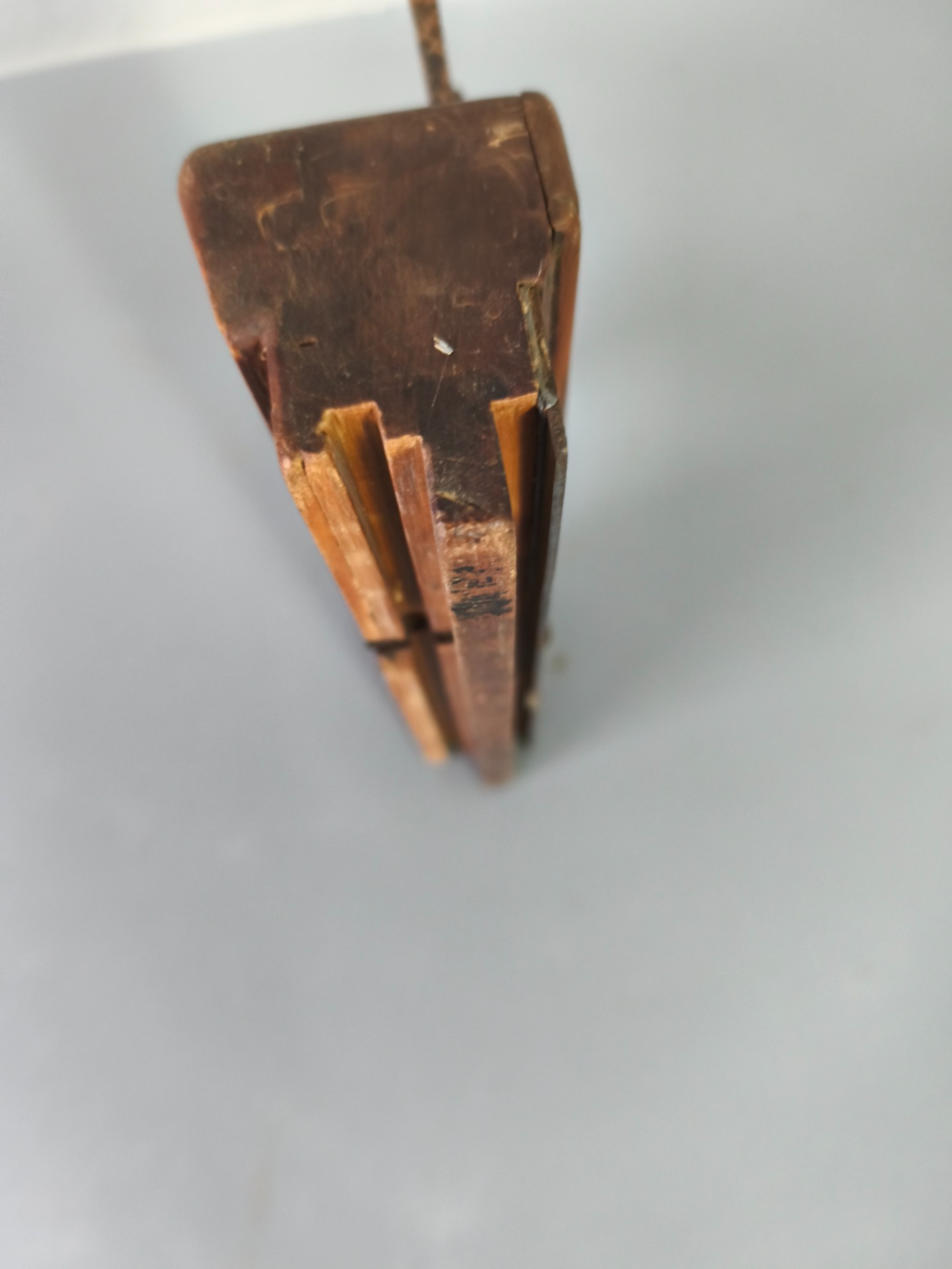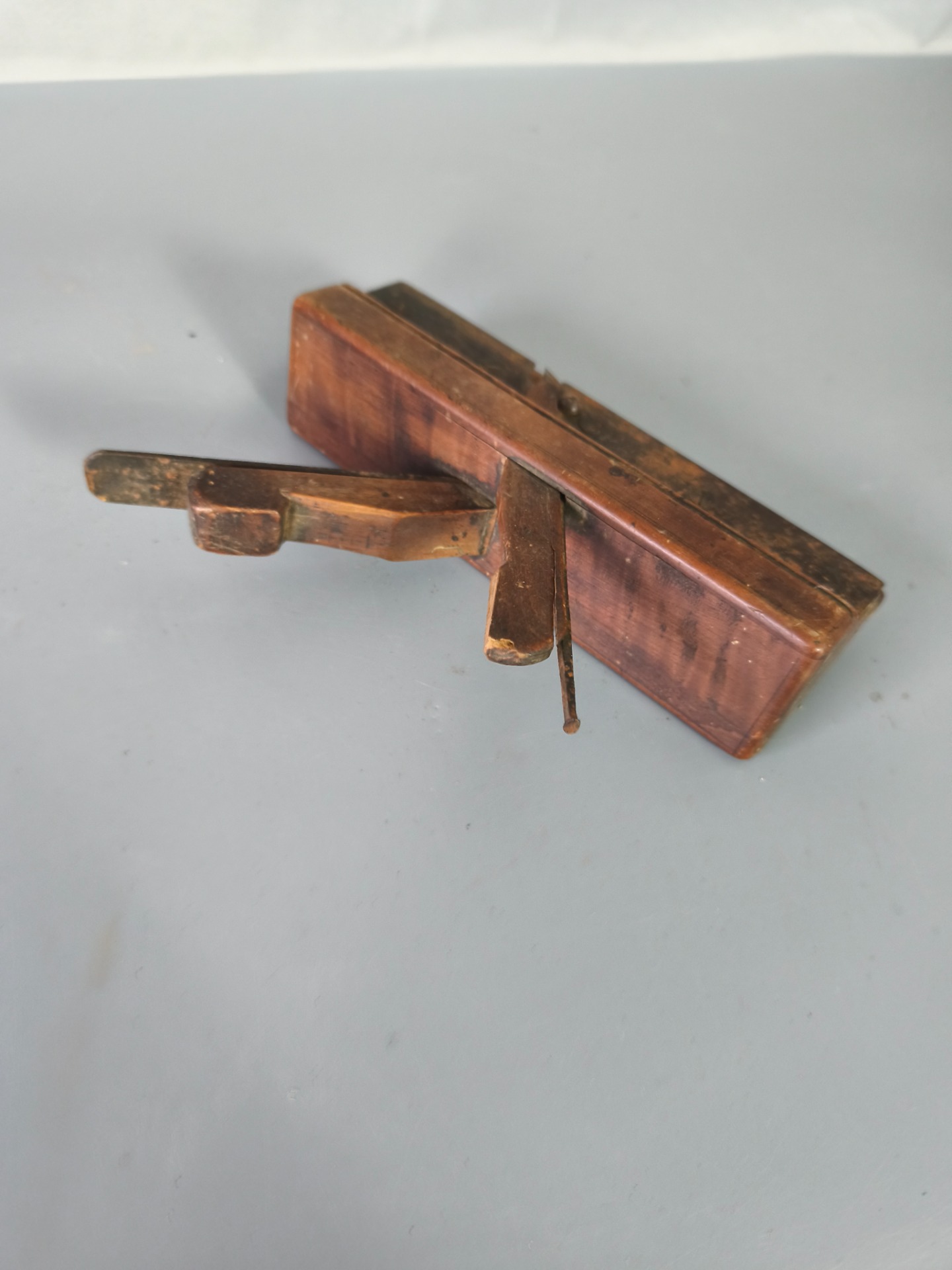 Tenhle kus jsem vzal do ruky někde mezi dřevem, prachem a tichem staré dílny. Není to naleštěná dekorace, ale poctivý truhlářský hoblík, který celý život dělal přesně to, co měl – vedl ruku a bral materiál po vrstvách, bez spěchu. Dřevo je tmavé od let používání, hrany jsou oblé tam, kde se dotýkala dlaň, a kovové části nesou stopy práce, ne zanedbání.