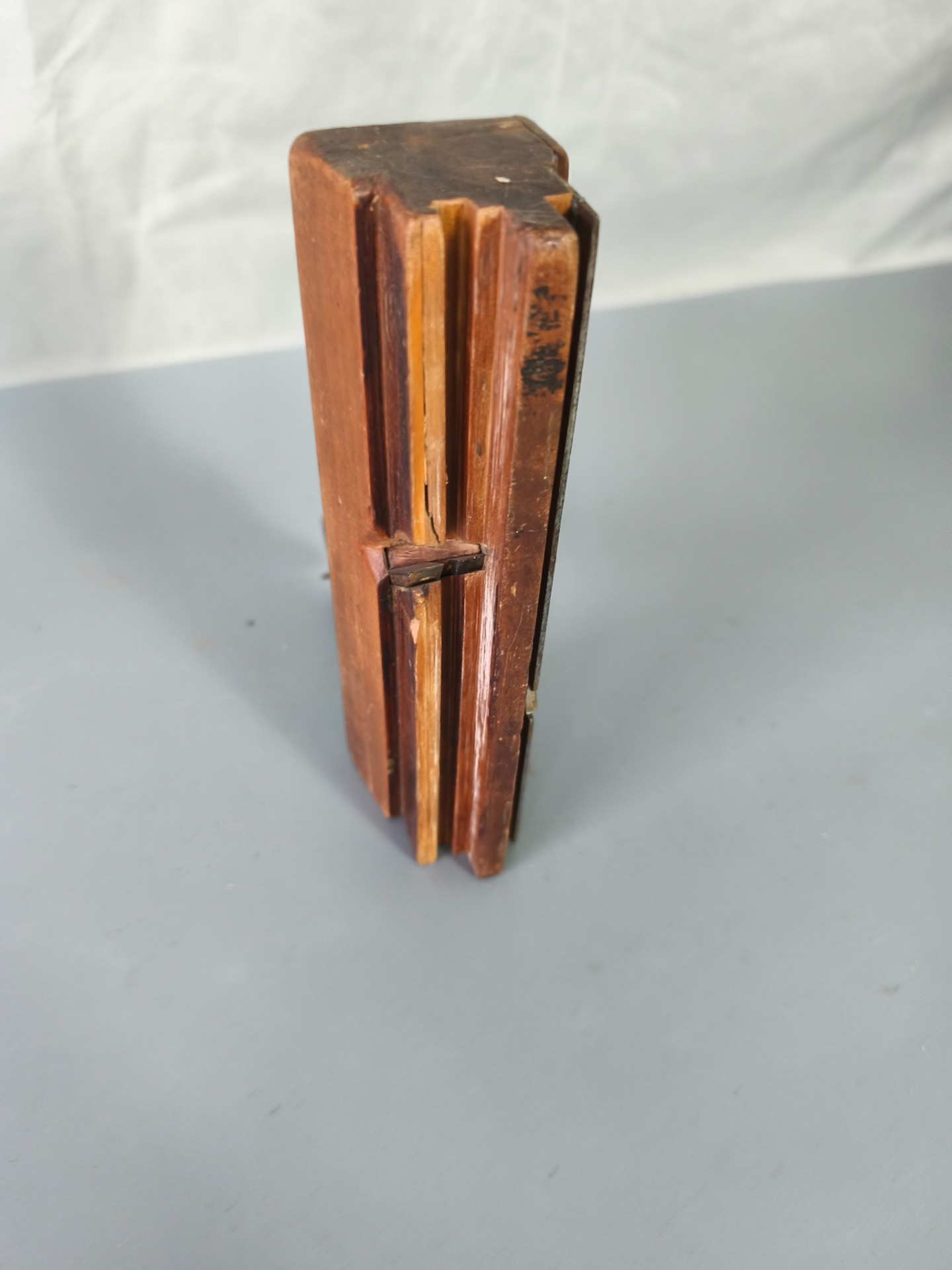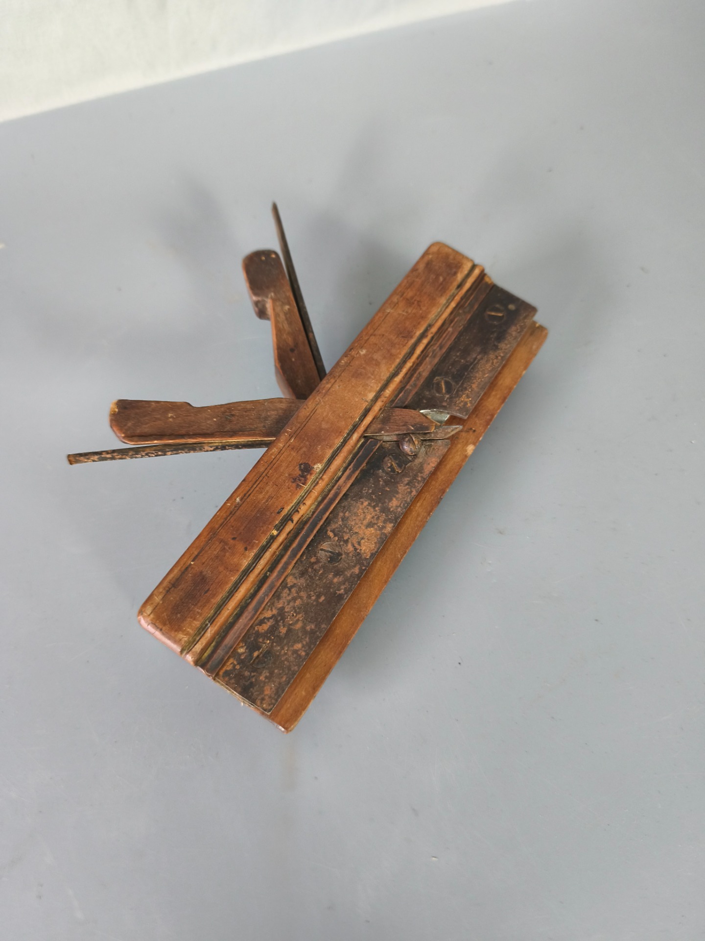 Plně zachovalý kus se zřetelnou patinou. Dřevo bez prasklin, kovové části kompletní, povrchové stopy stáří a používání odpovídají věku. Nářadí nebylo renovováno – zůstalo tak, jak ho zanechal čas.