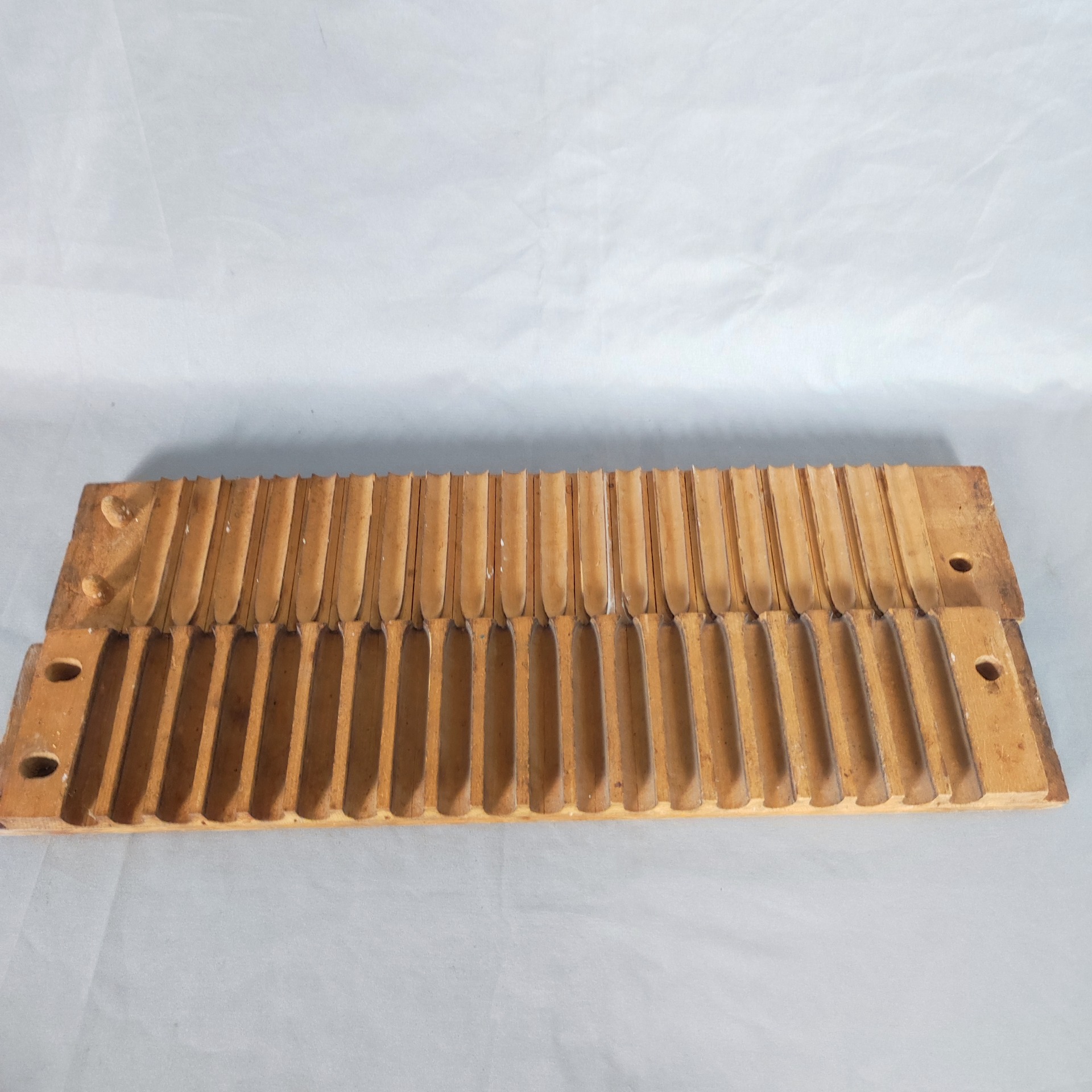 Dřevěný lis na doutníky, masivní kus s pravidelně vyvrtanými otvory. Povrch nese výrazné stopy stáří a používání, nápisy a značení čitelné. Konstrukčně pevný, bez zásadního poškození. Rozměry jsou patrné z fotografií.