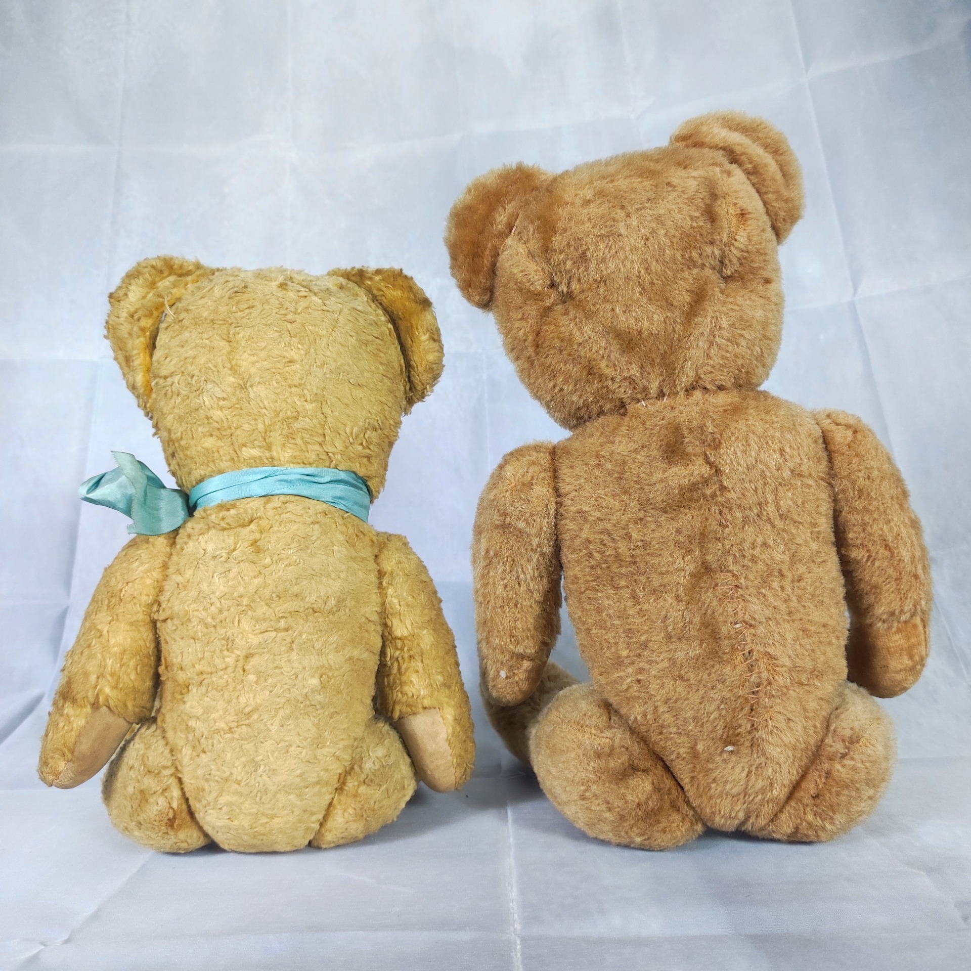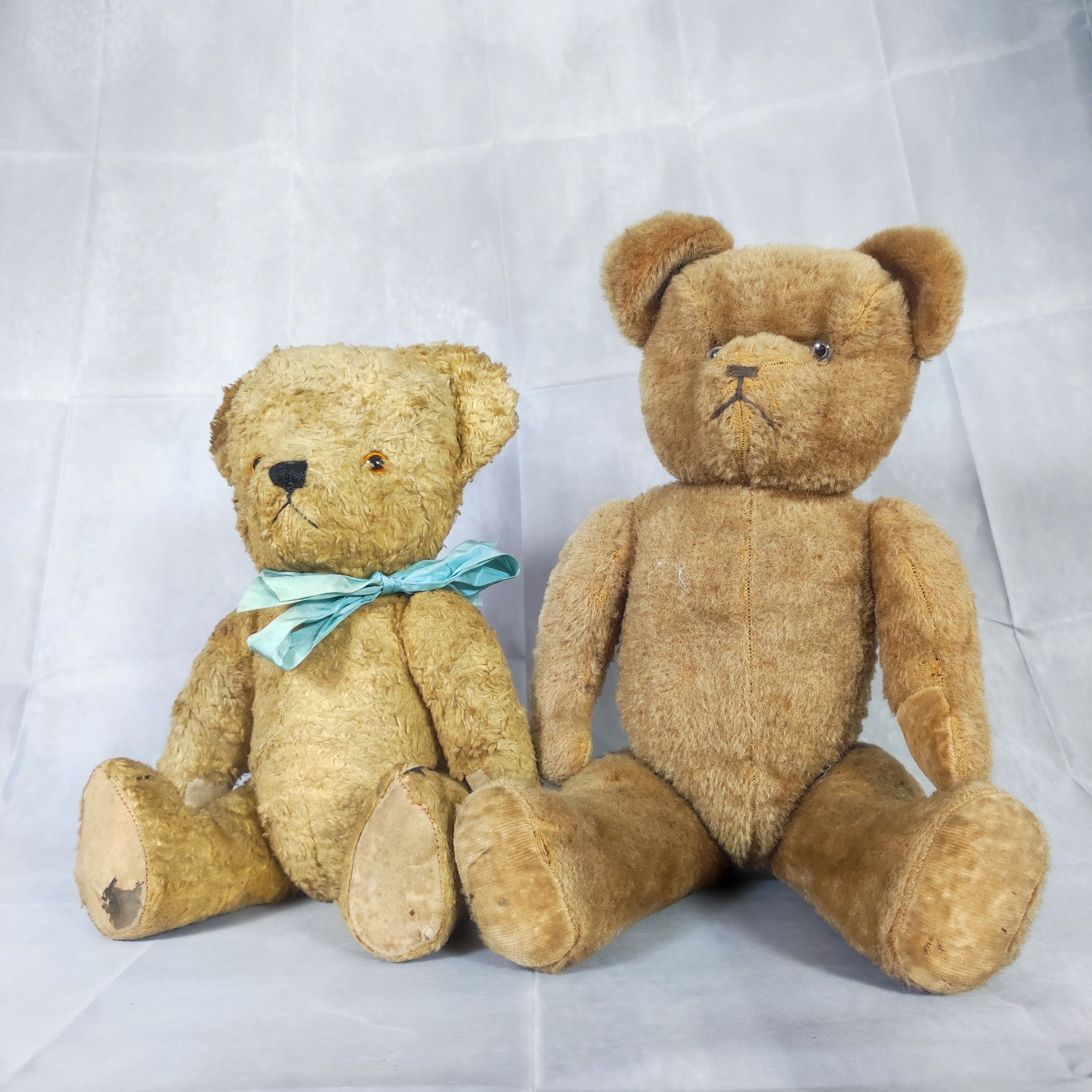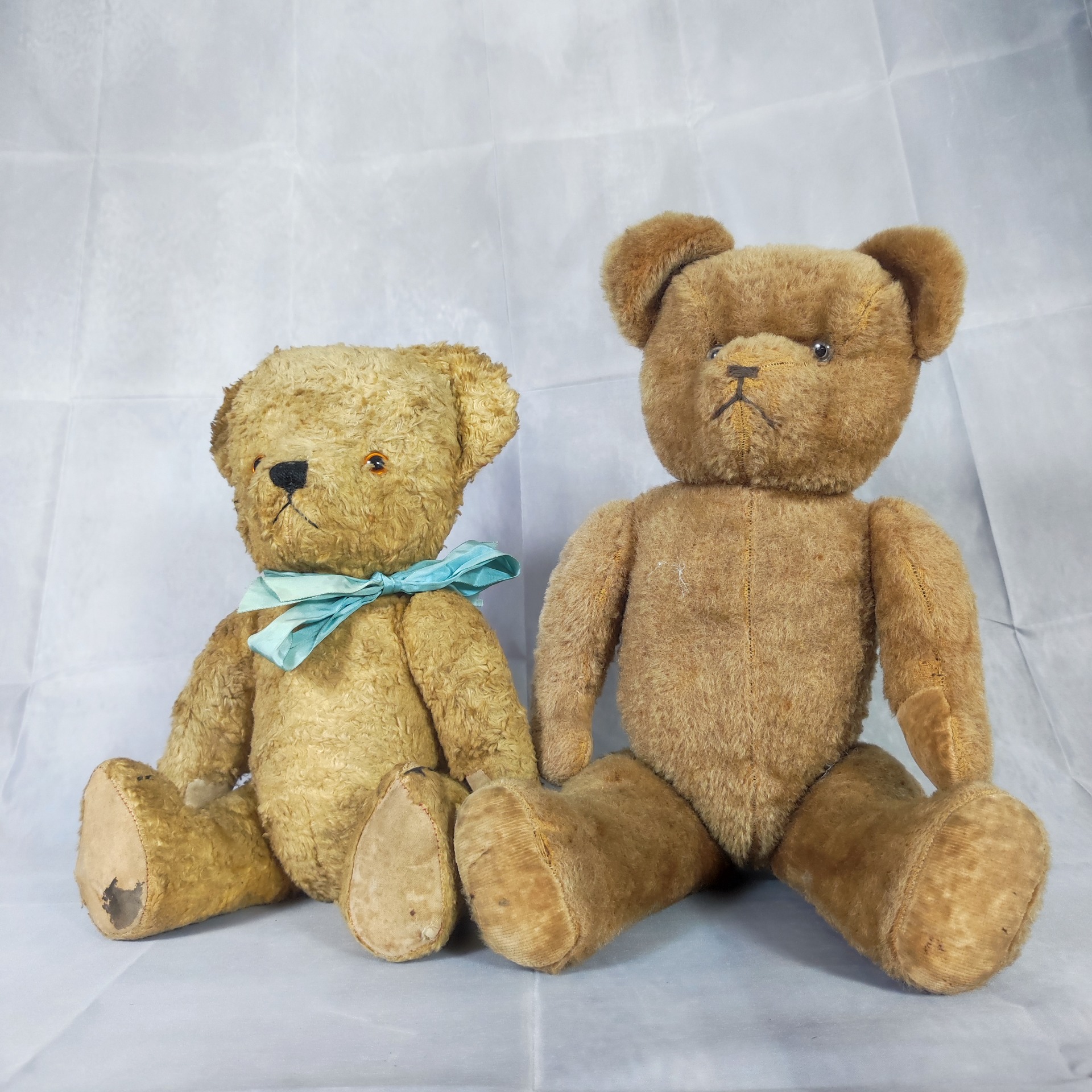 Tyhle medvědy bych odhadl tak na 50.–60. léta, ruční šití, výplň ze slámy a pilin, skleněné oči, které pamatují světlo z oken starých dětských pokojů.