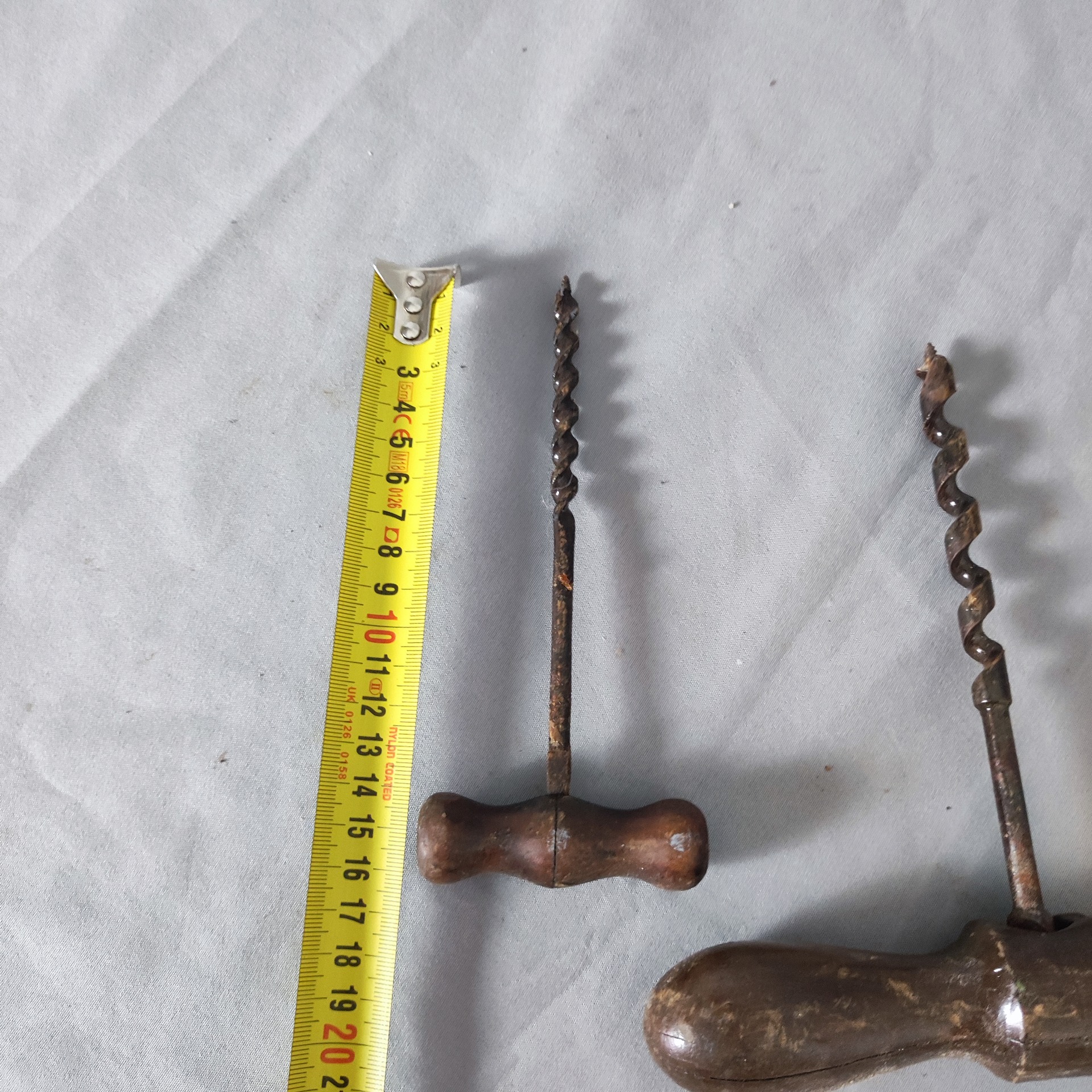 Oba kusy kompletní a pevné. Dřevěné rukojeti původní, bez zásadního poškození. Kov s přirozenou oxidací, šnekové vrtáky rovné, bez prasklin či zlomení. Nečištěno do novoty, zachovaný autentický stav.
