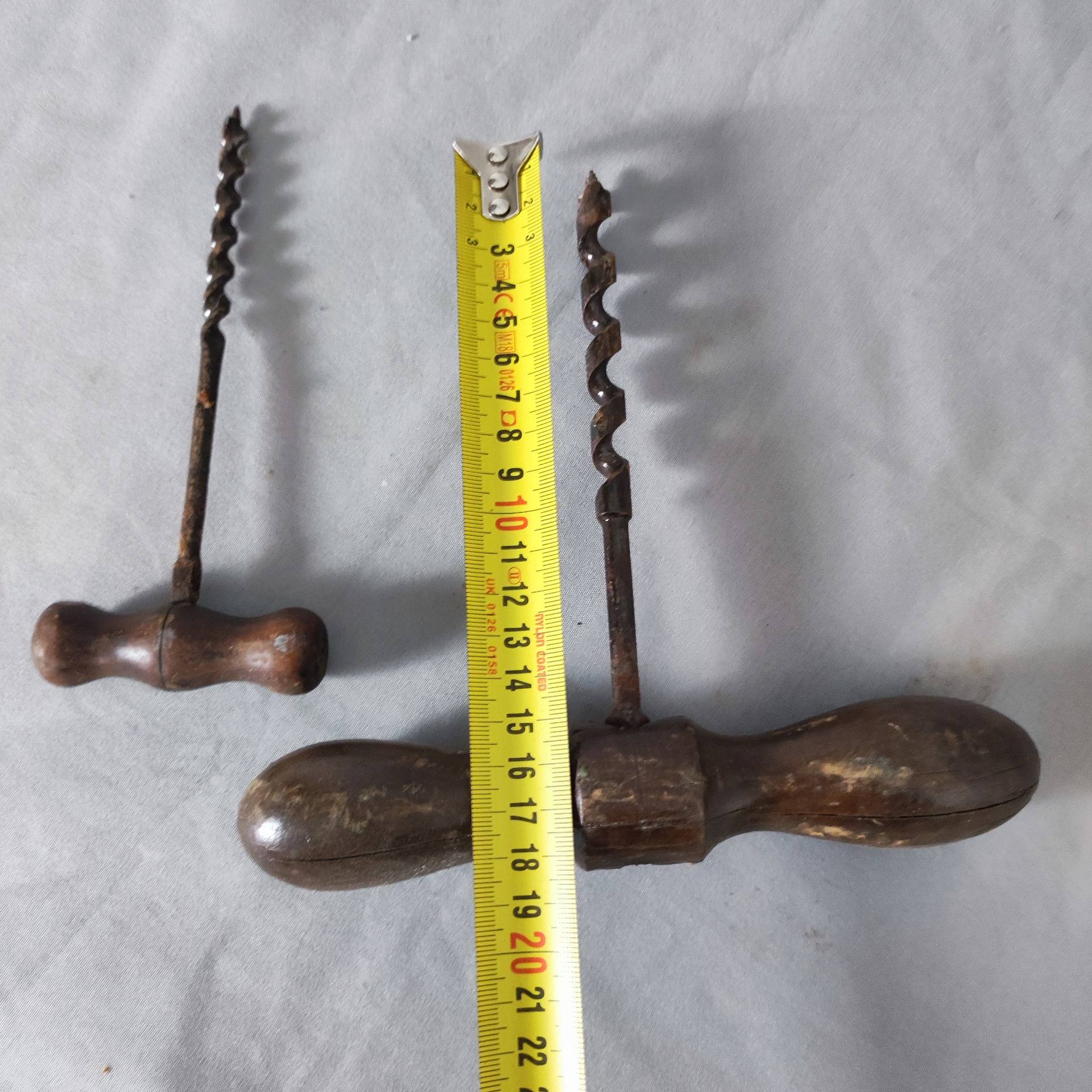 Tyhle ruční vrtáky patří do doby, kdy se díra do dřeva nedělala hlukem, ale rukama. Šnekové vrtáky s dřevěnými příčnými rukojeťmi, každý jiný, oba poctivě používané. Dřevo je tmavé, hladké, s drobnými prasklinkami a stopami let práce. Ocelové vrtáky jsou masivní, rovné, s výrazným šnekem, který si dřevo bere pomalu a jistě.