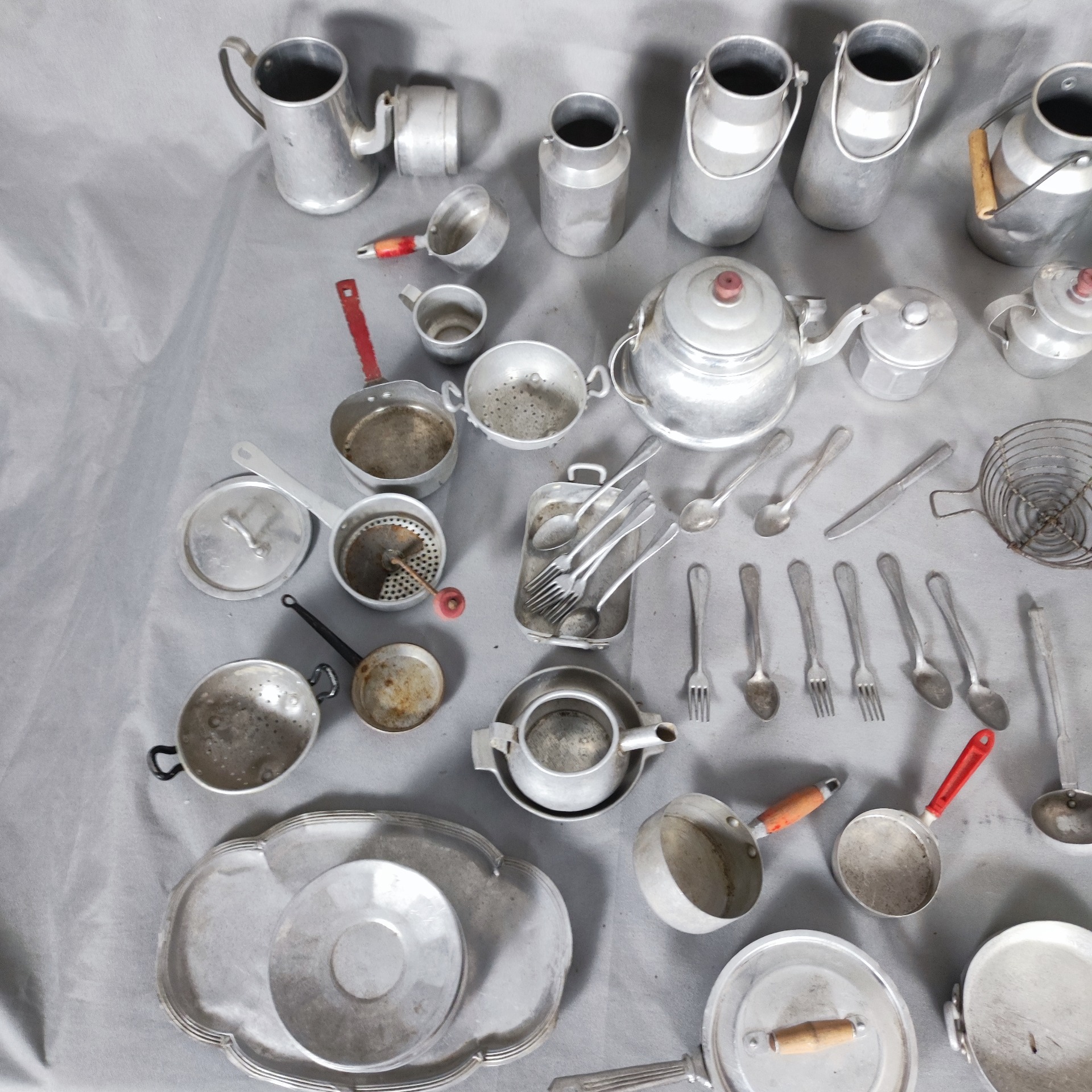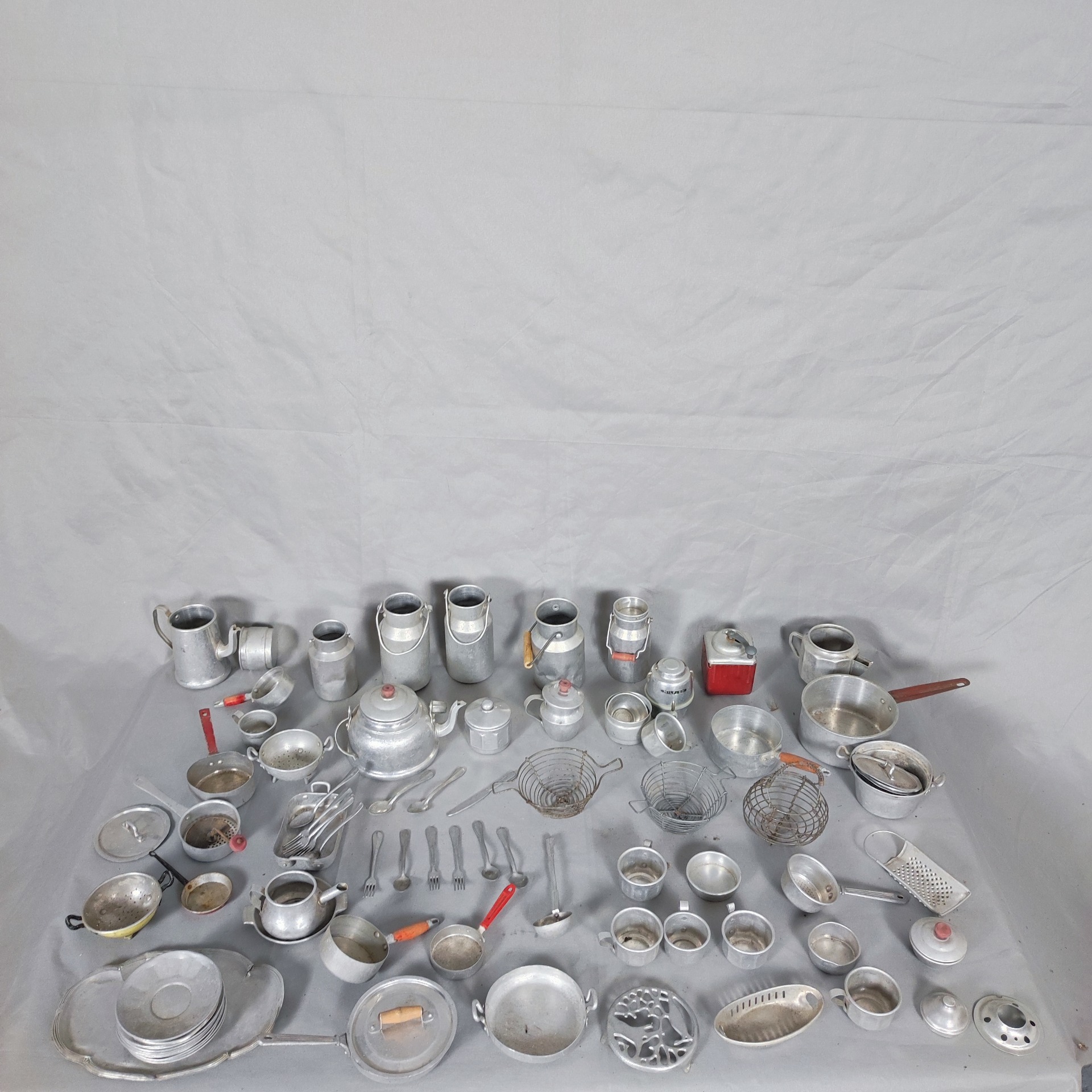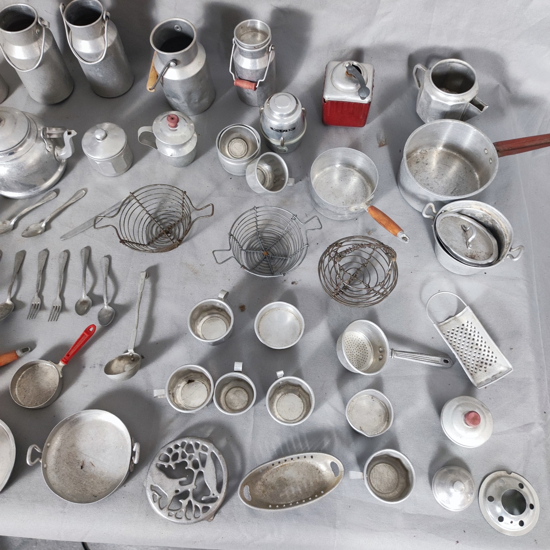 Tenhle soubor patří do světa dětí a fantazie. Ne do lidské kuchyně, ale do pokojíčků, kde se vařilo „jen jako“. Hliníkové hrnce, konvičky, hrníčky, cedníky, talířky i drobné náčiní vznikly jako miniatury kuchyně pro panenky, vyráběné ve Francii v průběhu 20. století.