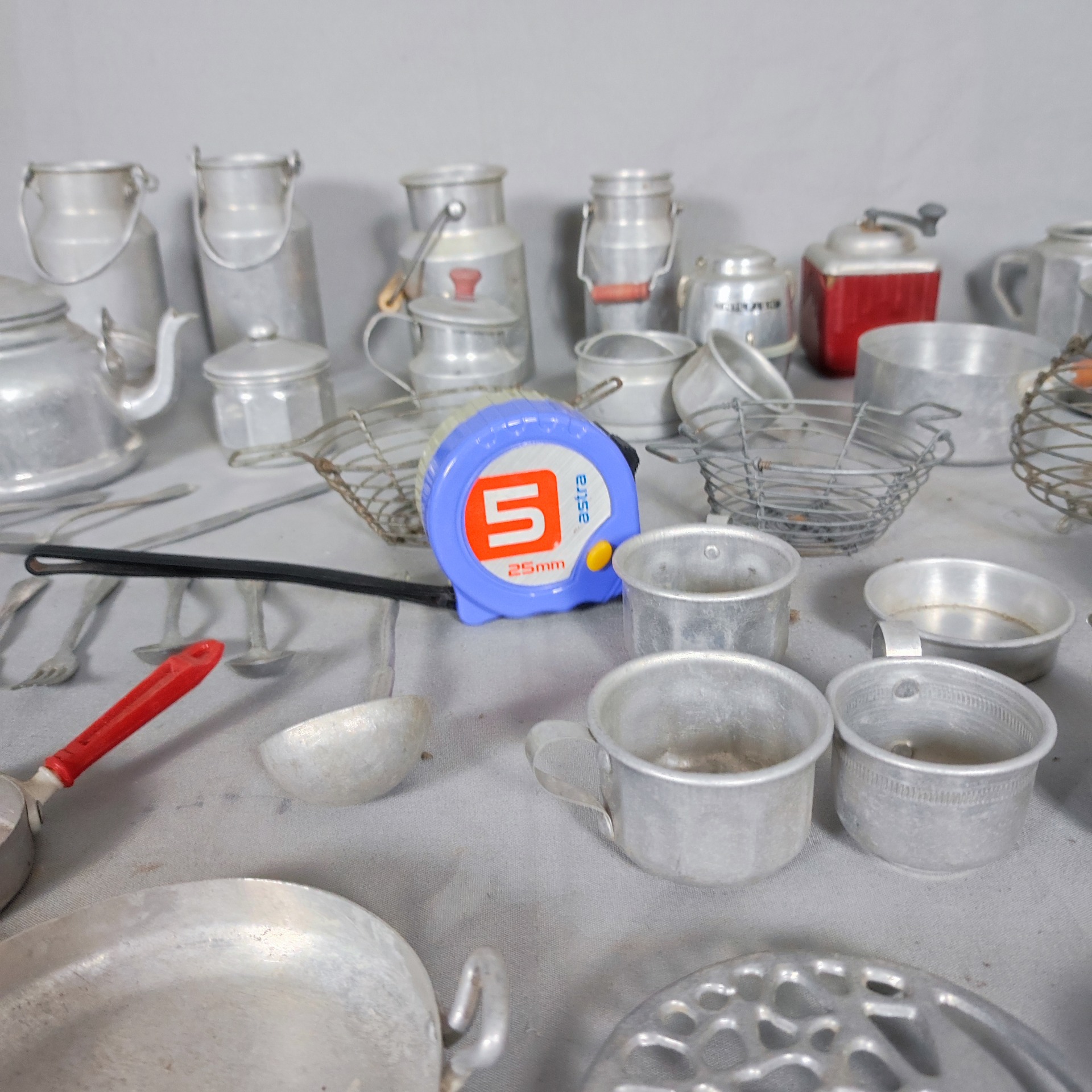 Materiál je stejný jako u skutečného nádobí – hliník – jen v menším měřítku. I proto působí tak poctivě. Děti si s nimi hrály denně, braly je vážně, jako skutečnou kuchyň. A na věcech je to znát. Oděrky, patina, drobné promáčkliny – stopy hry, ne poškození.