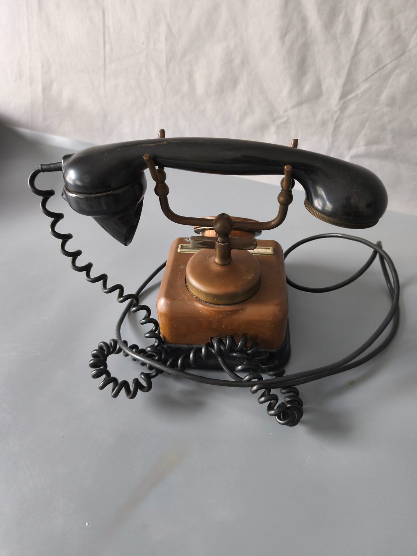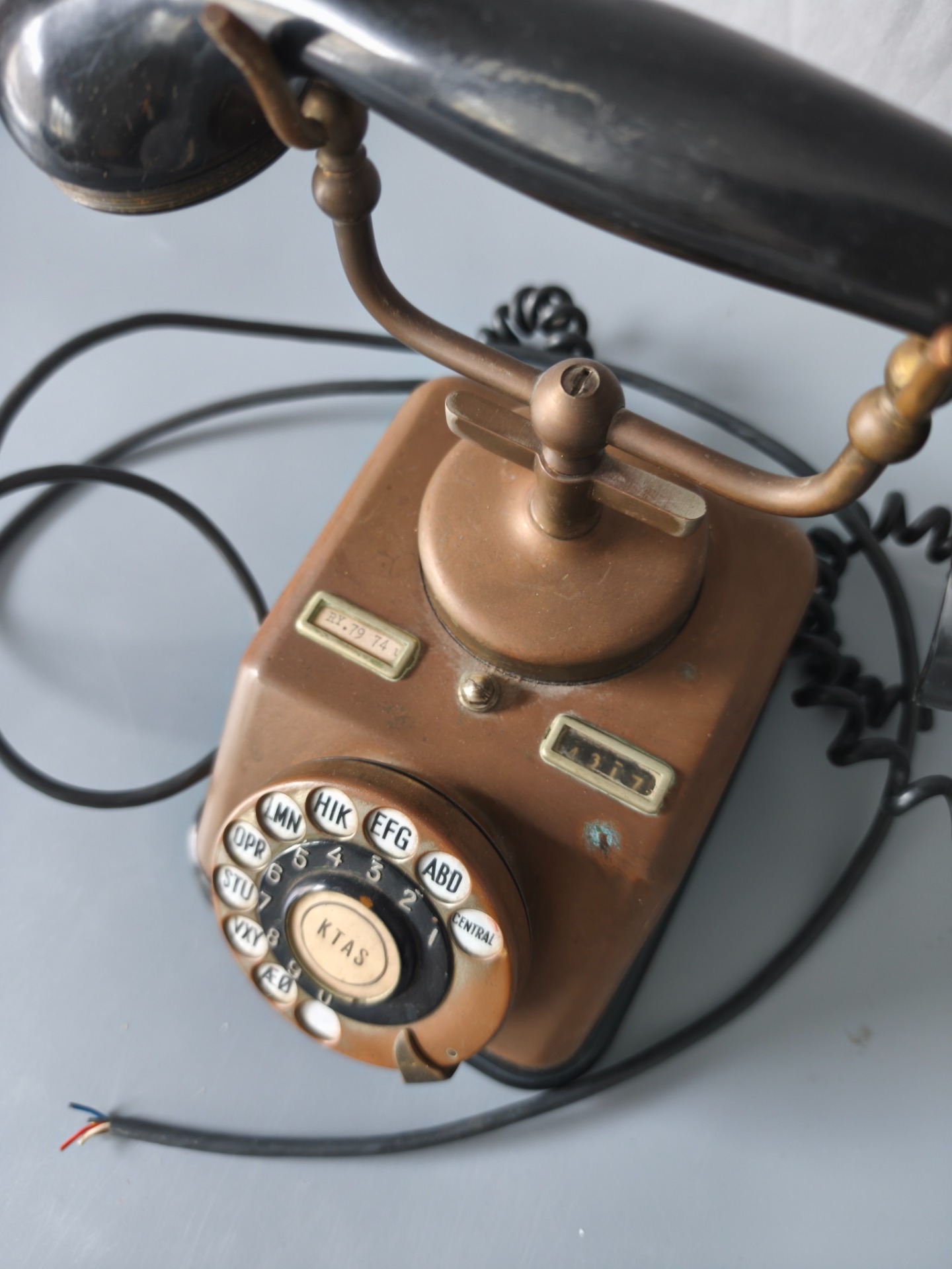 Tenhle telefon patřil na pracovní stůl, ne na komodu. Kovové tělo s měděnou povrchovou úpravou má váhu a klid věci, která byla vyrobená proto, aby sloužila roky bez řečí. Černé bakelitové sluchátko je hladké tam, kde ho lidé zvedali každý den, a kabel se stáčí do pevné spirály, jak to uměly jen staré materiály.