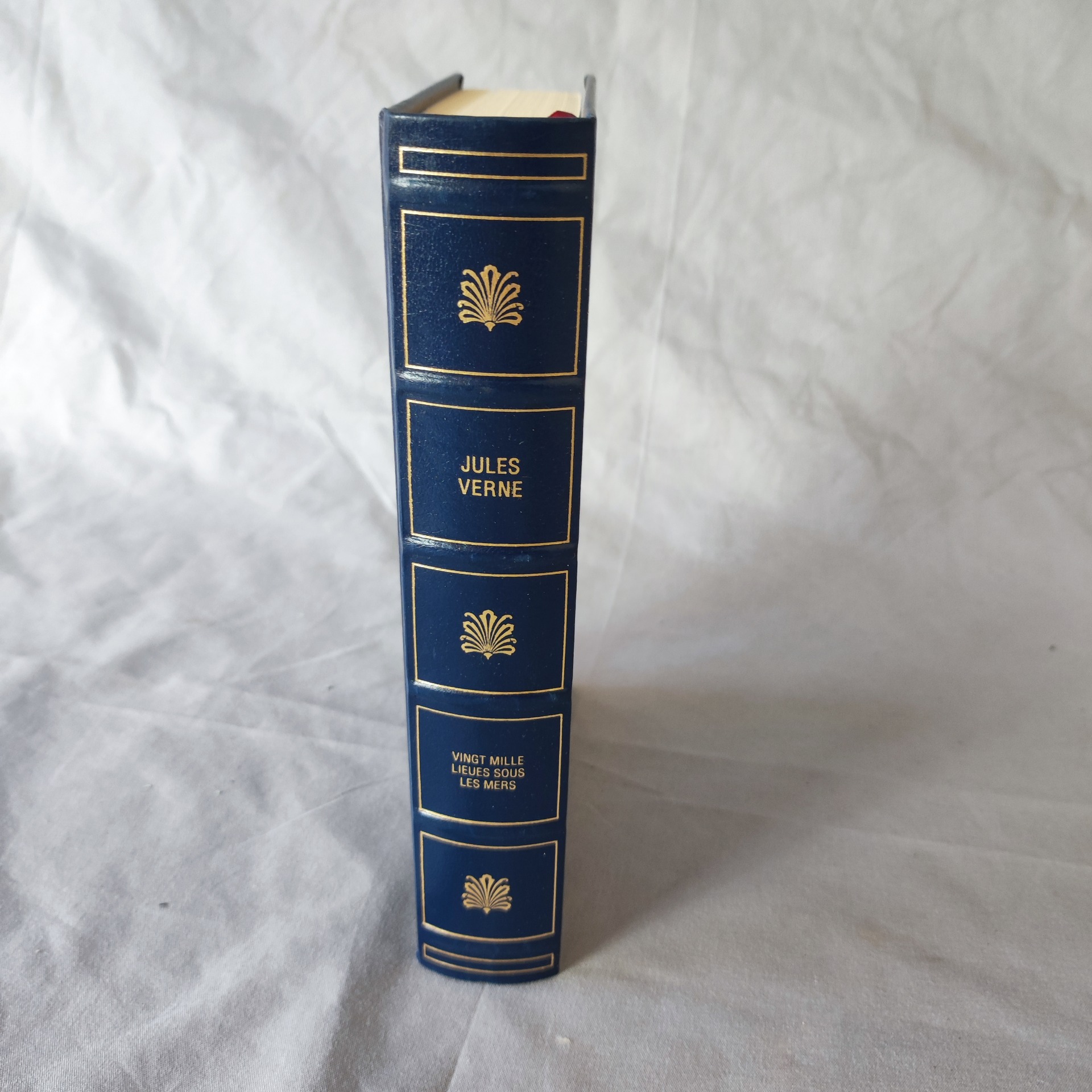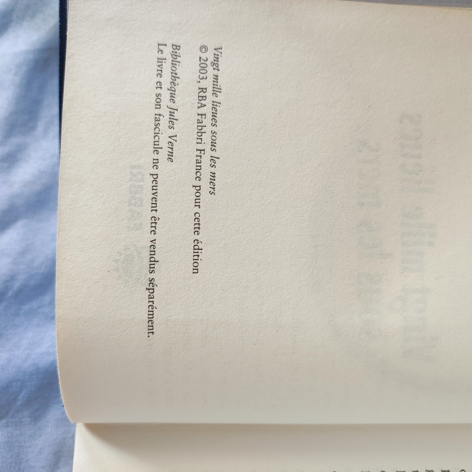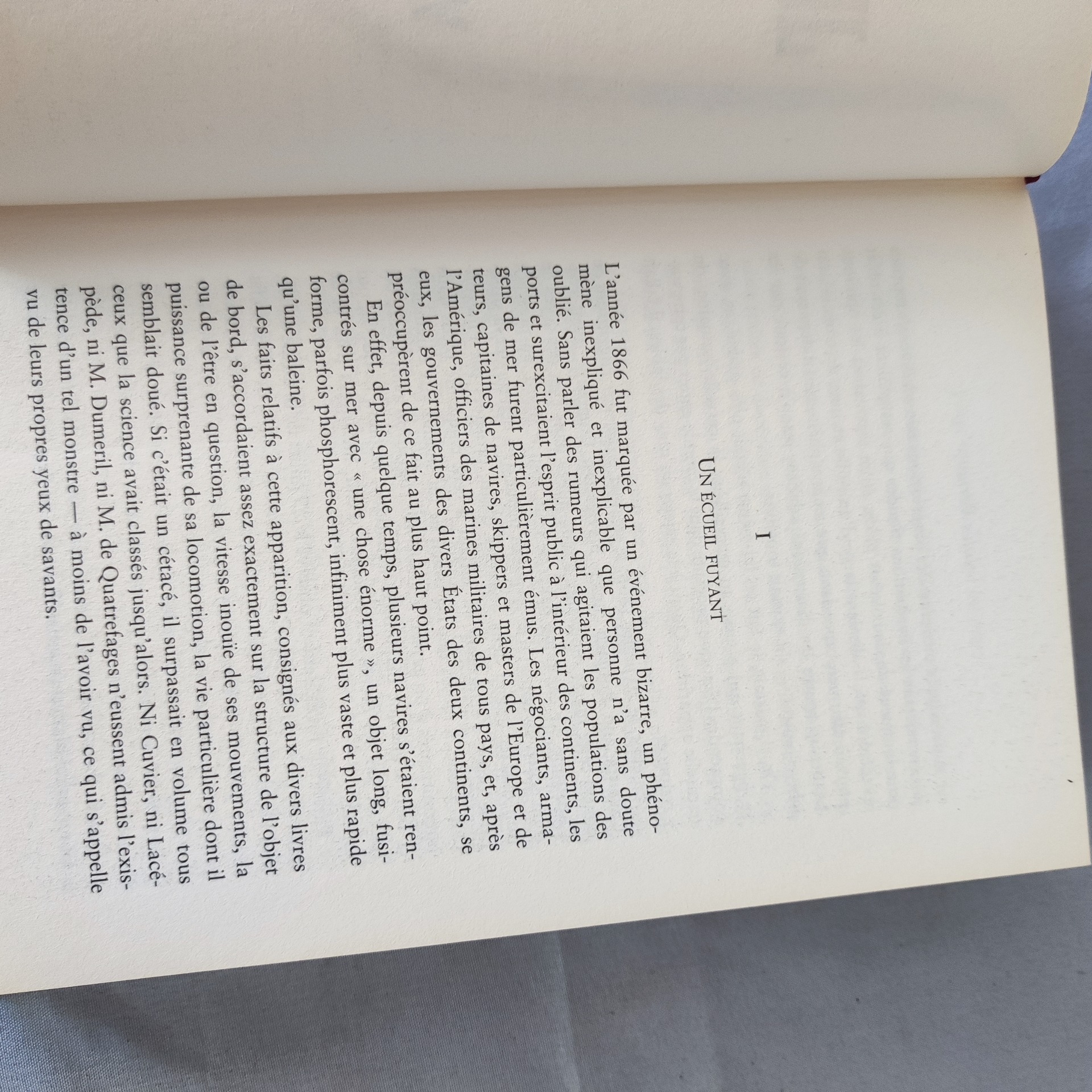 Je to moderní francouzské vydání z roku 2003, které ctí ducha starých tisků. Stránky jsou čisté, pevné, bez zápachu, červená stužka jako záložka drží místo tam, kde se kapitán Nemo potápí do ticha oceánu. I když jde o novodobou edici, má kouzlo klasické knihovny – tu váhu, kterou poznáš, když ji vezmeš do ruky.