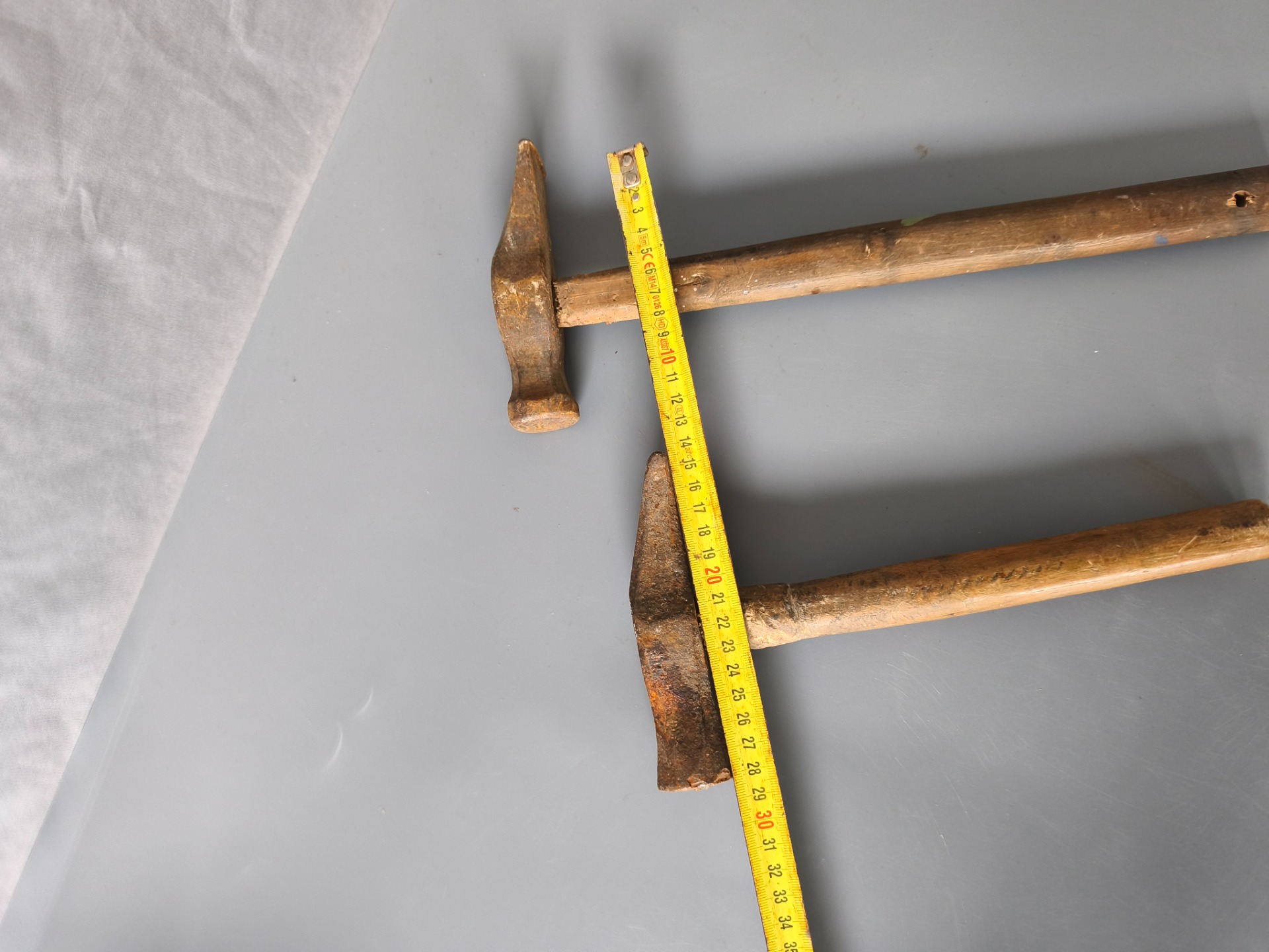 Používaný stav odpovídající stáří – hlavy pevné, dřevěná topůrka drží. Na jednom topůrku je viditelné poškození/dírka (viz foto). Patina a drobné stopy používání jsou součást charakteru.