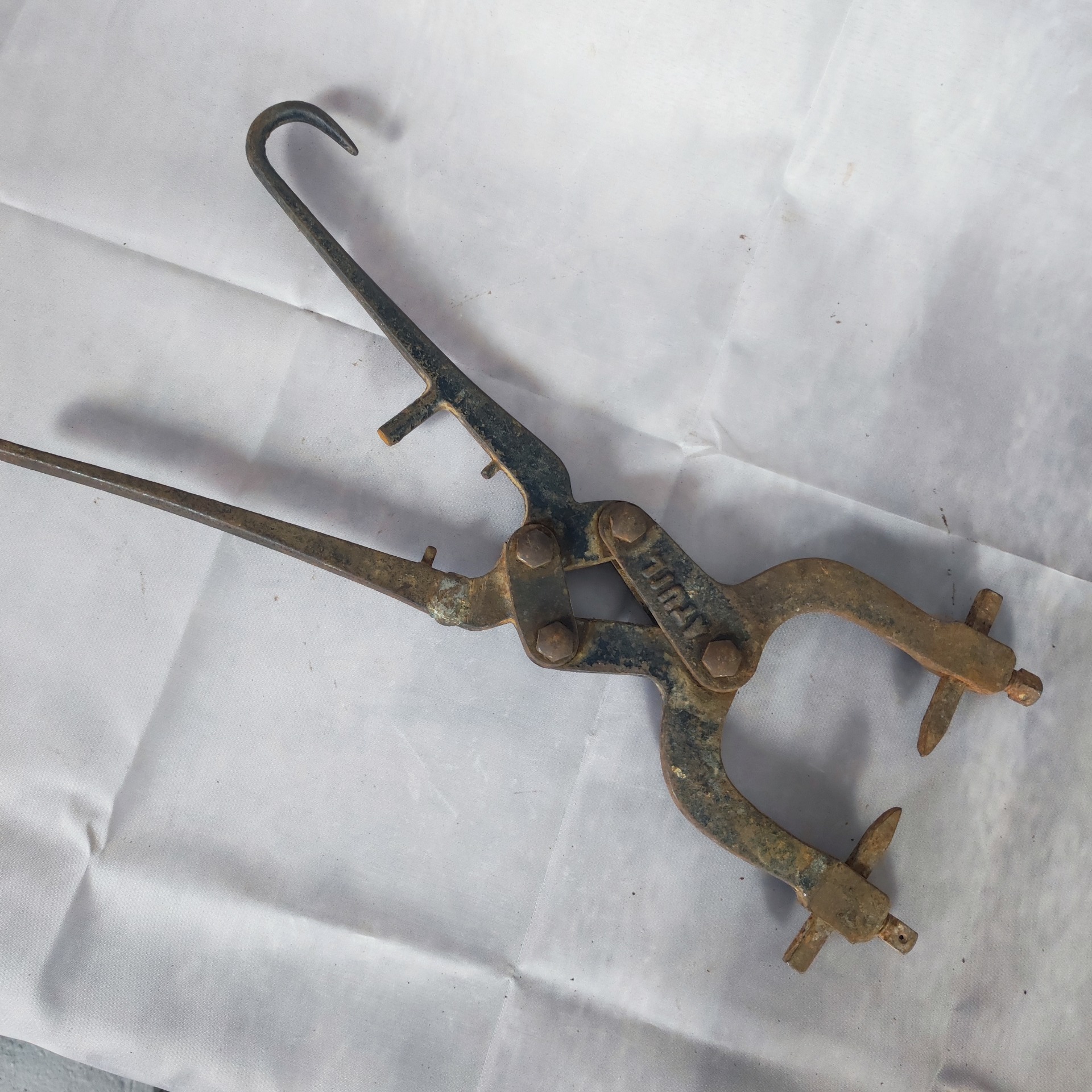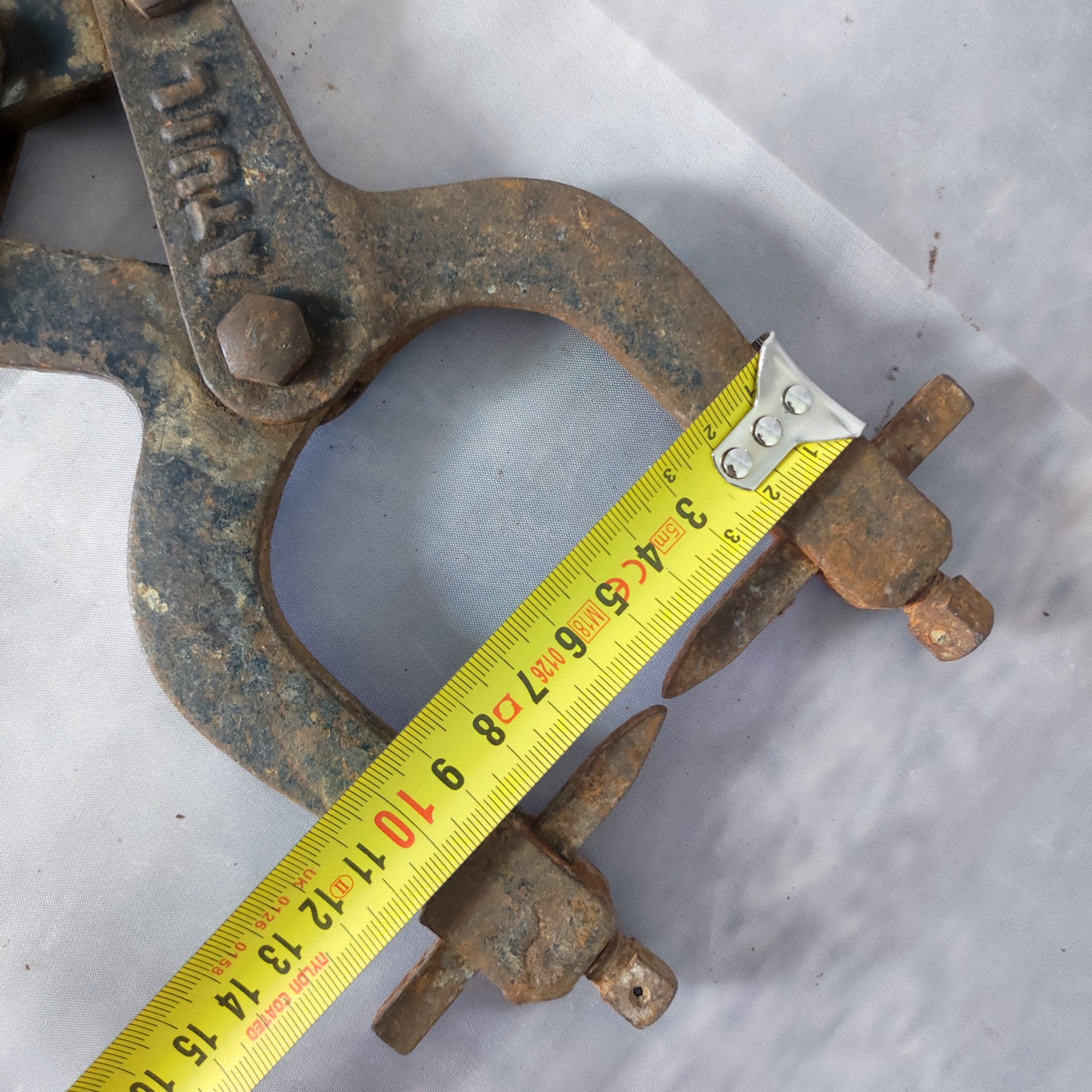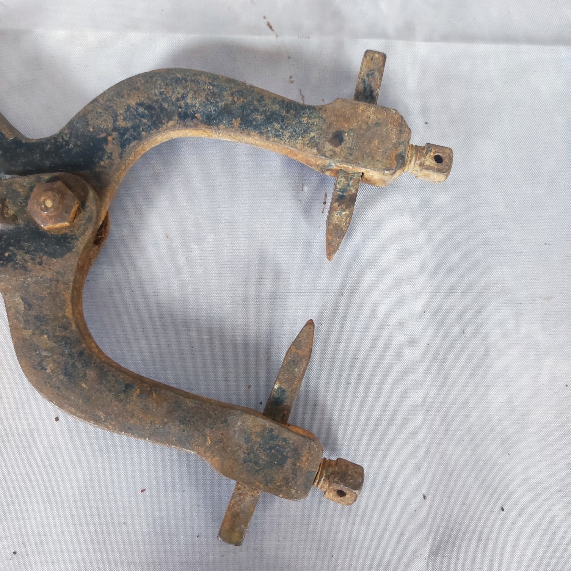 Masivní kov s krásnou patinou, čelisti funkční, pohyb pák plynulý. Hák i svorníky původní, všechno drží. Nese stopy letité práce, ale funguje stejně, jako kdysi.