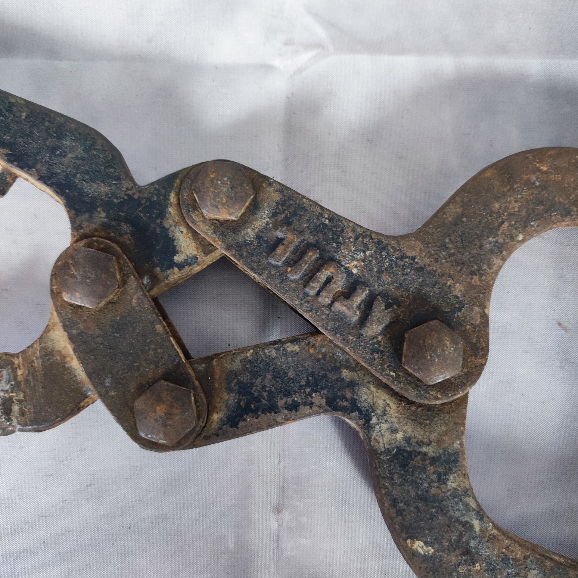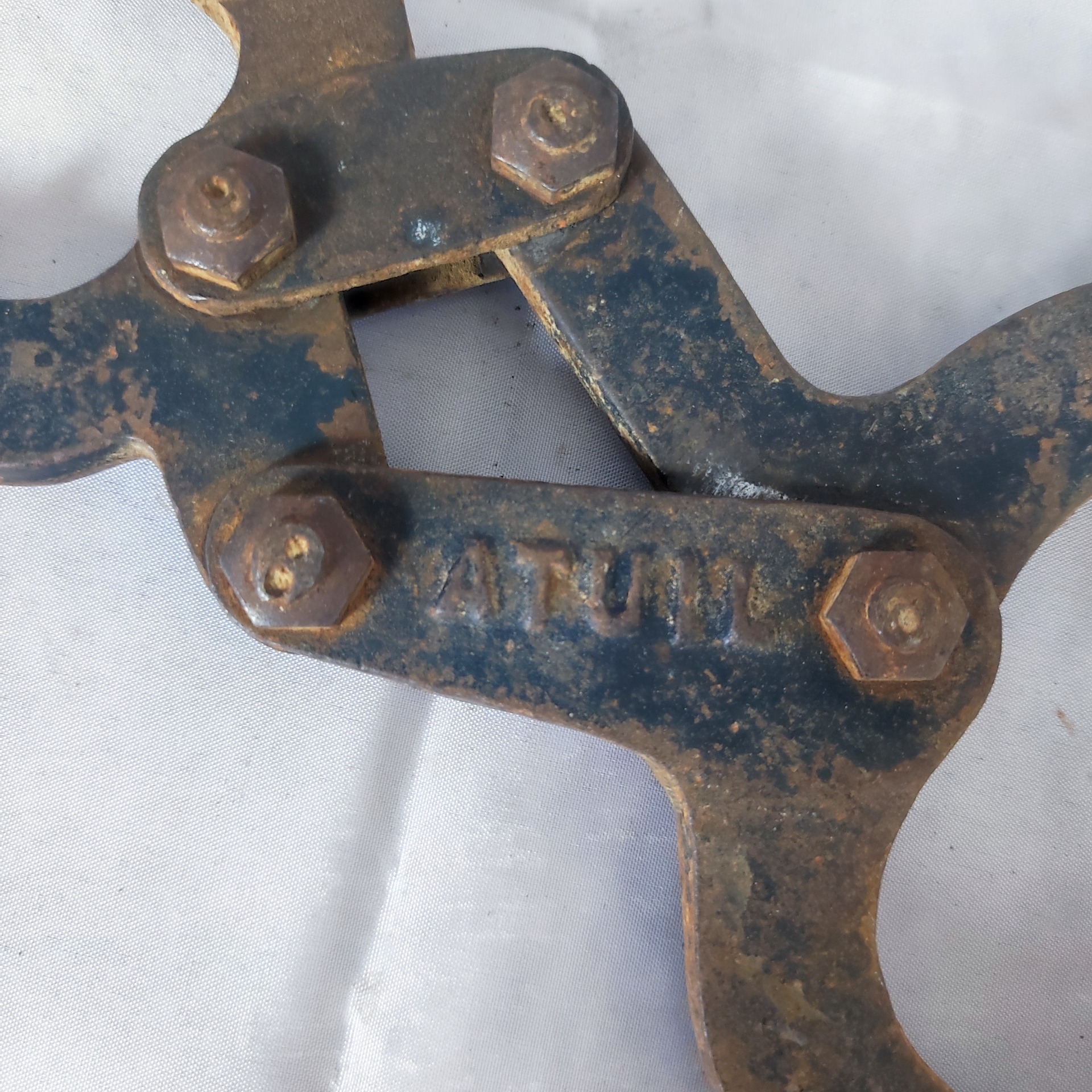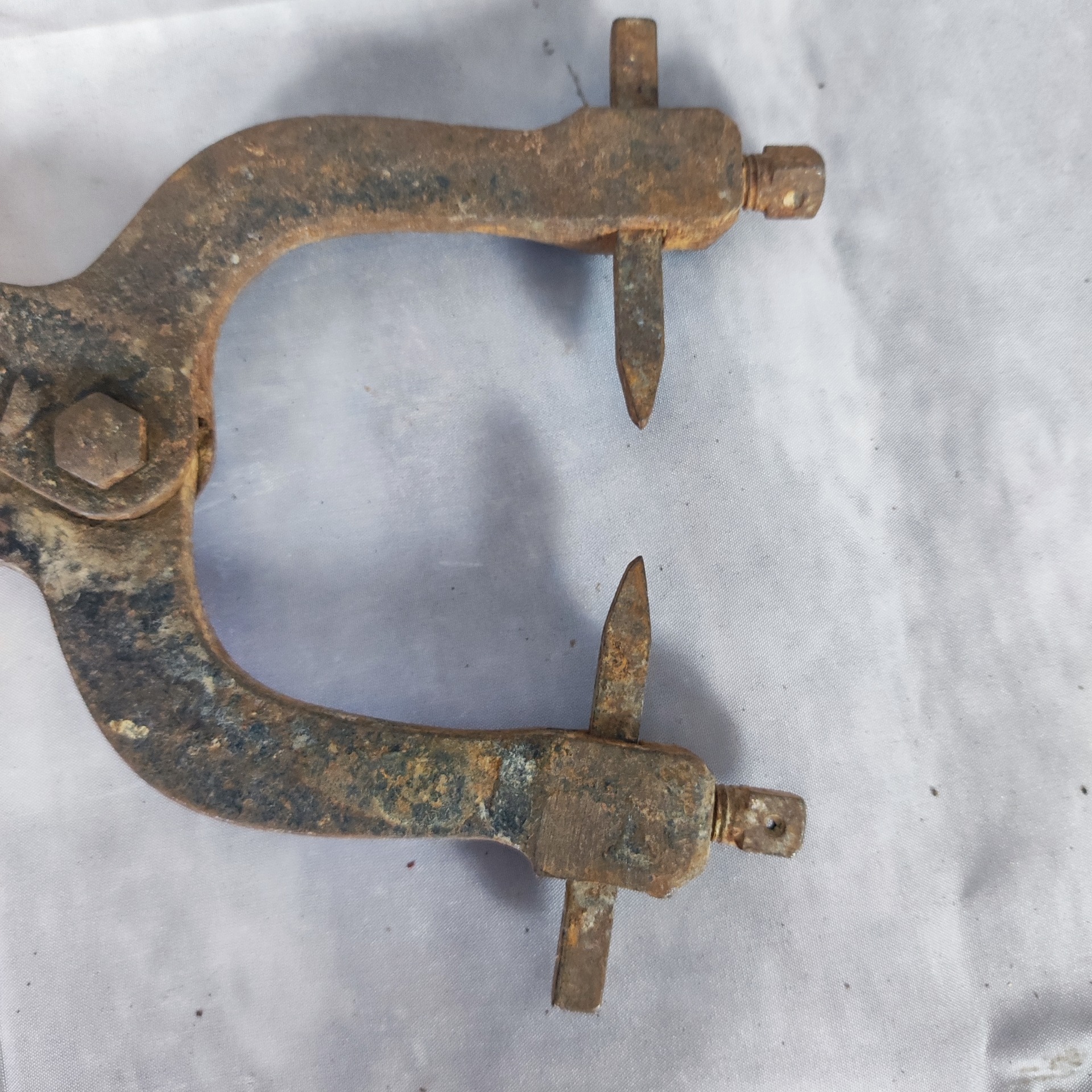Masivní kov s krásnou patinou, čelisti funkční, pohyb pák plynulý. Hák i svorníky původní, všechno drží. Nese stopy letité práce, ale funguje stejně, jako kdysi.