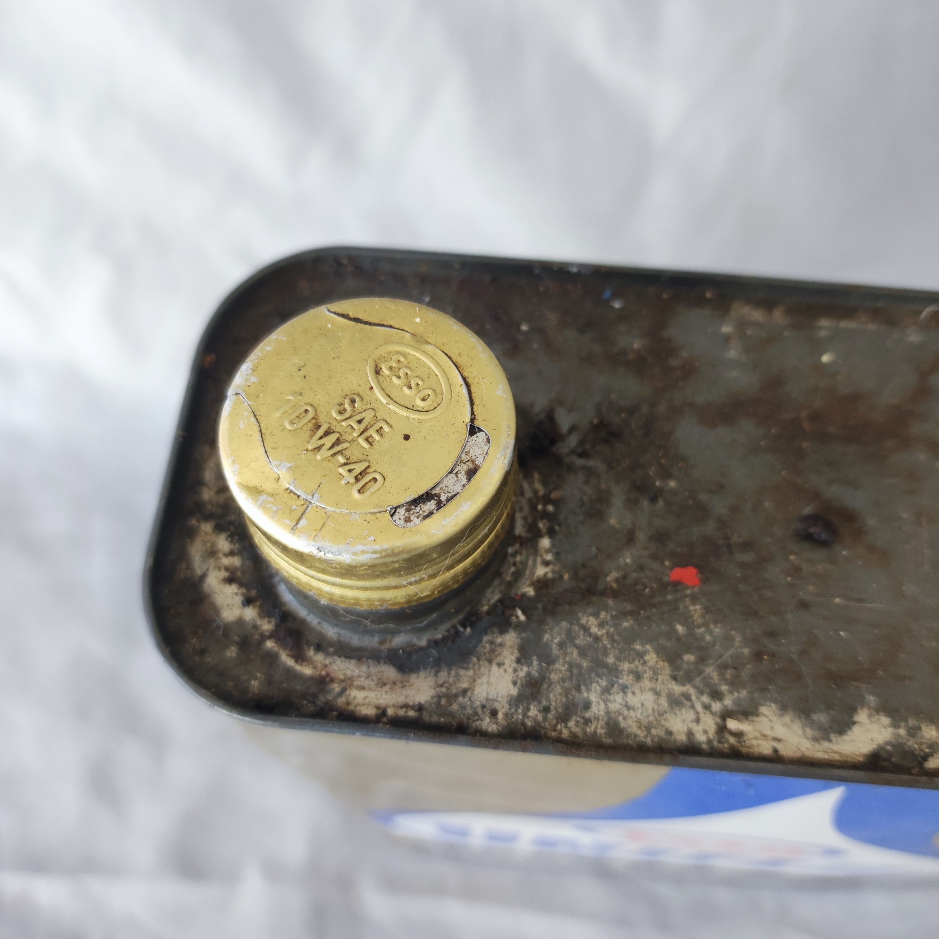 Víčko je mosazné, plech má patinu, a i když už dávno nevoní po motorovém oleji, pořád z ní sálá ta doba – vůně garáží, benzínu a nedělních jízd po venkově.