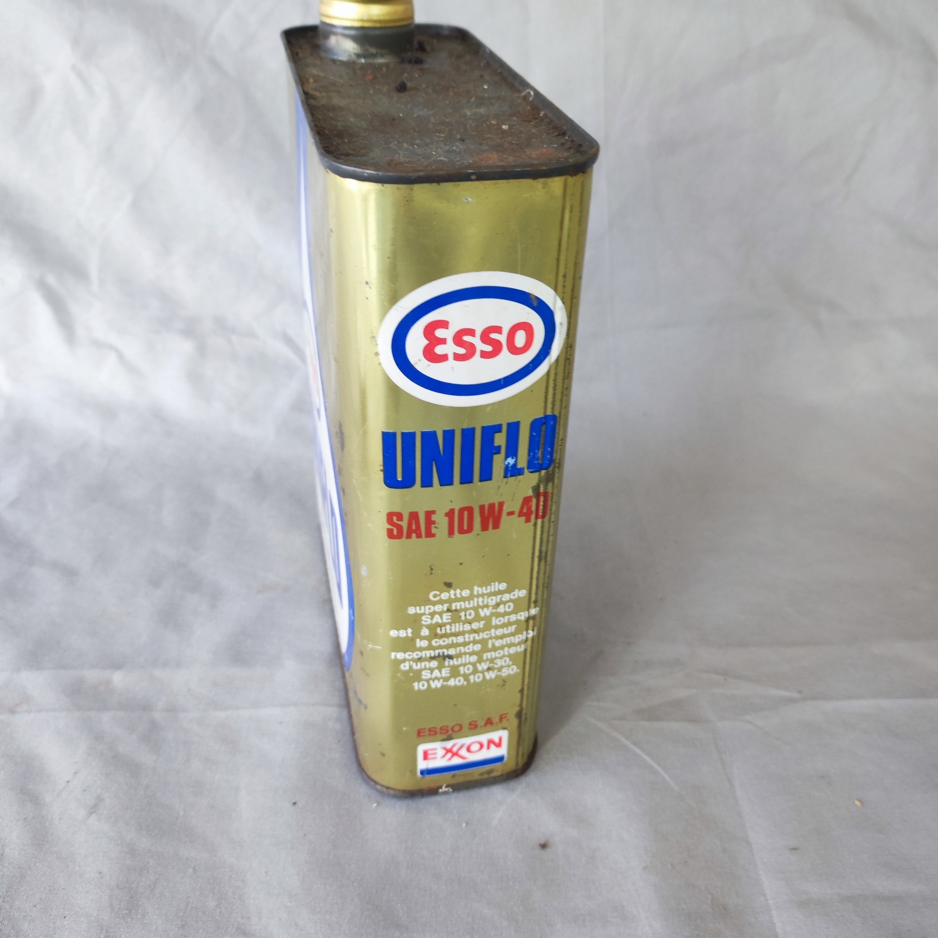 Originální kovová plechovka Esso Uniflo SAE 10W-40, Francie / Evropa, 70. léta. Objem 2 l. Plech s patinou, původní víčko, zachovalá grafika. Autentický kus do sbírky nebo jako industriální dekor.