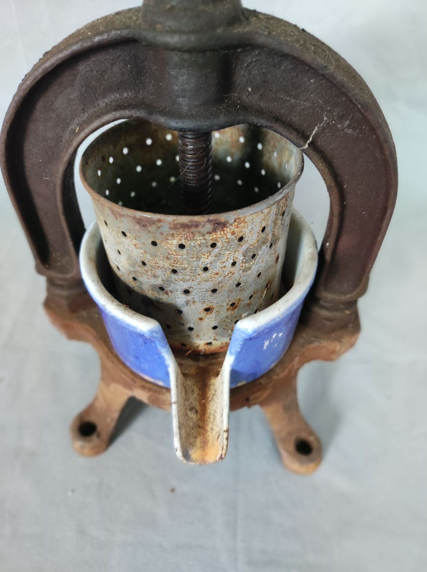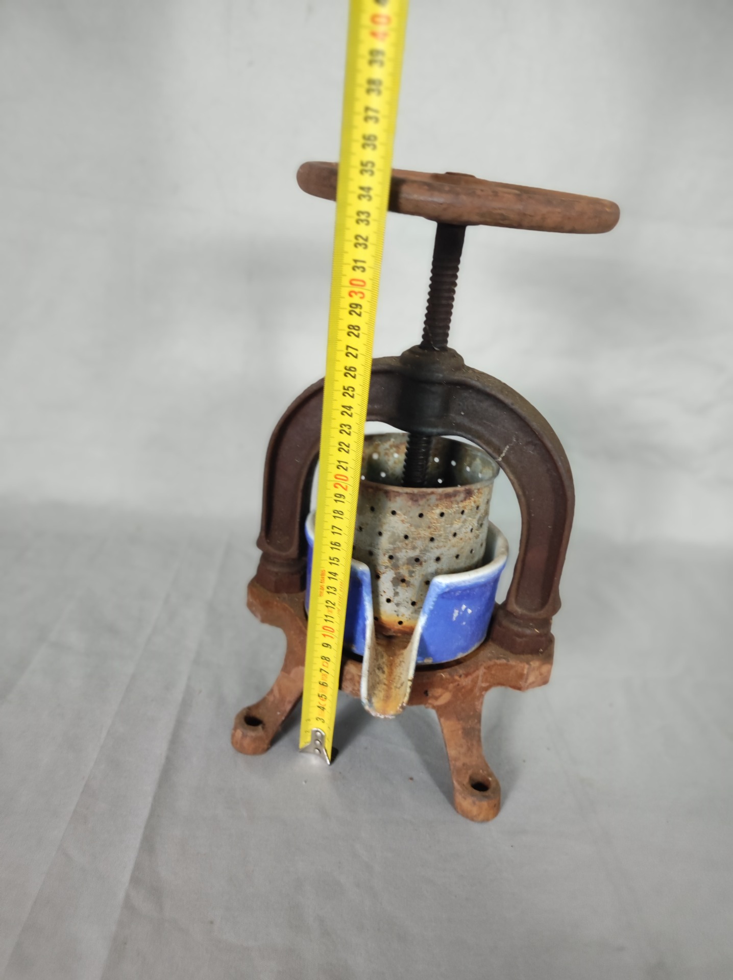 Litý kovový lis s funkčním šroubem, perforovaná kovová vložka a litinová miska s výlevkou. Povrch s výraznou patinou a stopami stáří odpovídajícími dlouhodobému používání. Bez zásadních prasklin nebo destrukcí, celek je stabilní a mechanicky funkční. Rozměry jsou viditelné na fotografiích s metrem.