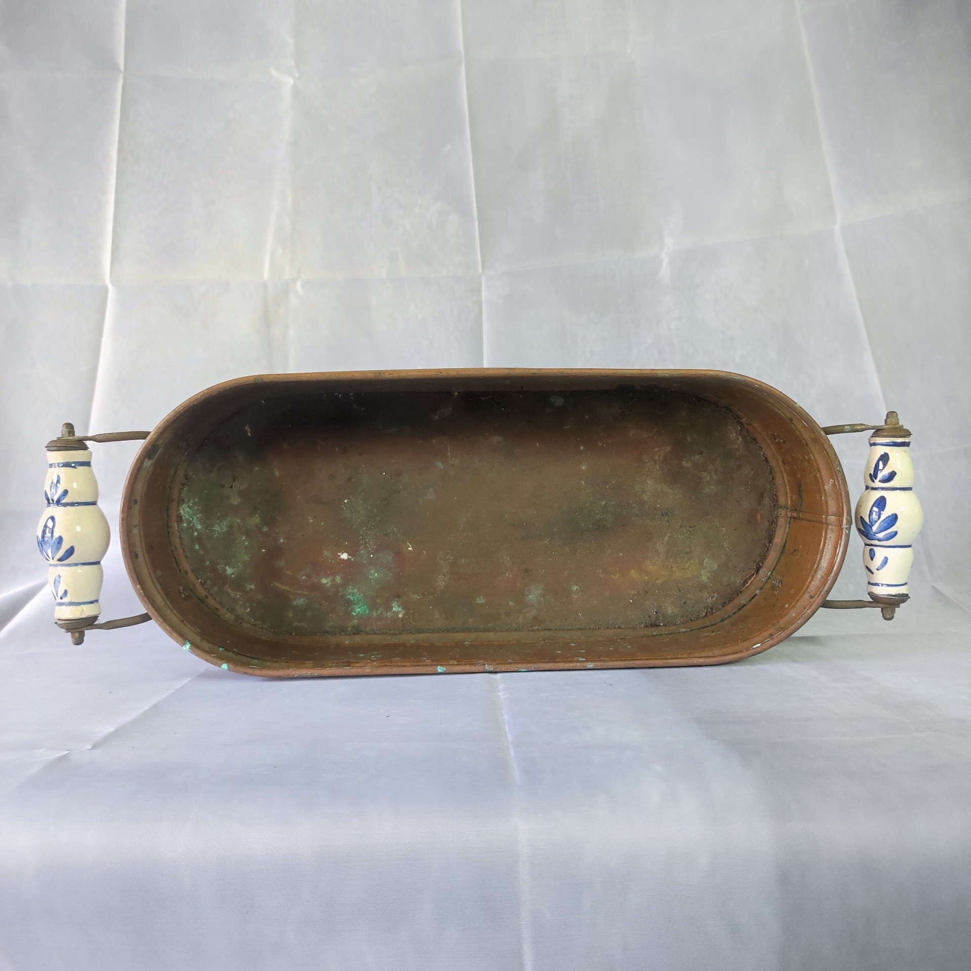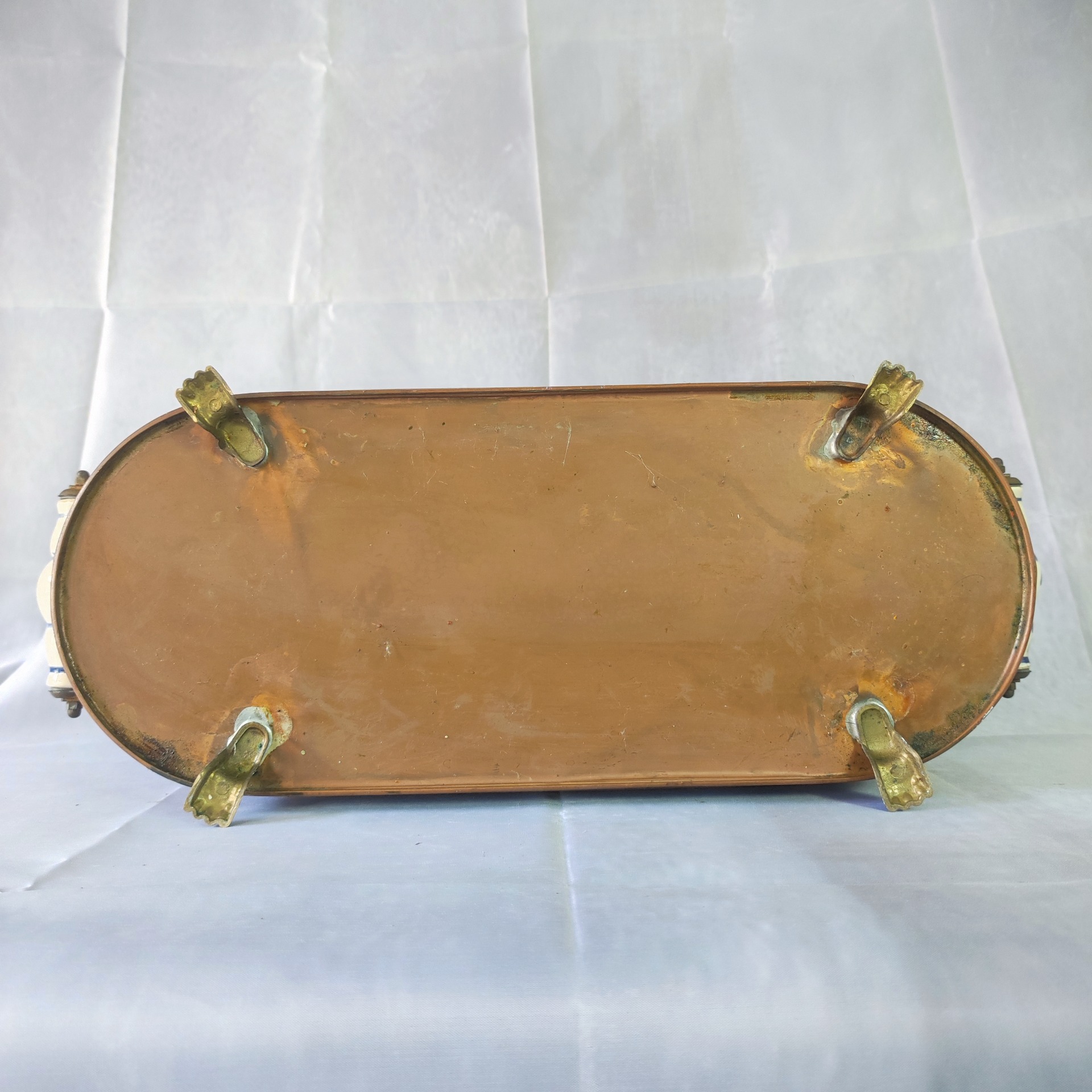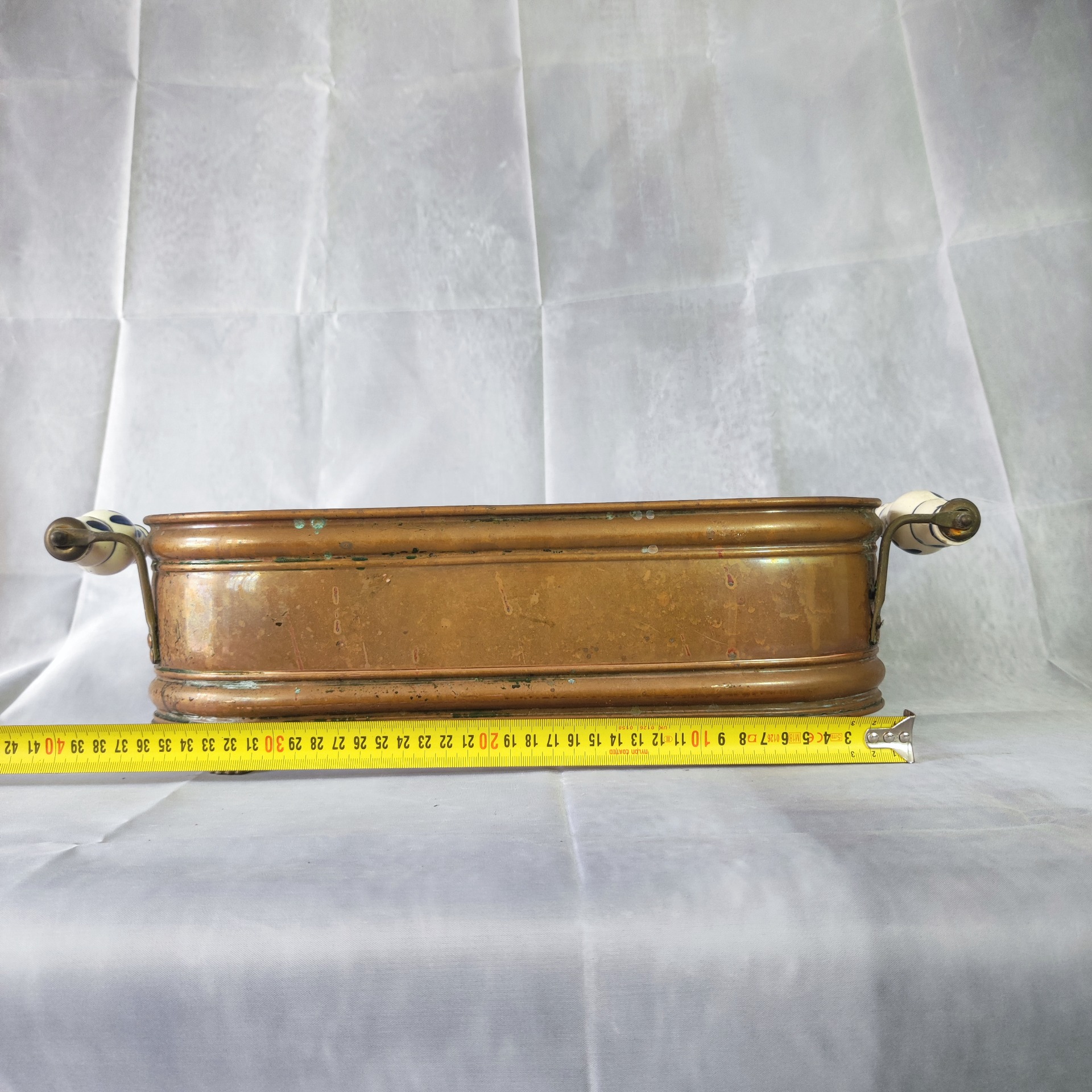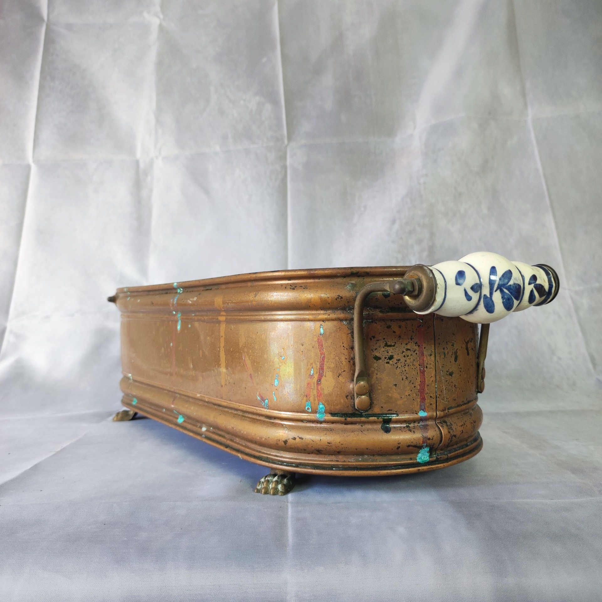 Rok výroby kolem 1900, poctivý řemeslný kus — měď, mosaz, porcelán, všechno poctivé a krásně zestárlé.