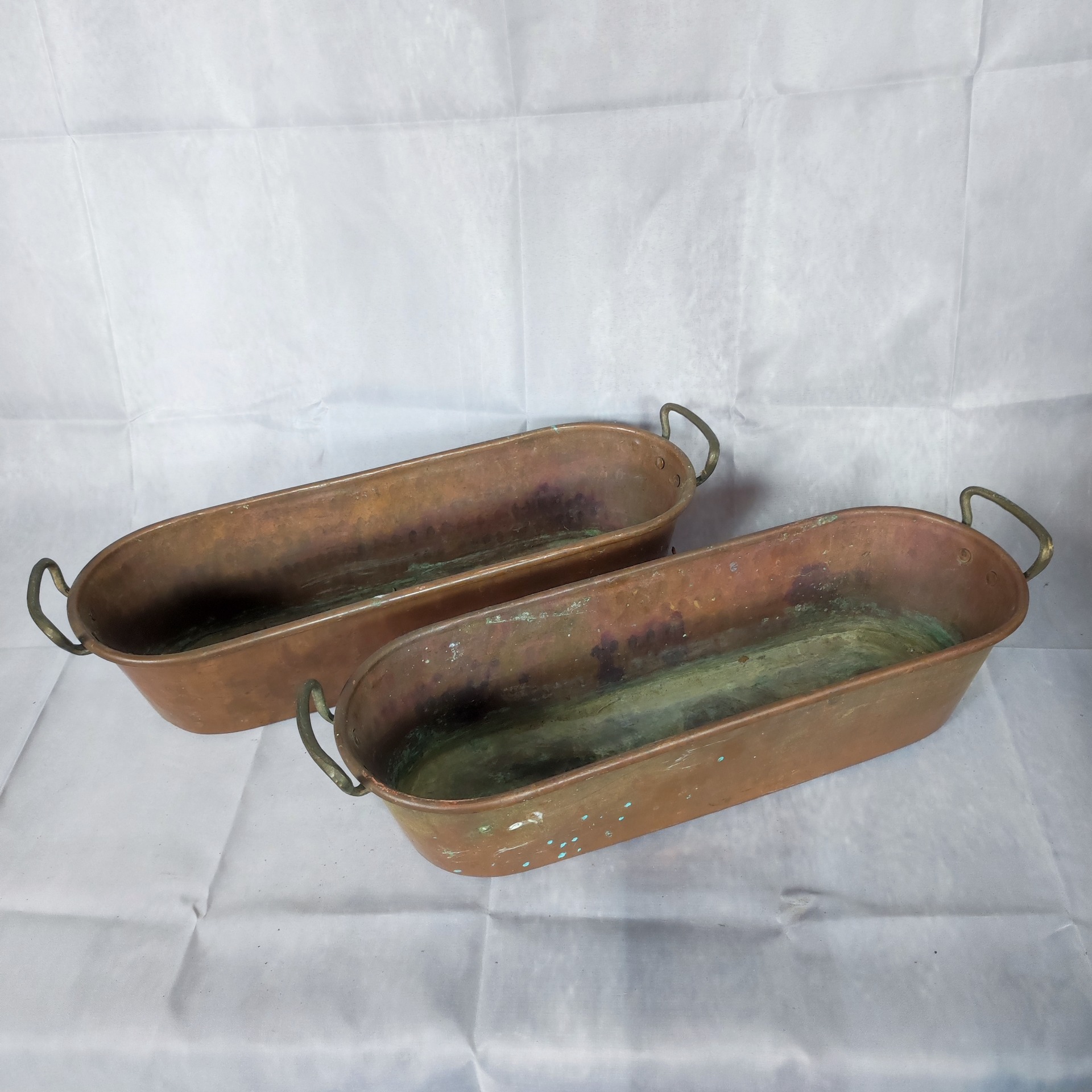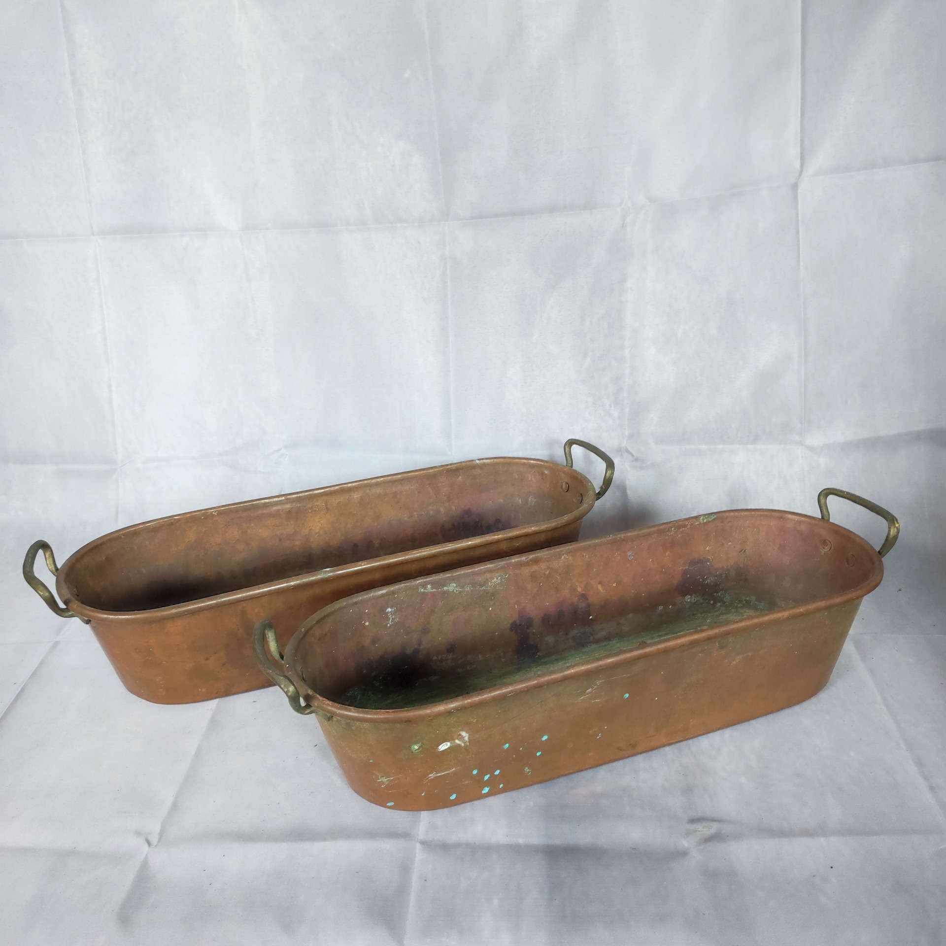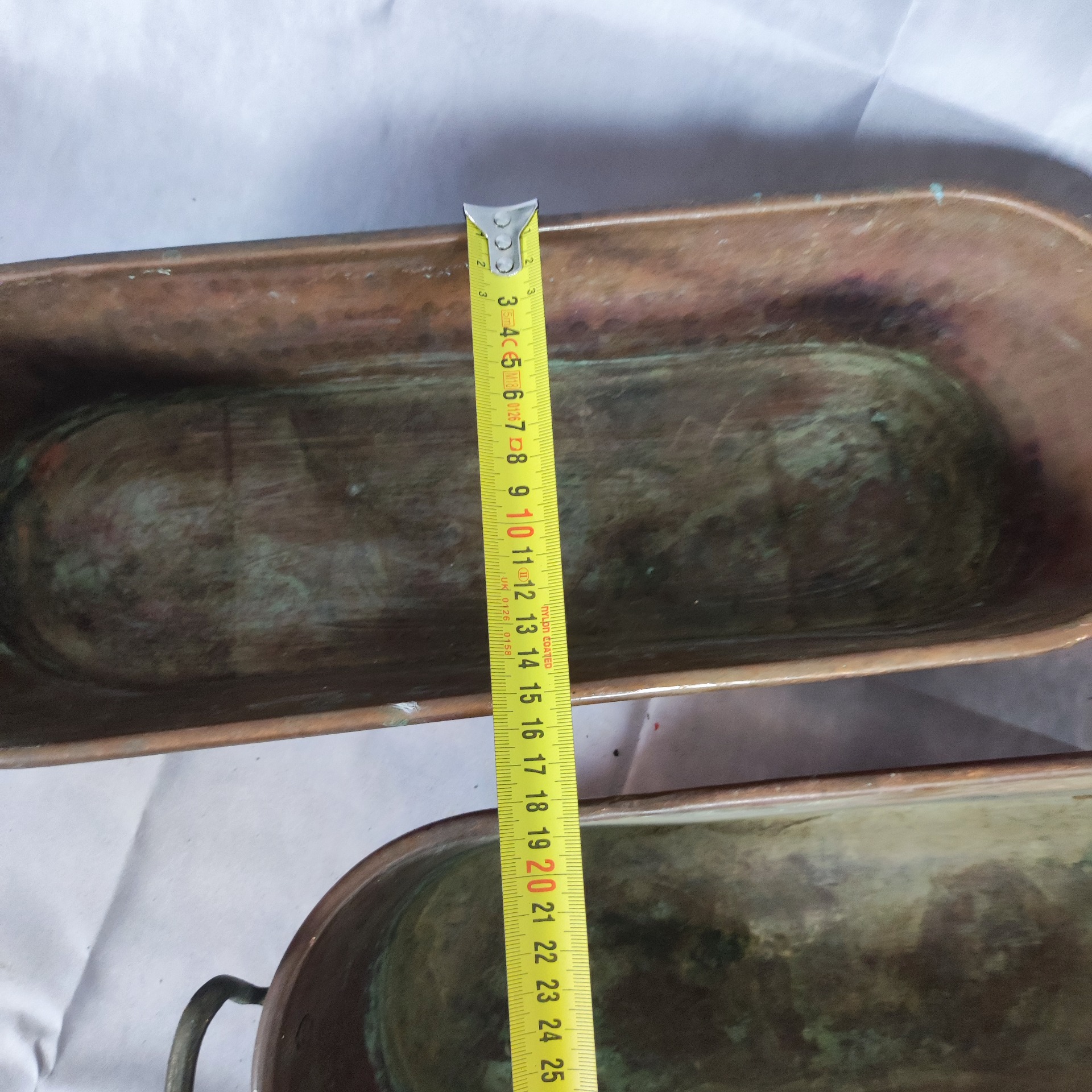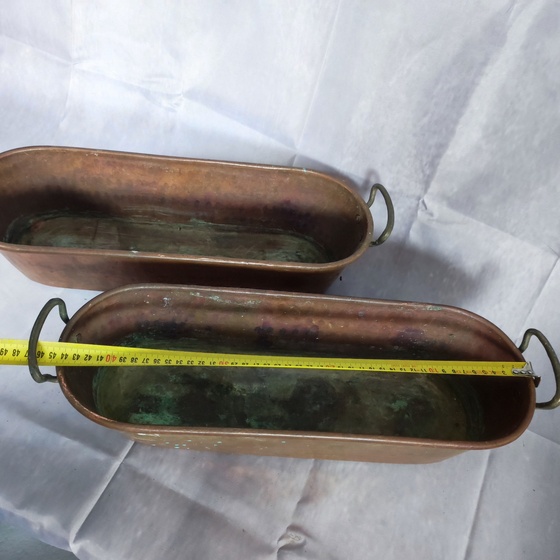 Dvě měděné nádoby s mosaznými úchyty, pevné, bez prasklin, s přirozenou patinou a drobnými stopami používání. Původní nýtování, žádné repliky. Ideální pro rustikální interiér, kuchyň nebo zahradu s duší.