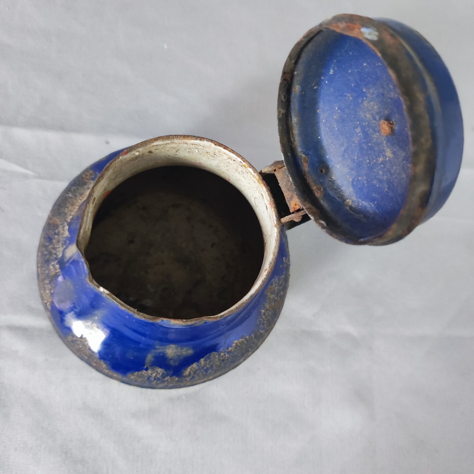 Použitá, původní stav, smalt místy opadaný, drobná koroze po obvodu, víčko drží na původním pantu. Na dekoraci ideální, autentická patina severofrancouzských kuchyní.