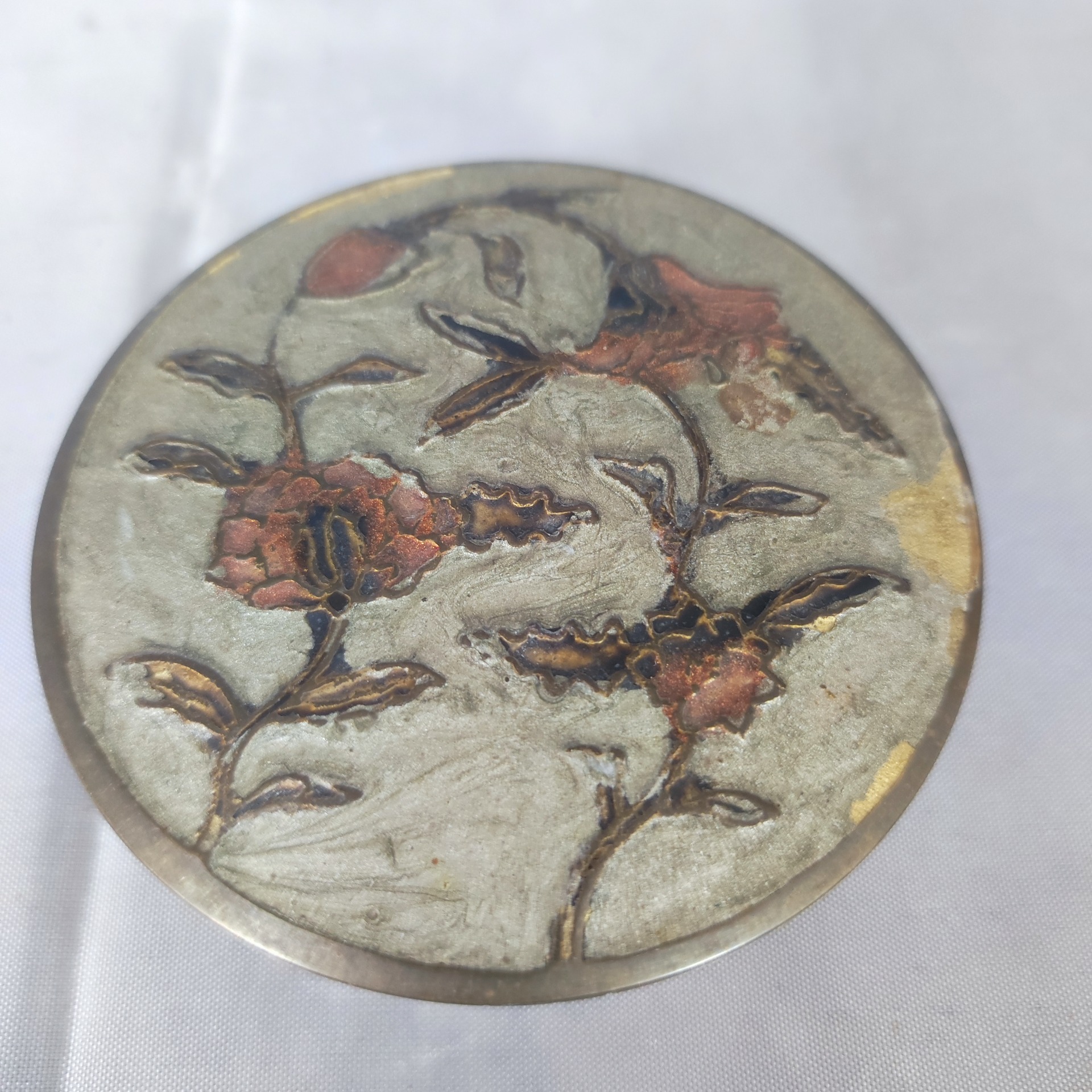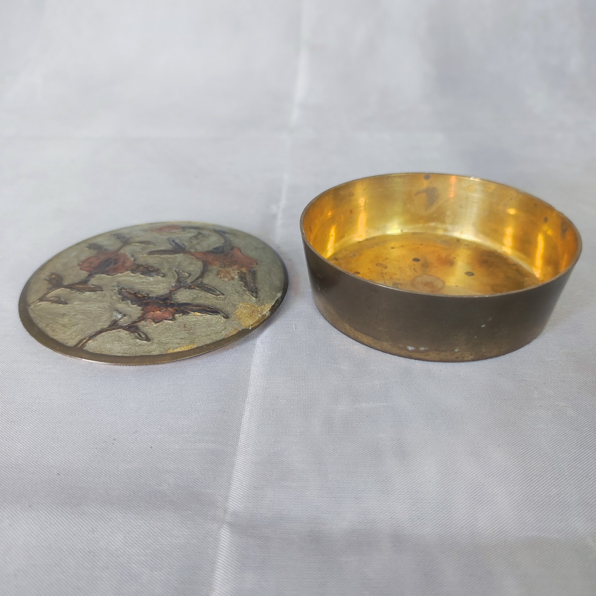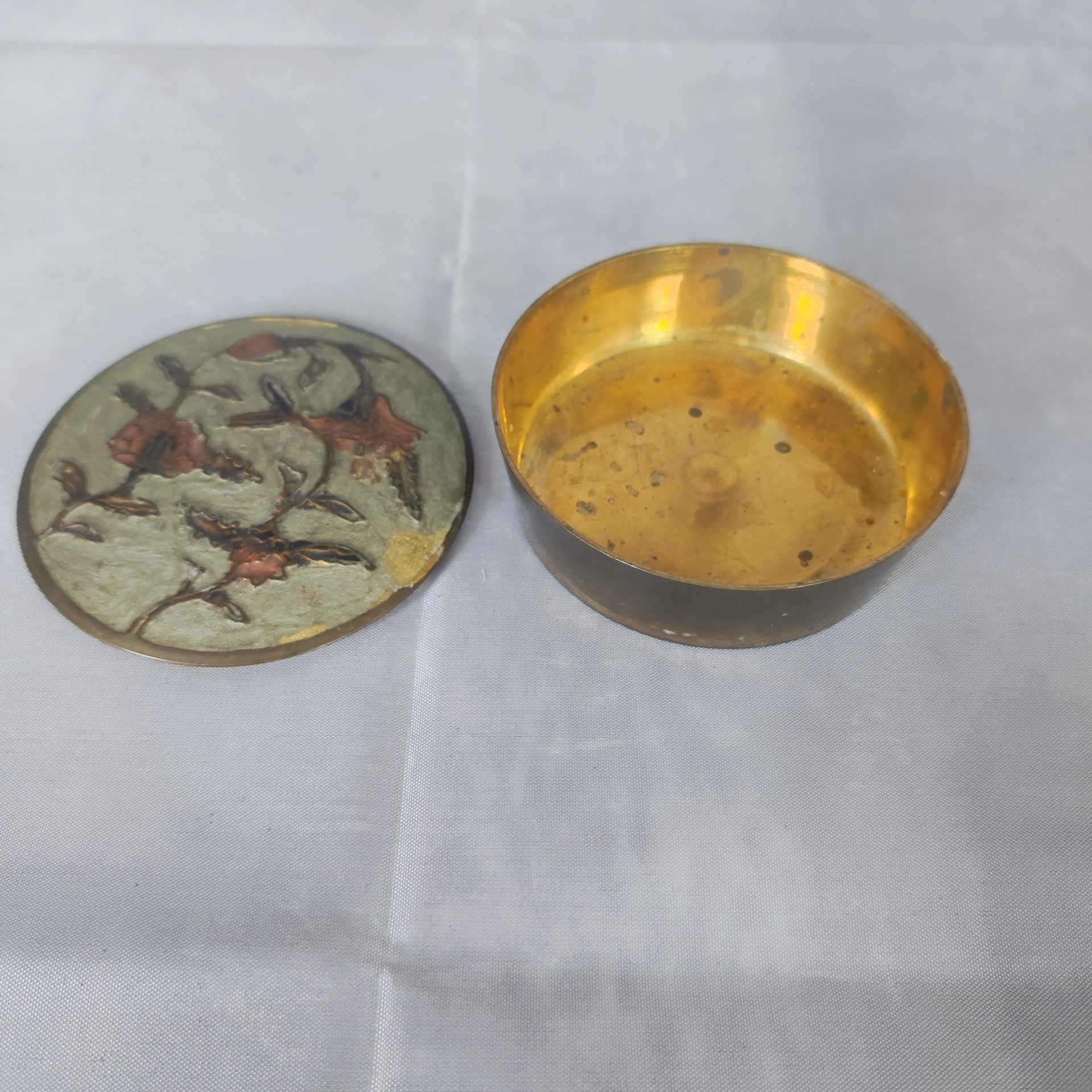Mosazné tělo s původní patinou, víko pevné a dobře sedí. Vnitřek čistý, místy drobné skvrny po používání, povrch s krásně přirozeným tónem.