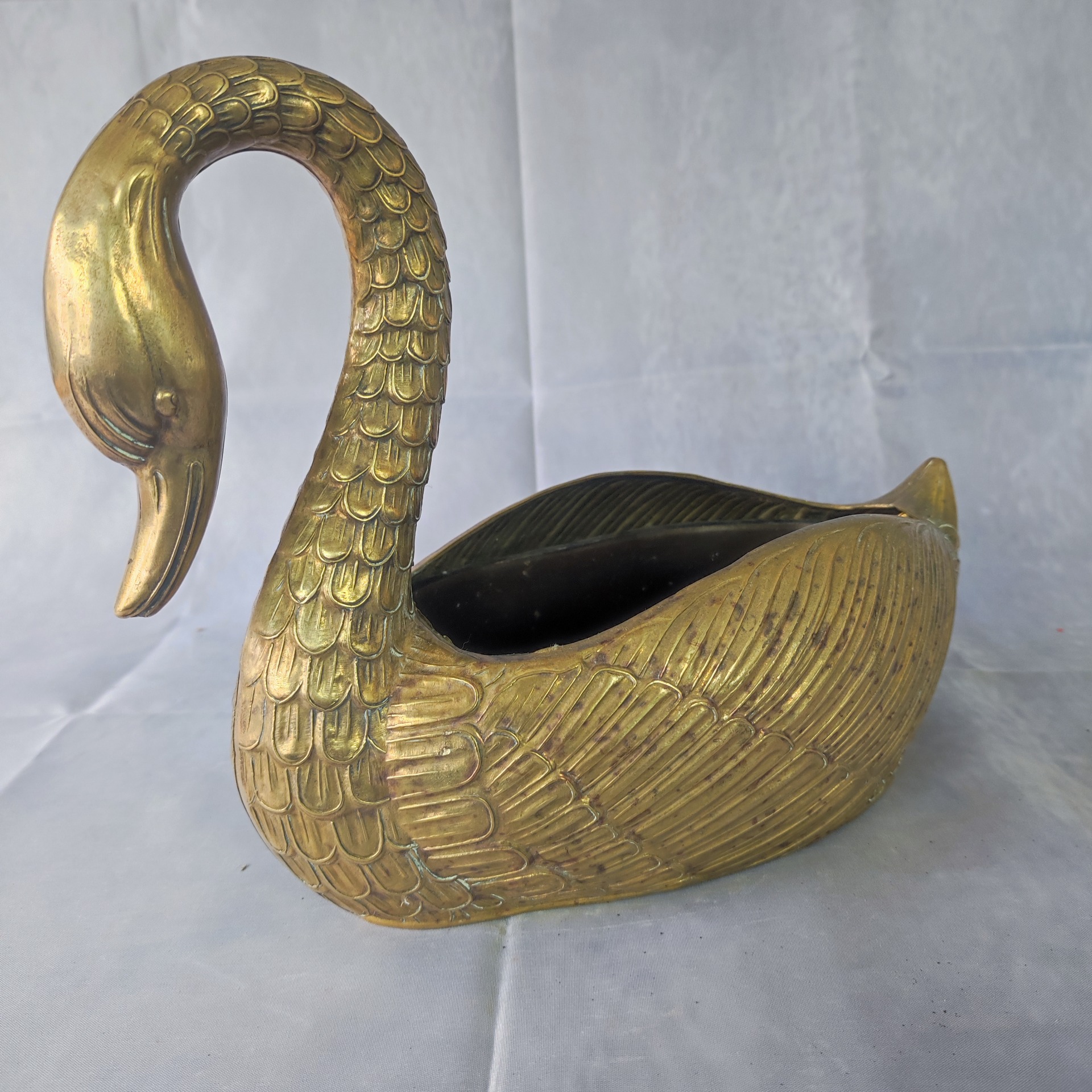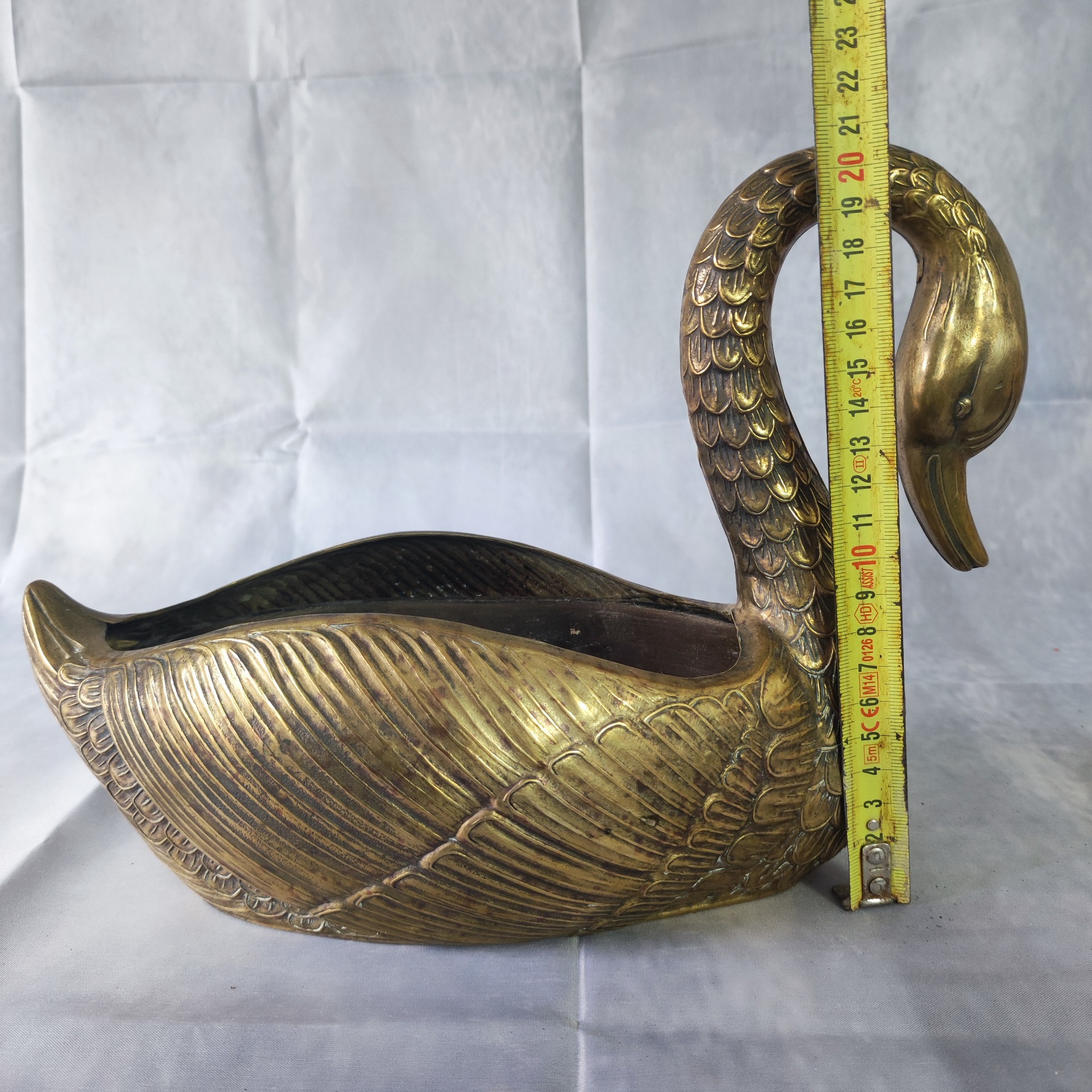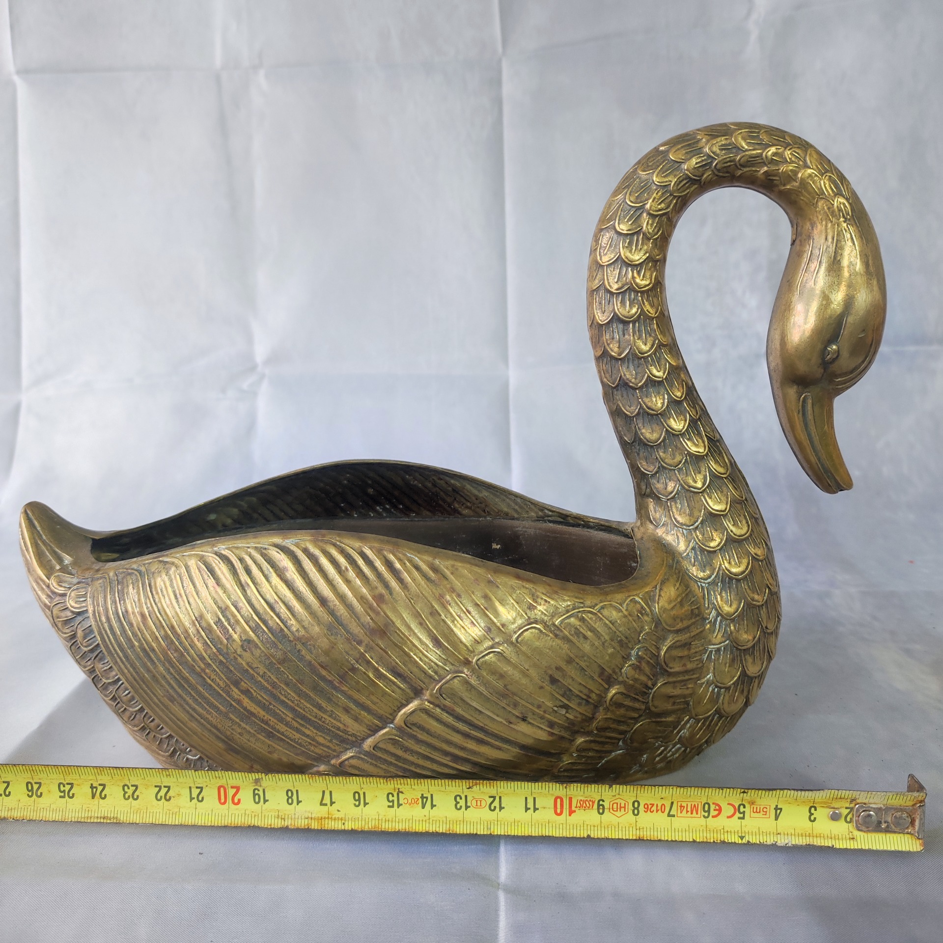 Mosazný květináč ve tvaru labutě, původní plastová vložka, Belgie, přibližně 60.–70. léta. Lehká patina, nečištěno, autentický stav nálezu – nalezeno u staré madam mezi oblečením a šátky.
