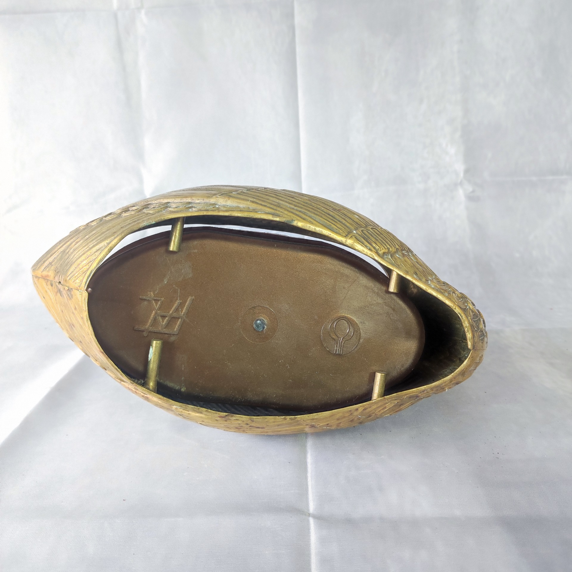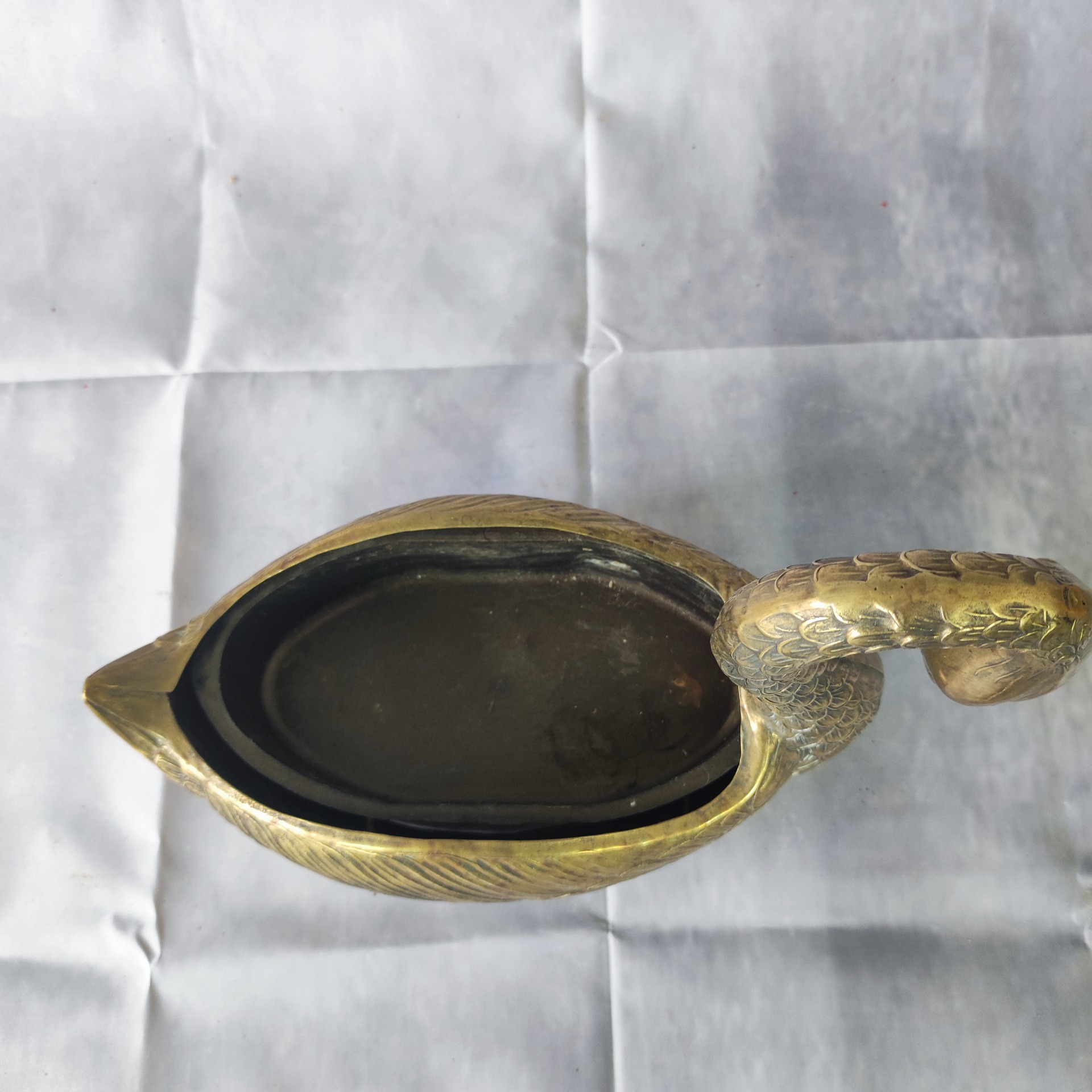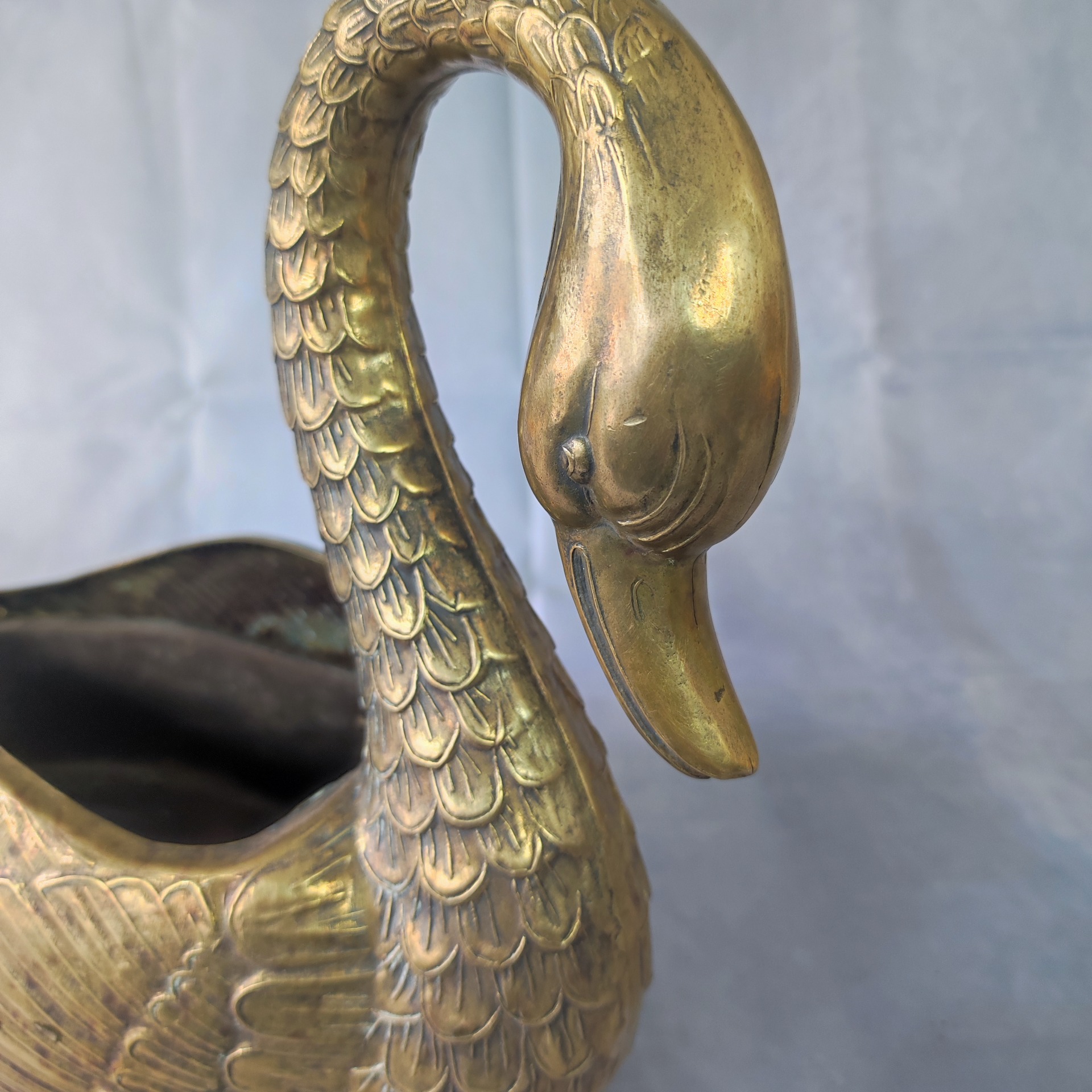 Mosazný květináč ve tvaru labutě, původní plastová vložka, Belgie, přibližně 60.–70. léta. Lehká patina, nečištěno, autentický stav nálezu – nalezeno u staré madam mezi oblečením a šátky.