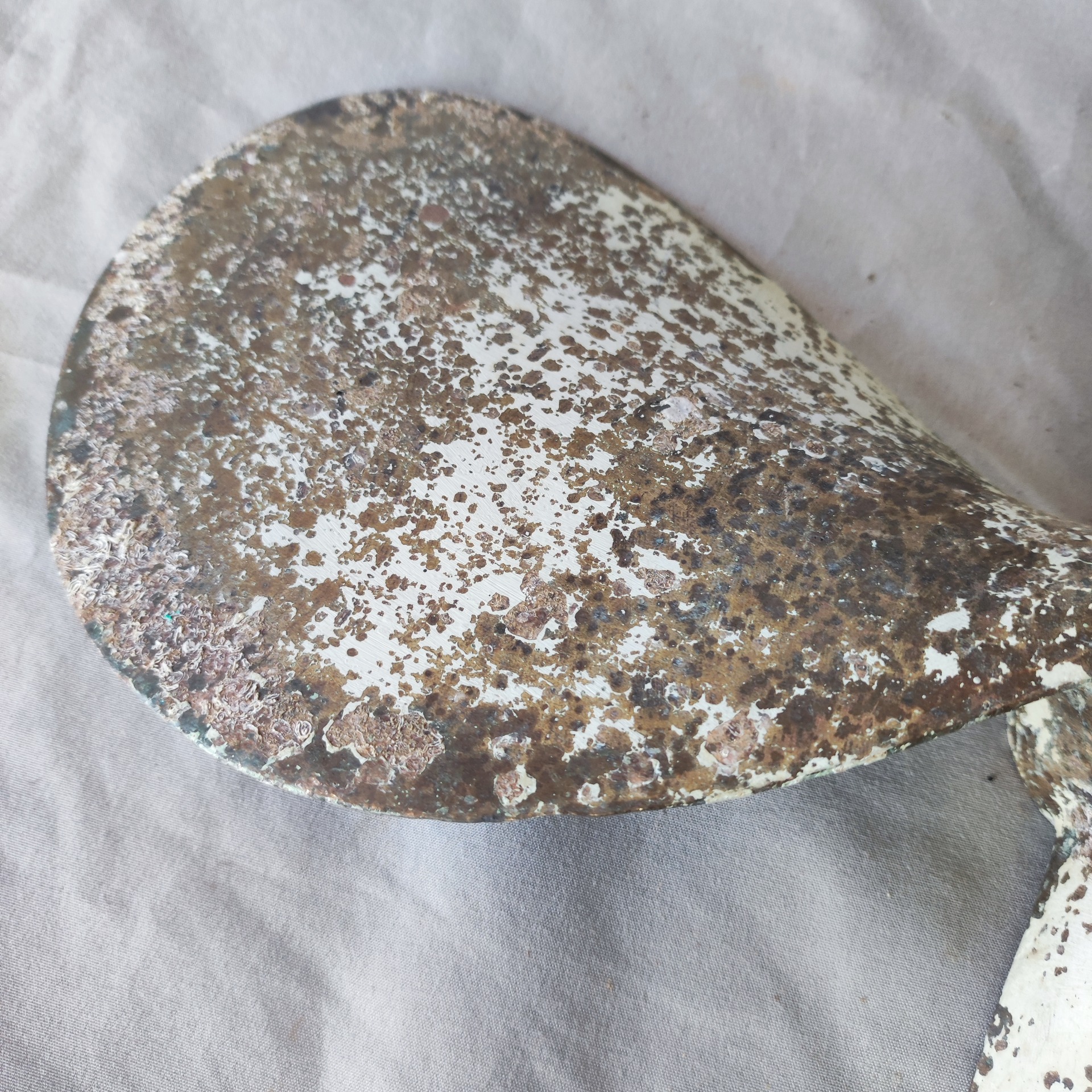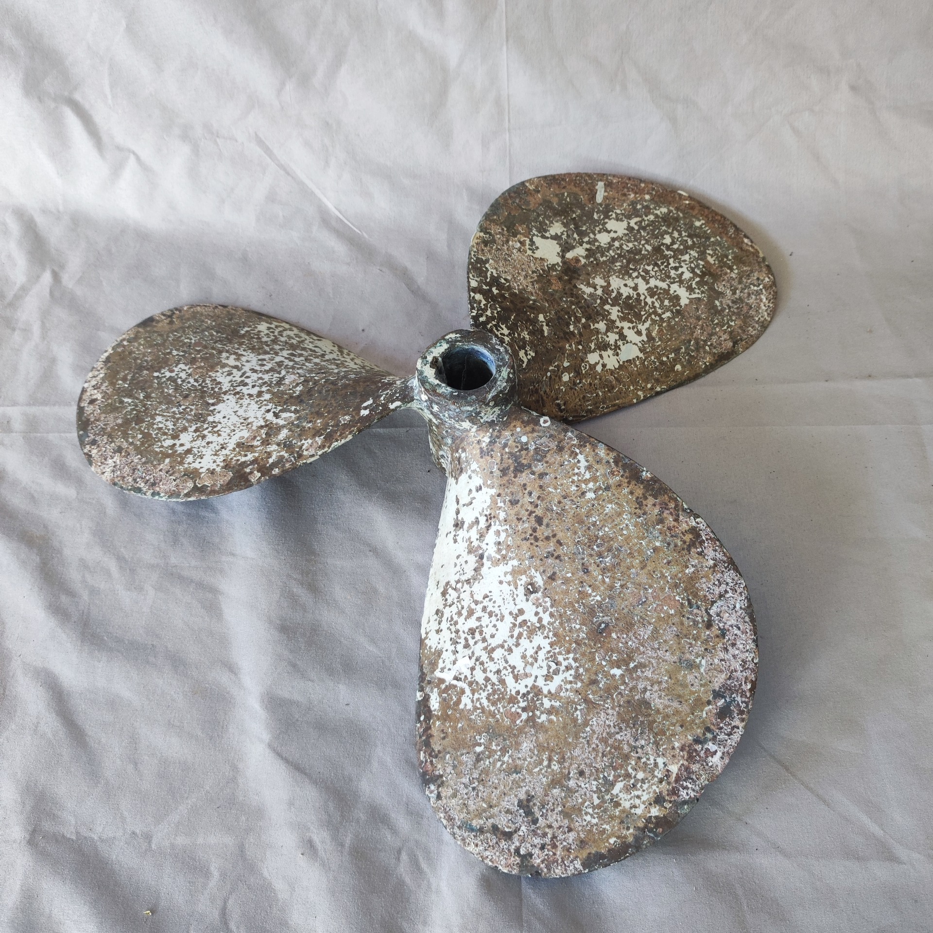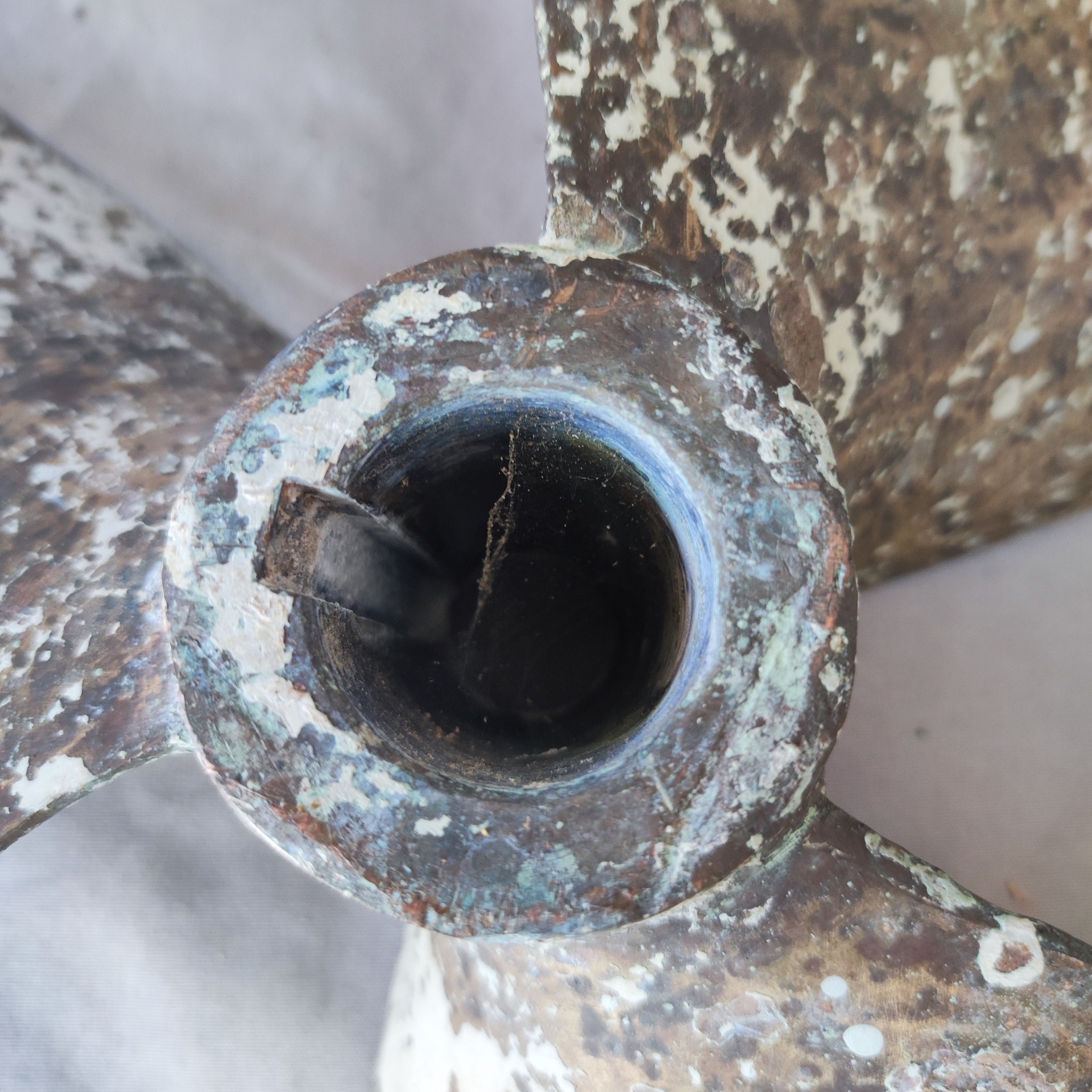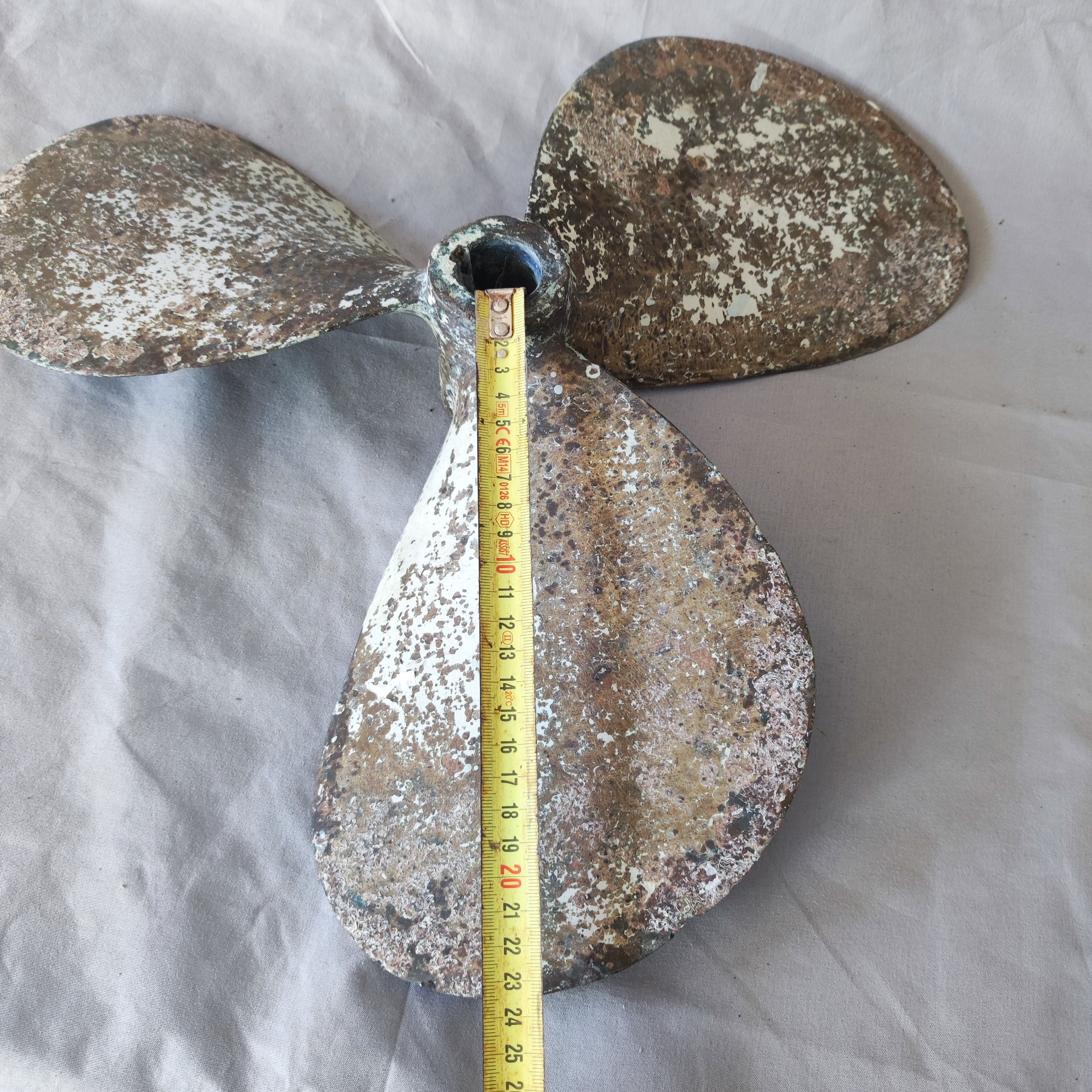 Mosazná třílistá vrtule, průměr cca 36 cm, zachovalá v původním stavu s autentickou patinou po dlouhém pobytu ve slané vodě.