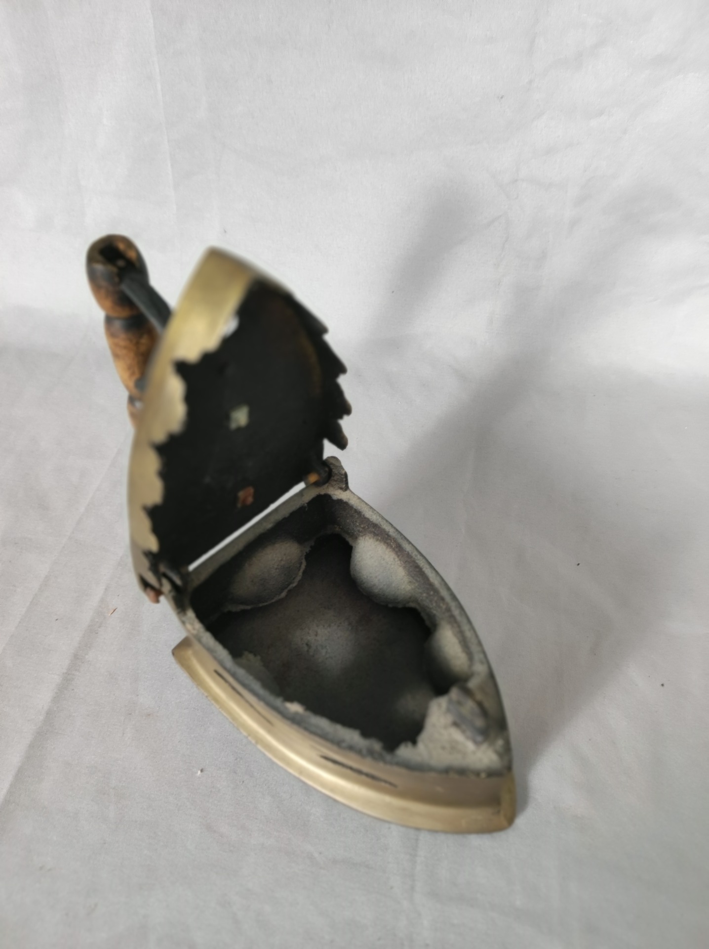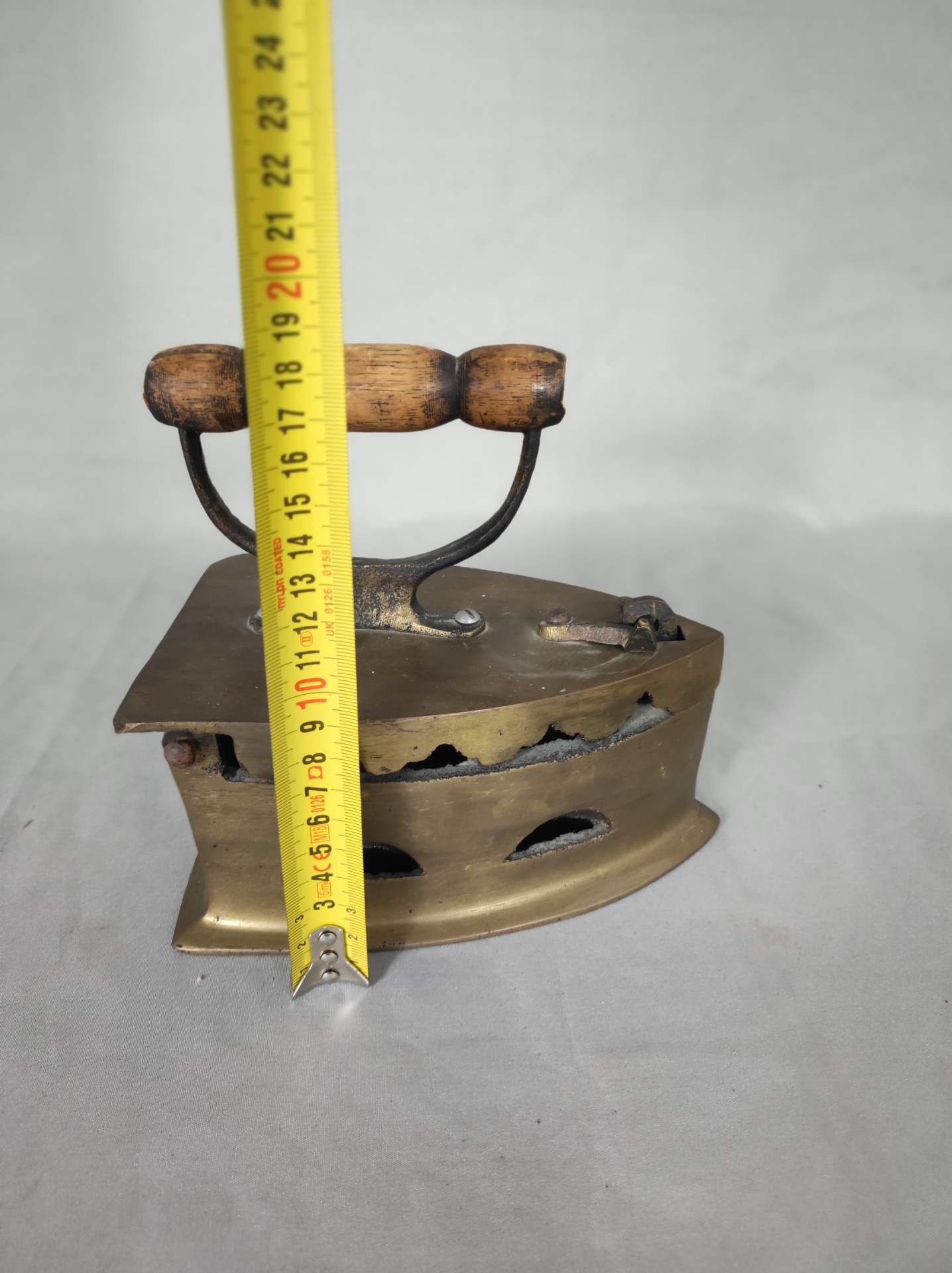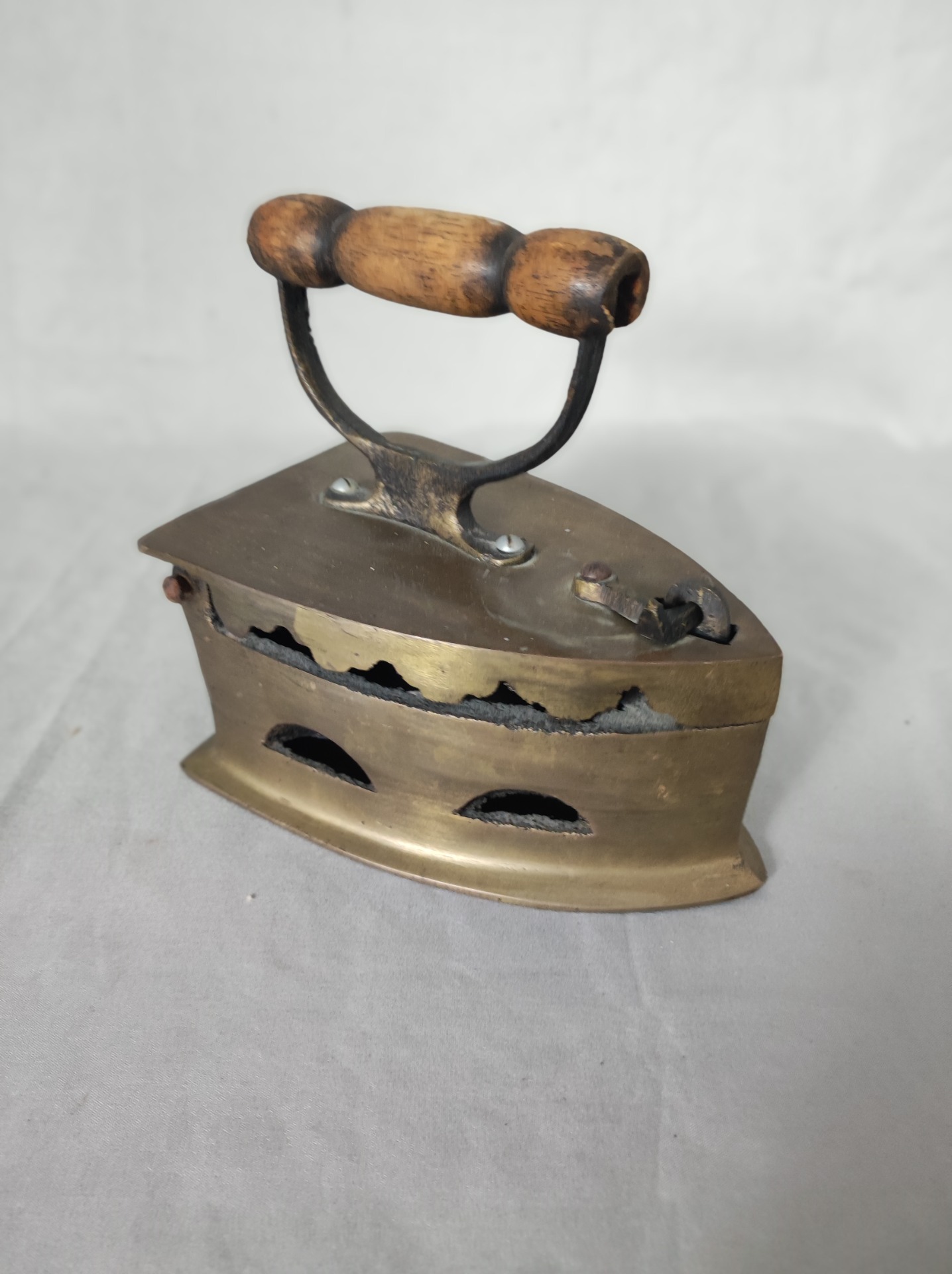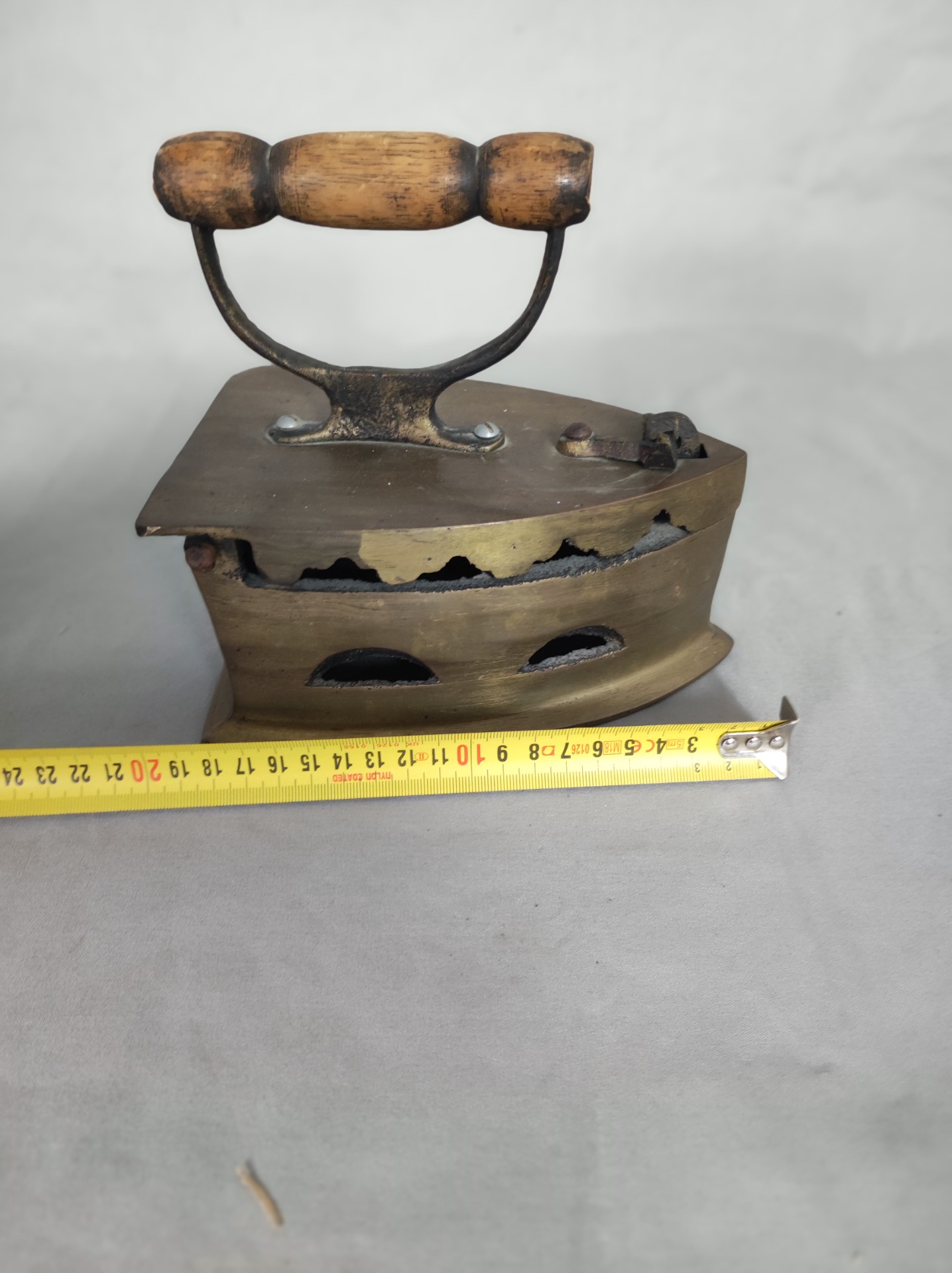 Tohle není žehlička z koupelny. Patří do kuchyně, do prádelny, do času, kdy se prádlo žehlilo nad uhlím a teplo se hlídalo citem, ne kolečkem s čísly. Mosazné tělo, odvětrávací otvory po stranách a masivní konstrukce dávají jasně najevo, že šlo o nástroj každodenní práce.