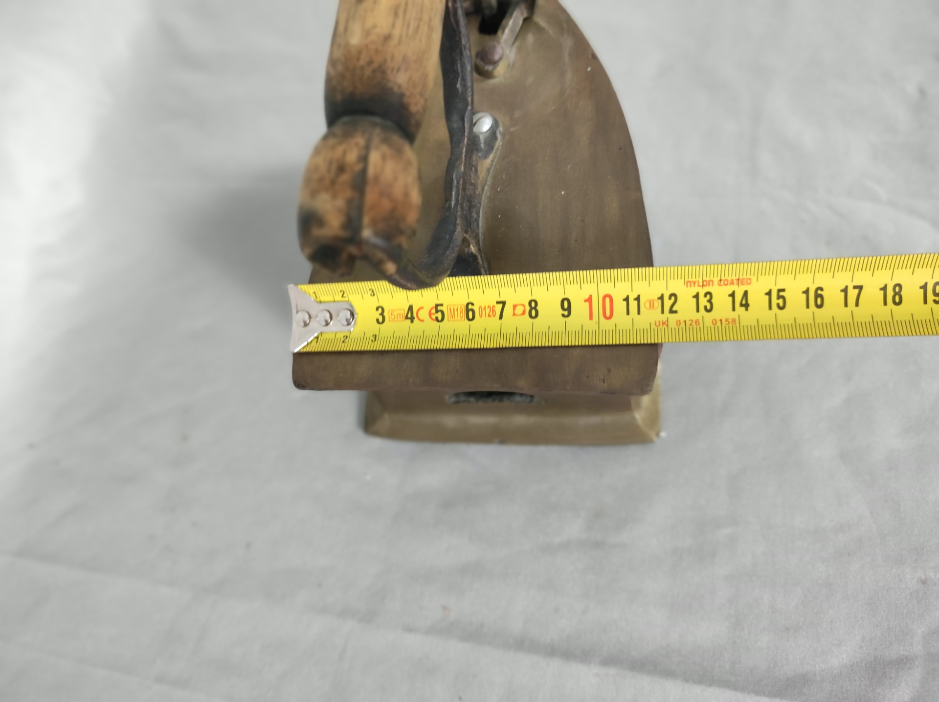 Mosazná žehlička na uhlí s původním dřevěným madlem. Povrch s výraznou patinou a stopami stáří, odpovídající dlouhodobému používání. Konstrukce kompletní, víko funkční, celek stabilní. Rozměry jsou patrné z fotografií.