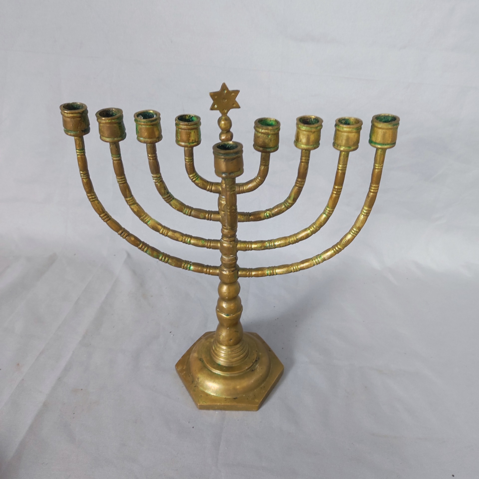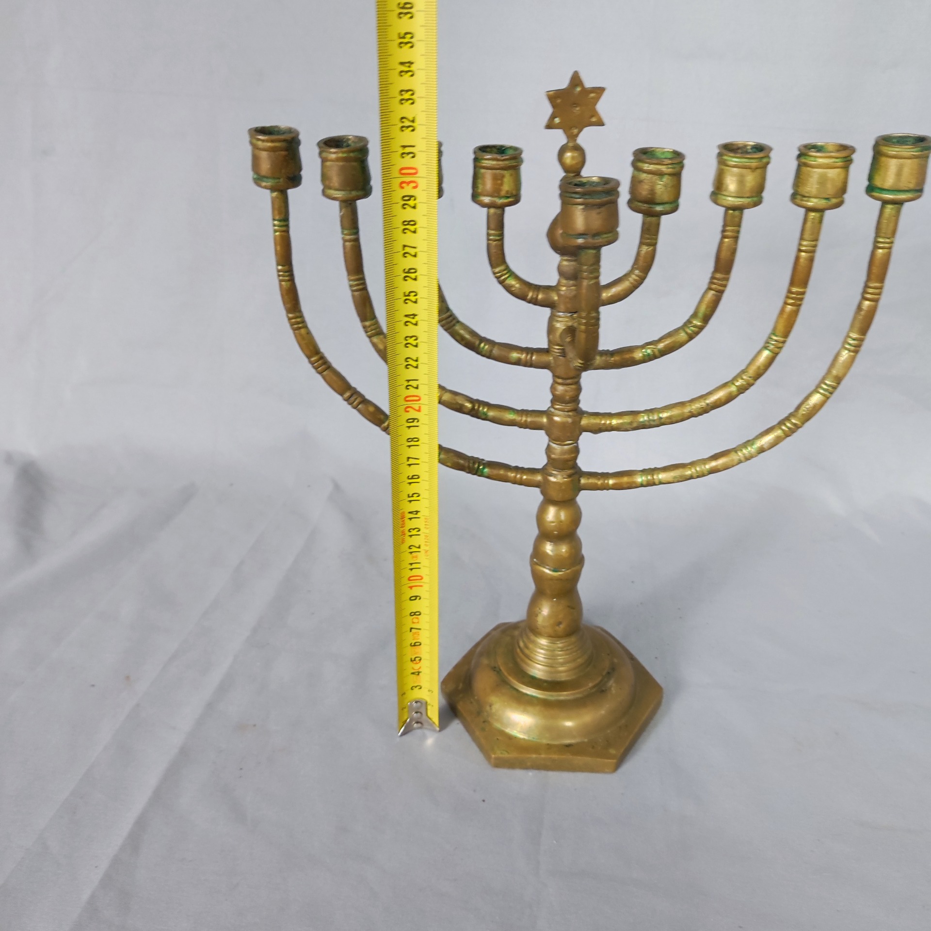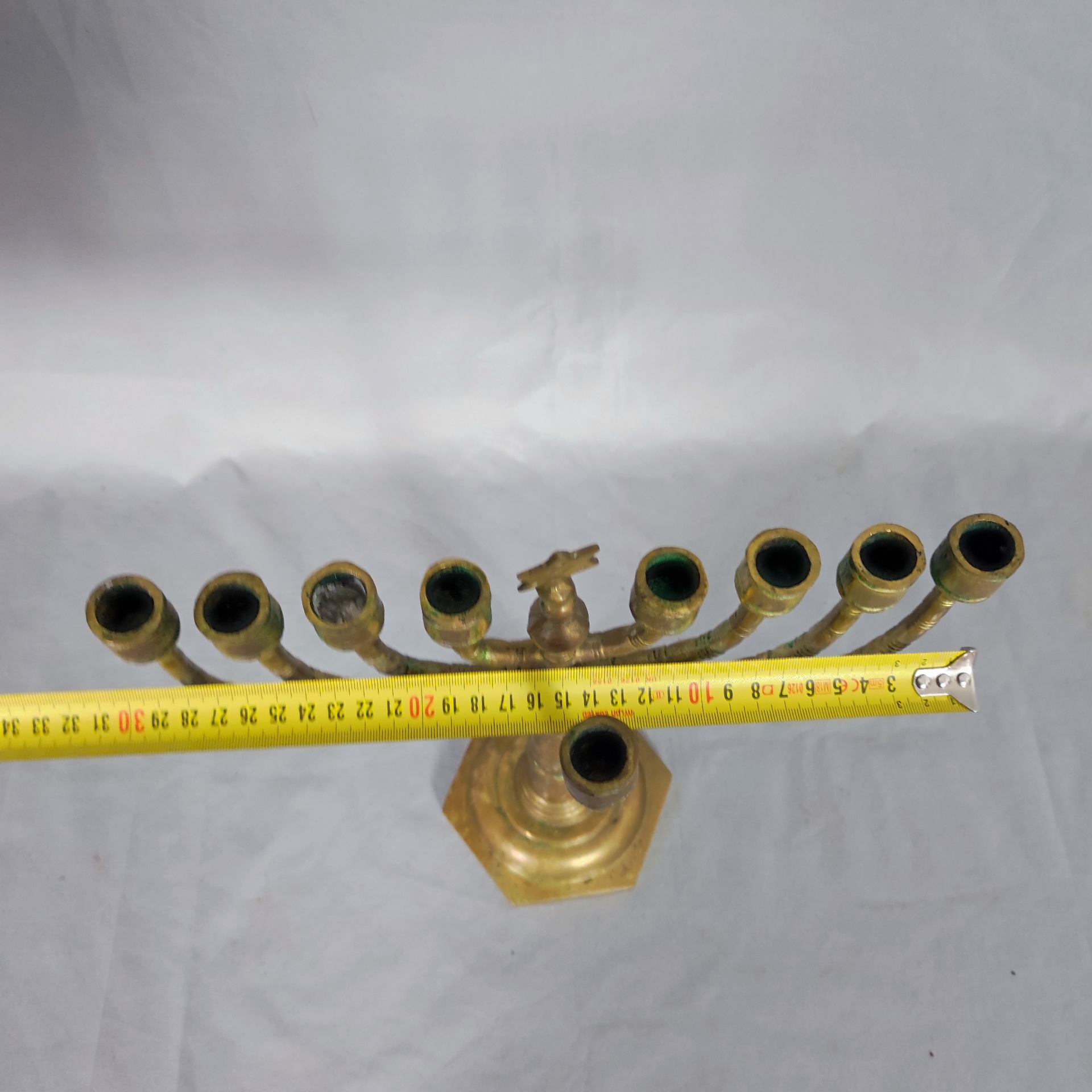 Mosazný svícen s přirozenou patinou, místy zelené stopy oxidace. Konstrukce pevná, všechny držáky svící zachované. Bez zásahů, bez leštění – původní stav.
