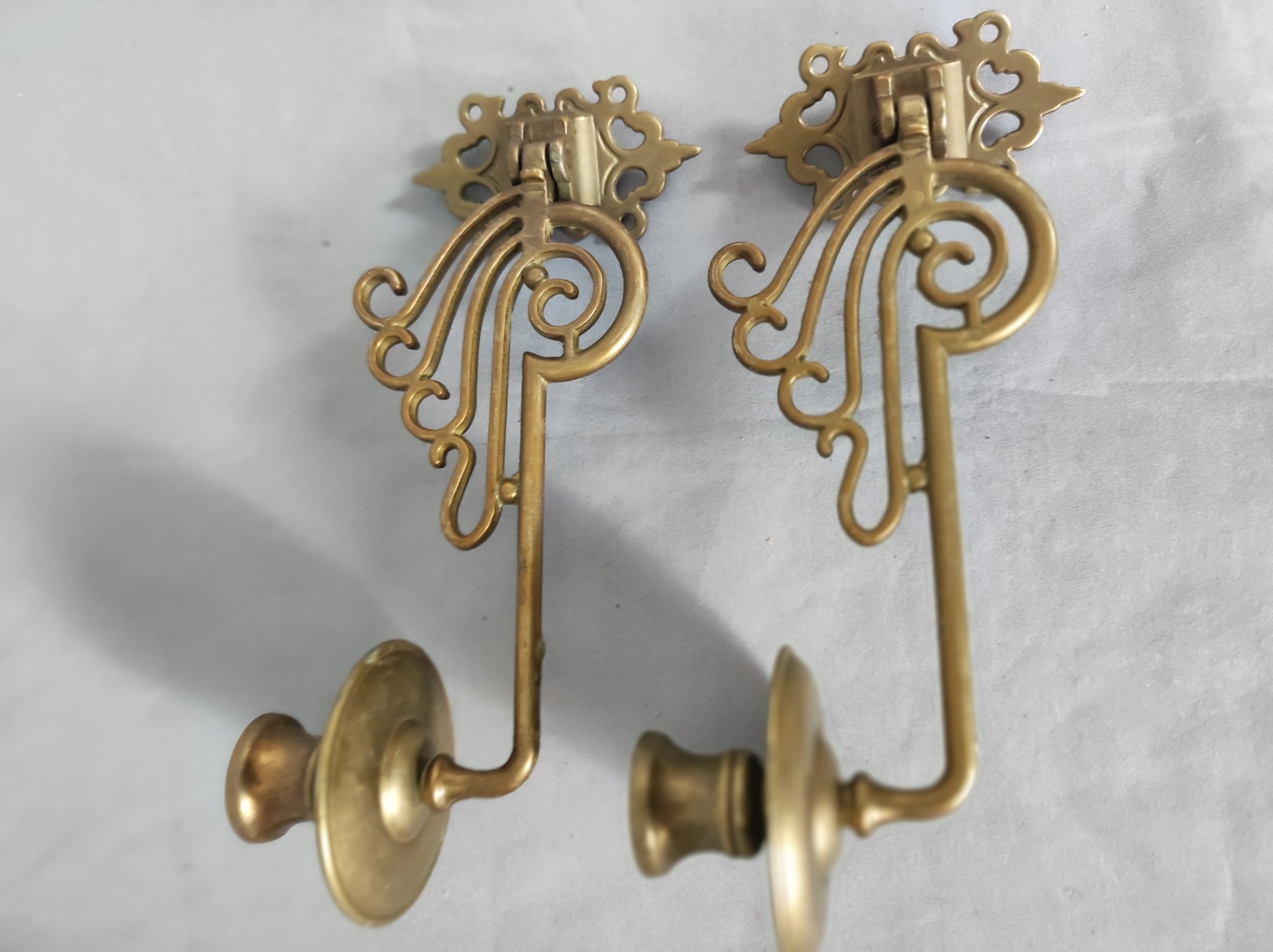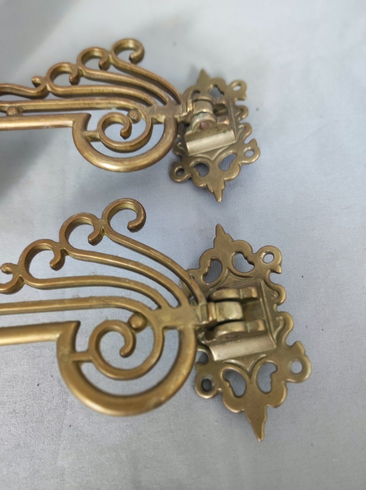 Pár mosazných piánových svícnů s kloubovým ramenem. Povrch s jemnou patinou a drobnými stopami stáří odpovídajícími používání. Mechanika funkční, oba kusy k sobě patří, celek zachovalý. Rozměry jsou patrné z fotografií.