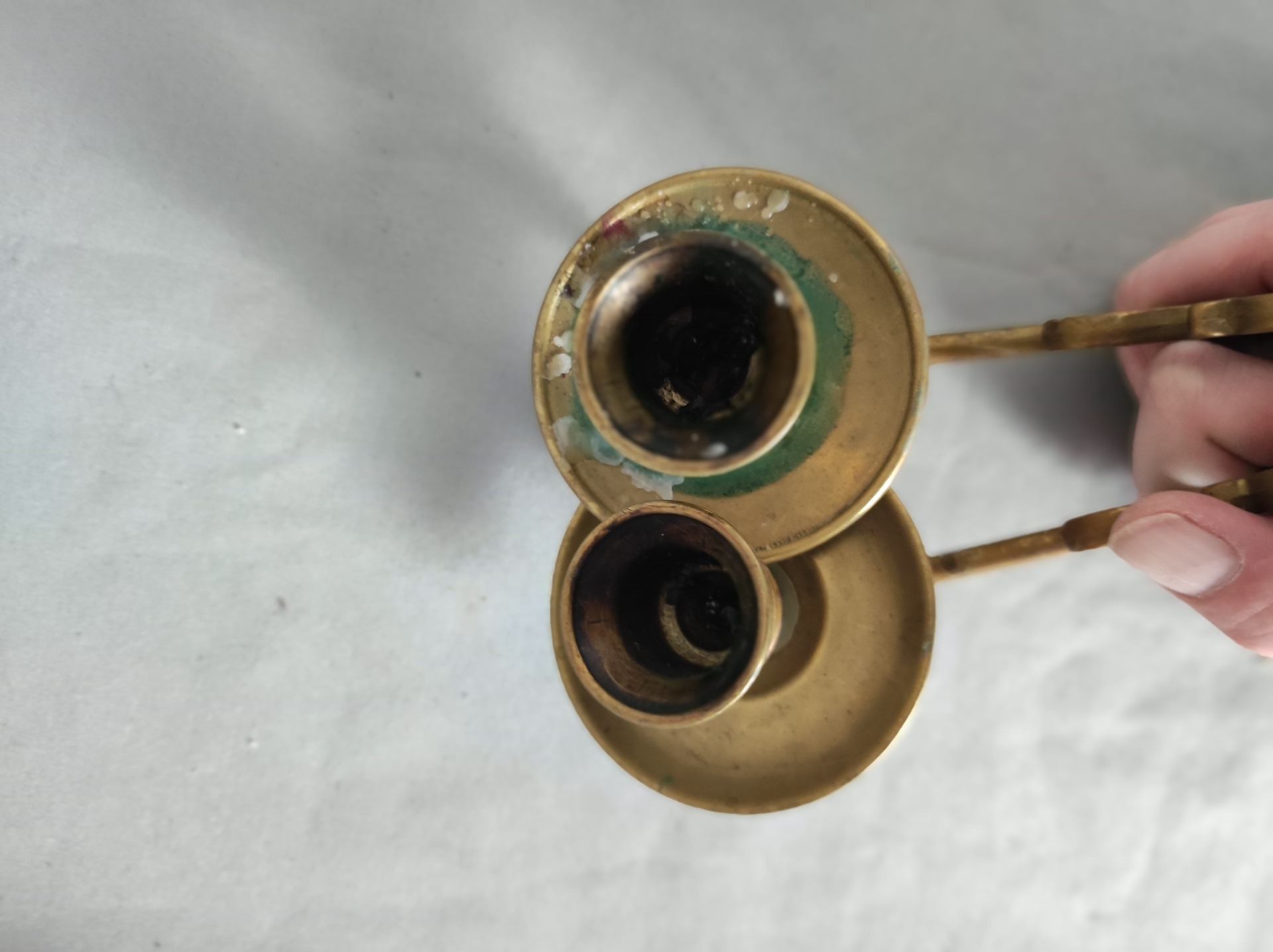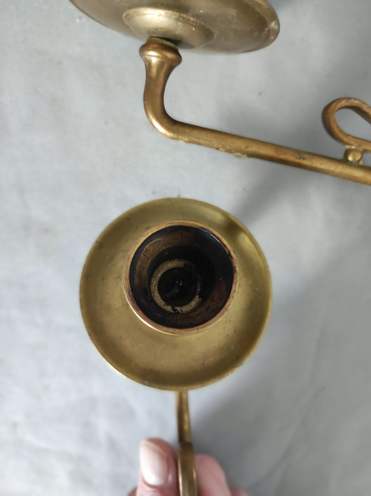 Mosazné provedení je jemné, zdobené, ale nepůsobí přehnaně. Kloubové rameno umožňovalo svícen přiblížit k notám nebo ho odklonit, když nebyl potřeba. Každý detail má smysl – funkční i estetický. To není dekor navržený zpětně, to je původní řešení své doby.