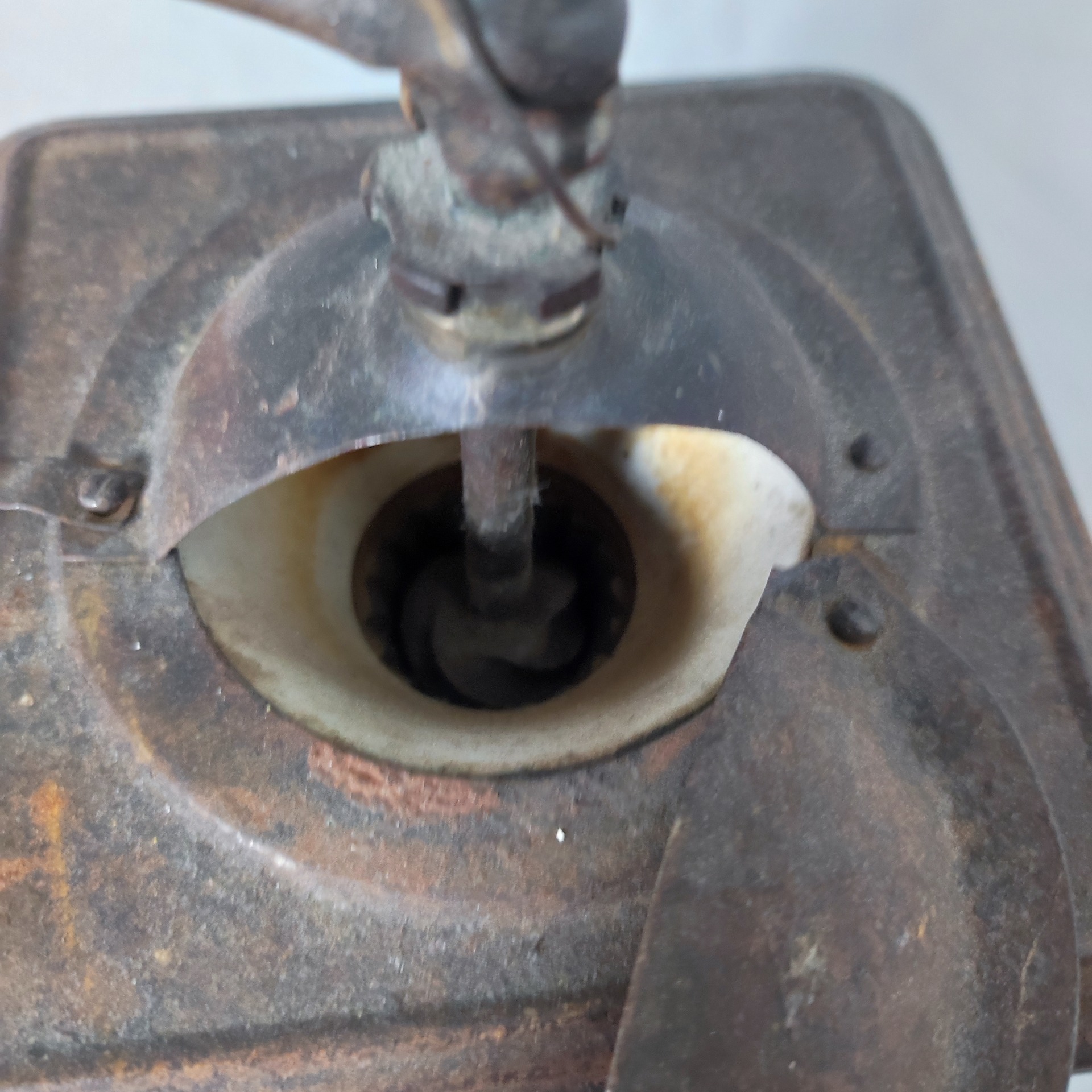 Povrch nese stopy používání, tmavnutí a drobné oděrky, které vznikly časem, ne uměle. Víko i horní mechanika působí robustně, bez snahy o zdobnost. Tenhle mlýnek byl vyrobený proto, aby vydržel roky, ne aby zaujal výlohu.