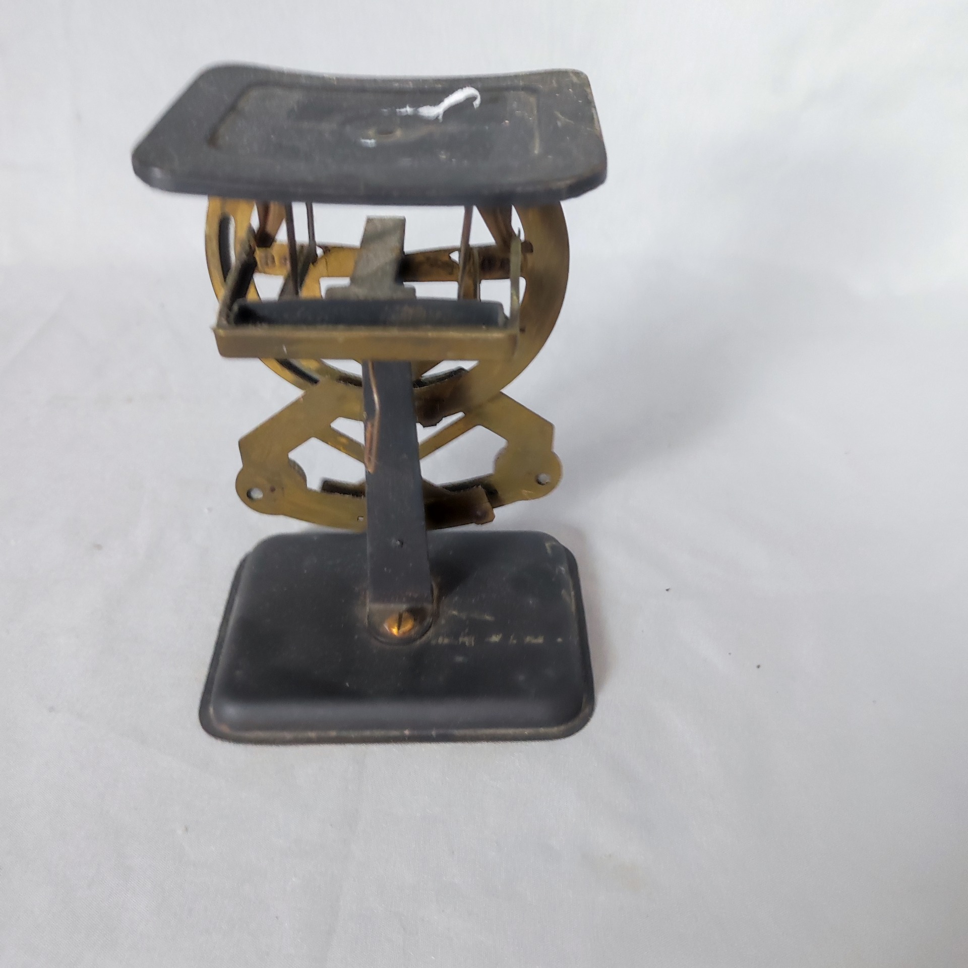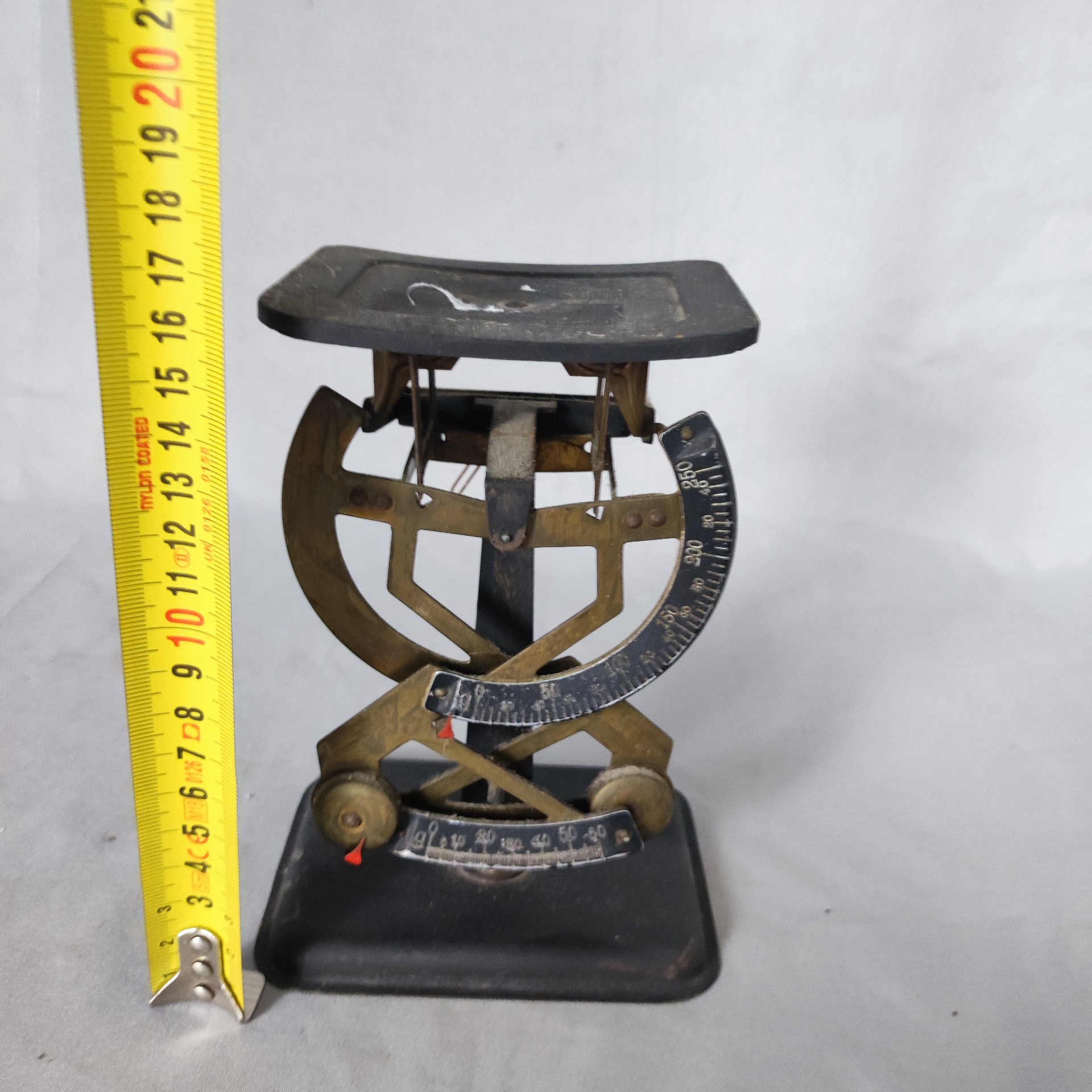 Kovová mechanická poštovní váha na dopisy, s obloukovou stupnicí a viditelným mechanismem. Patina, otěry a drobné stopy stáří odpovídají dlouhodobému provozu na poště. Konstrukce je stabilní, celek kompletní. Rozměry jsou patrné z fotografie s metrem.