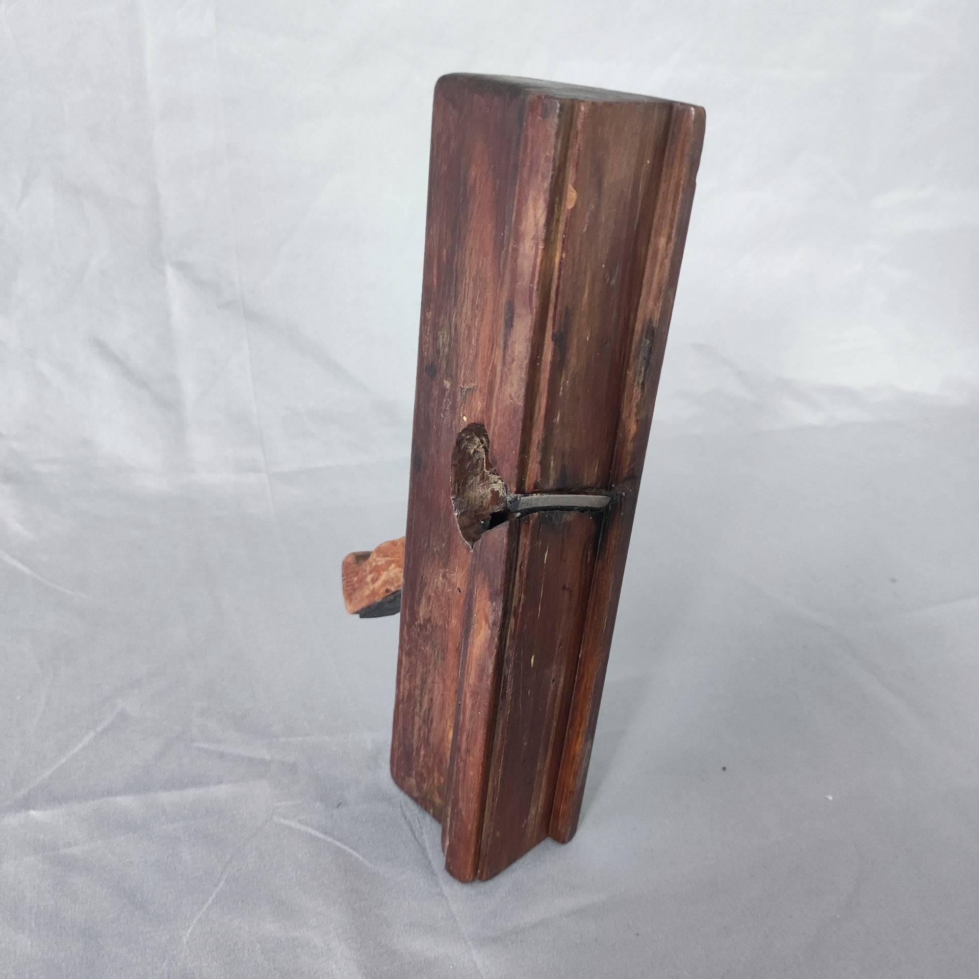 Tenhle hoblík má v sobě klid a trpělivost starého mistra. Ležel na polici ve Štěmberku, vedle dalších, všechny s jiným tvarem čepele — každý určený pro jiný profil lišty. Tenhle vyřezával jemné obloučky, které dřív rámovaly dveře a okna starých domů. Dřevo je tmavé, nasáklé olejem a časem. Když se na něj podíváš zblízka, vidíš stopy rukou, co ho držely den za dnem.