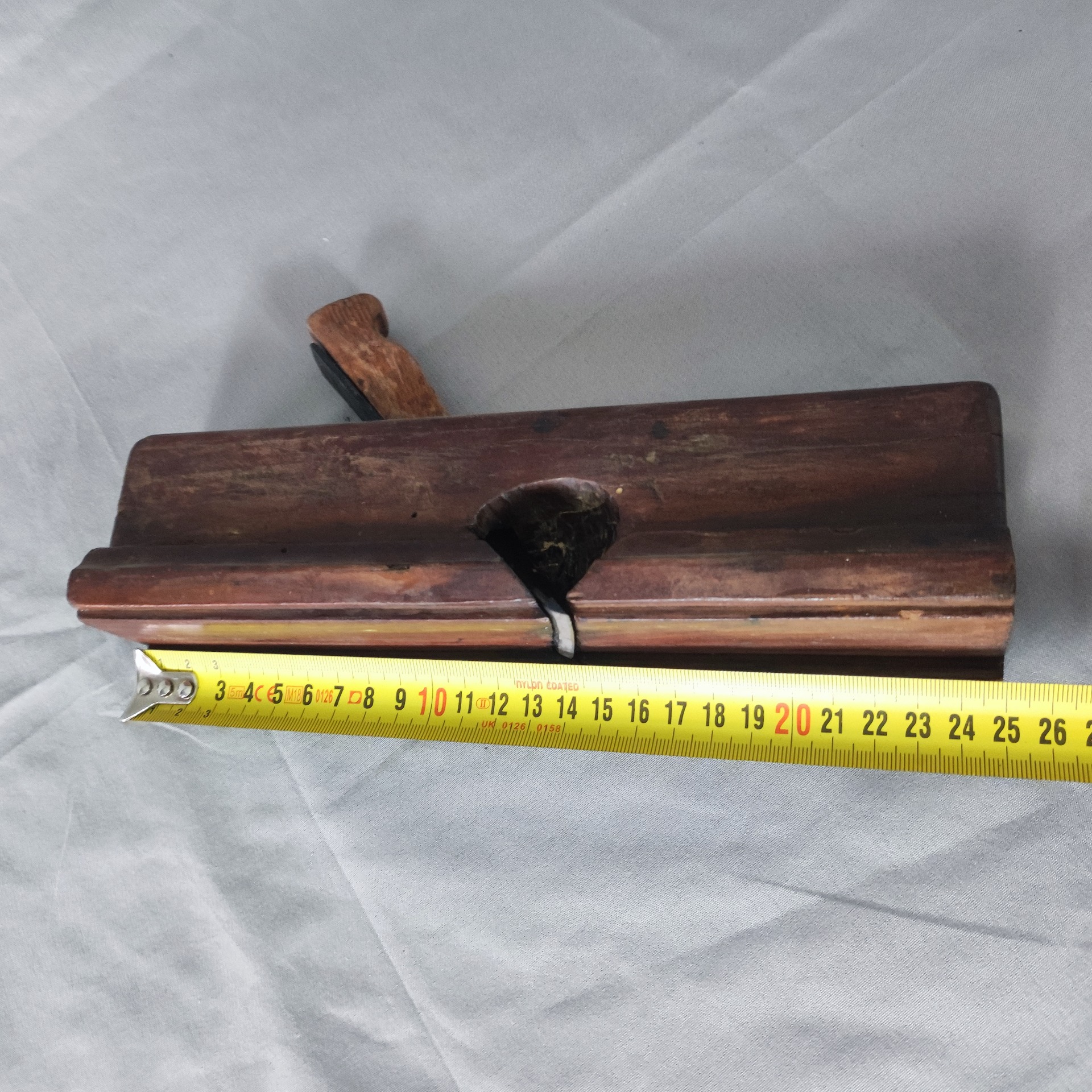 Dřevo suché, pevné, s tmavou patinou. Železo původní, čisté, funkční. Autentický stav z dílny, vhodný pro sběratele, dekoraci nebo i lehké použití.