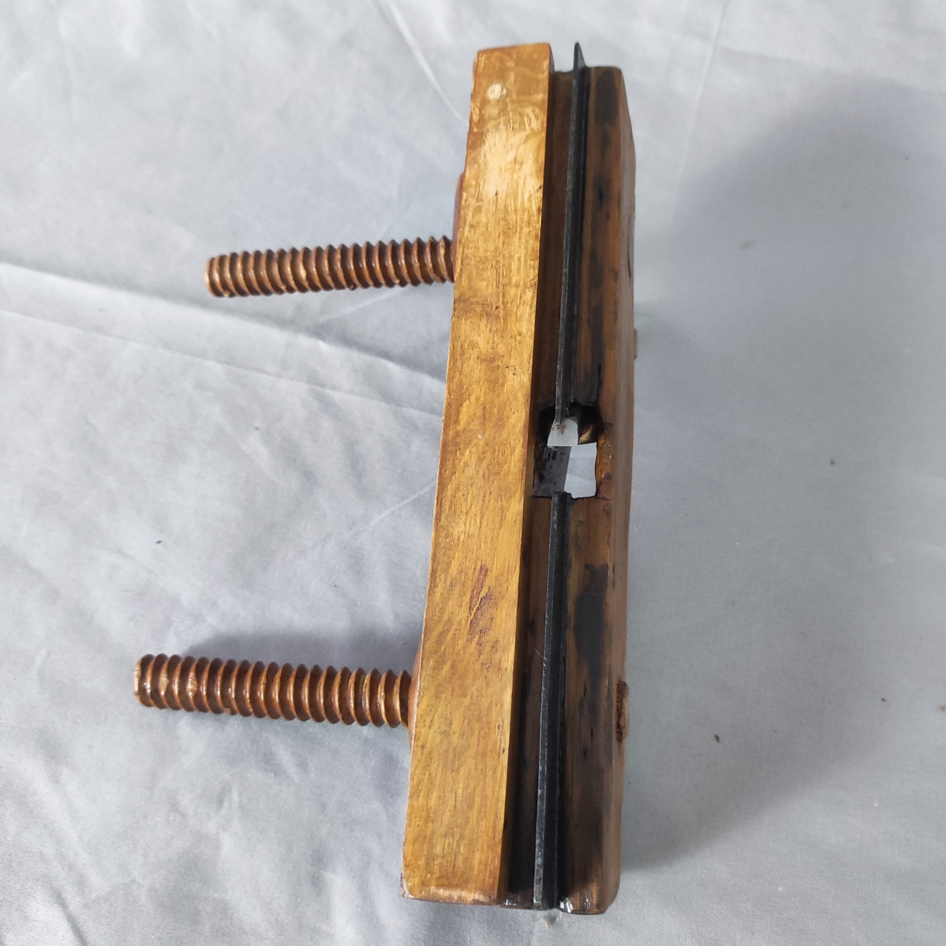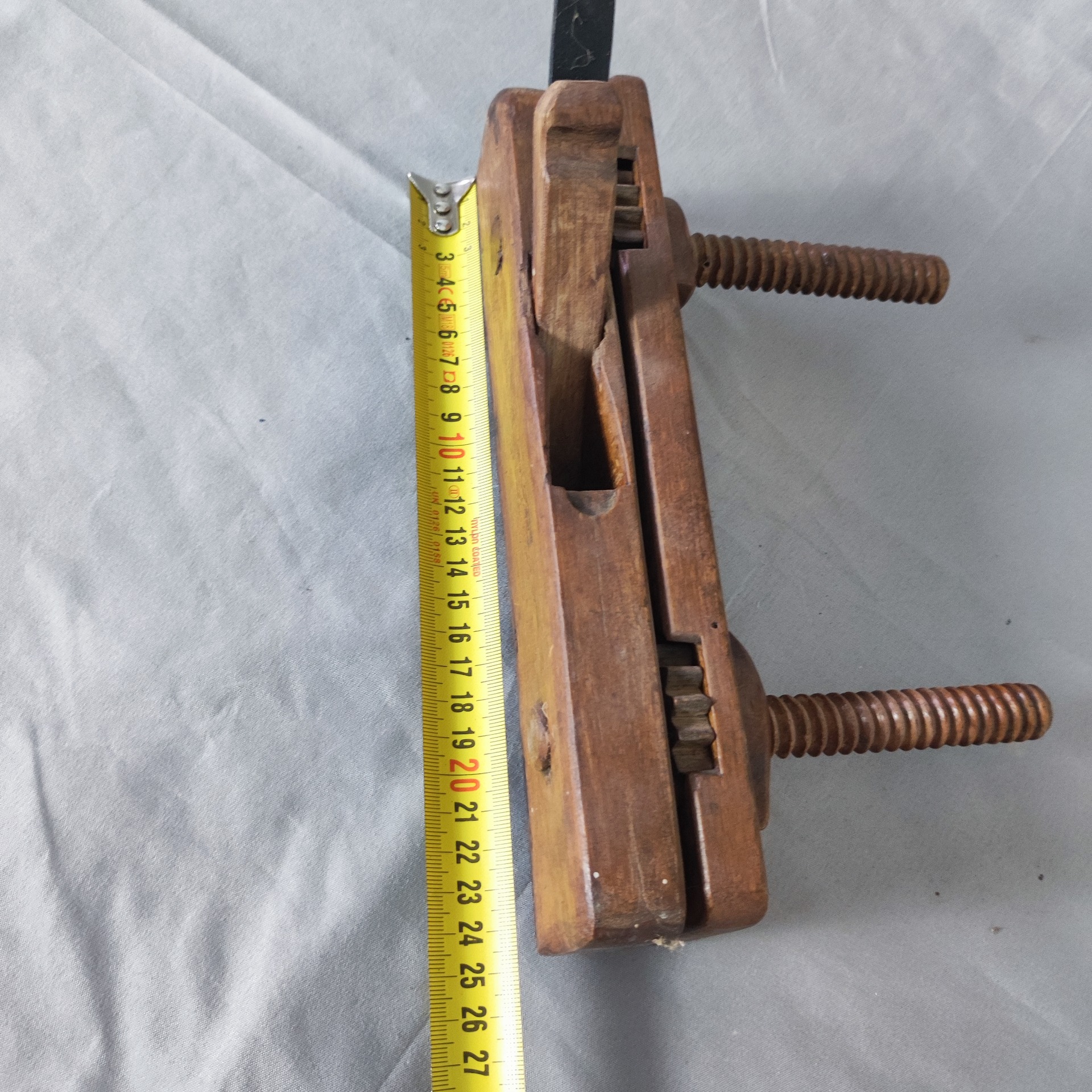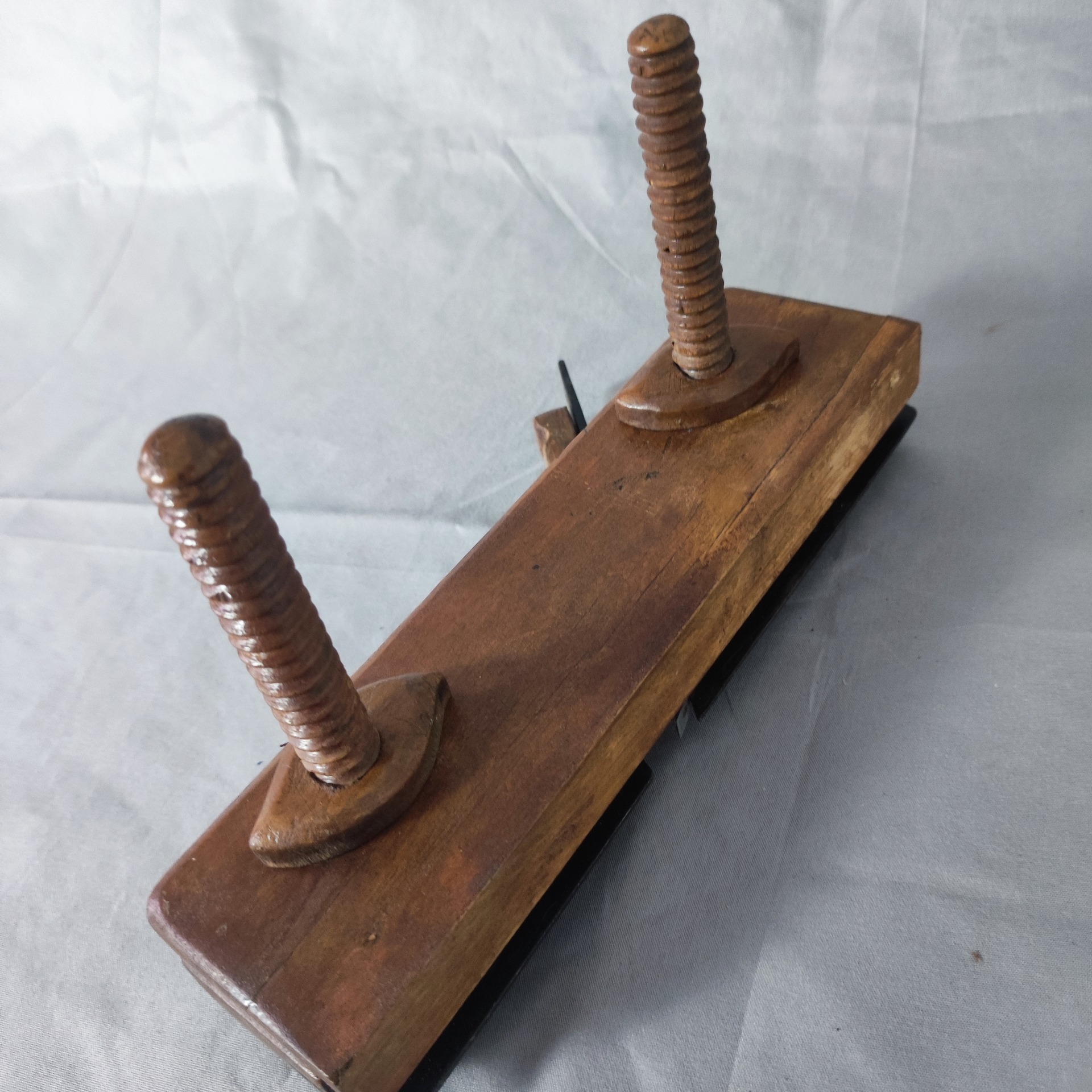 Pevné suché dřevo, přeleštěné a oživené olejem. Železo původní, s přirozenou patinou.