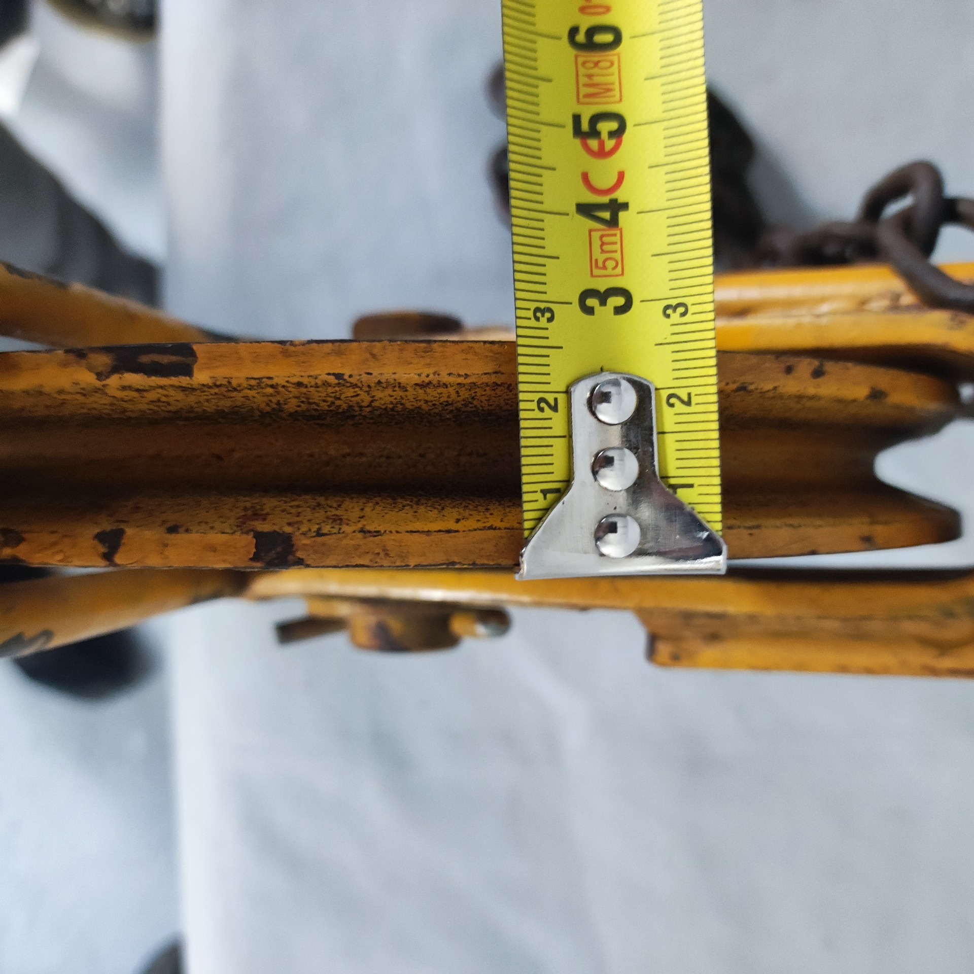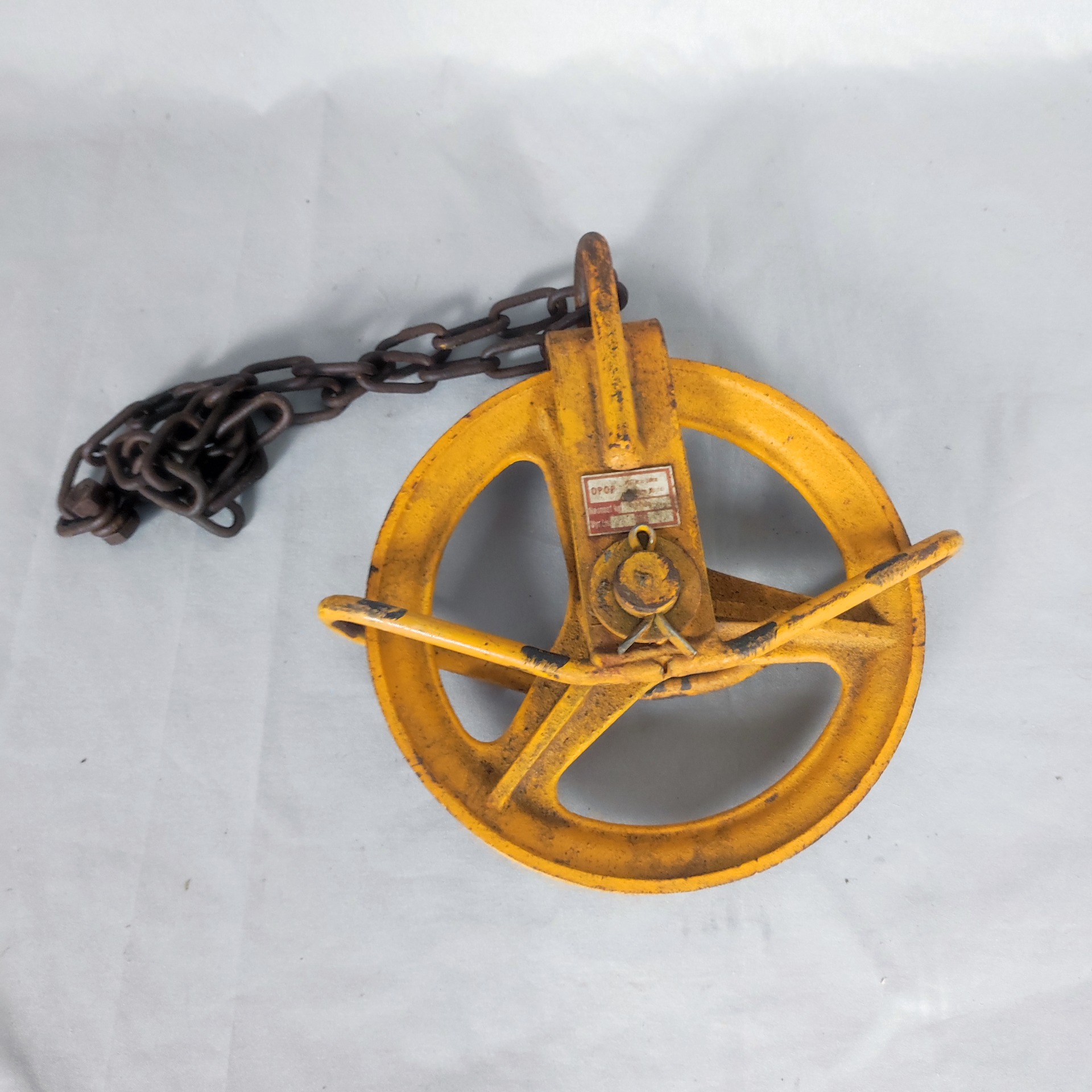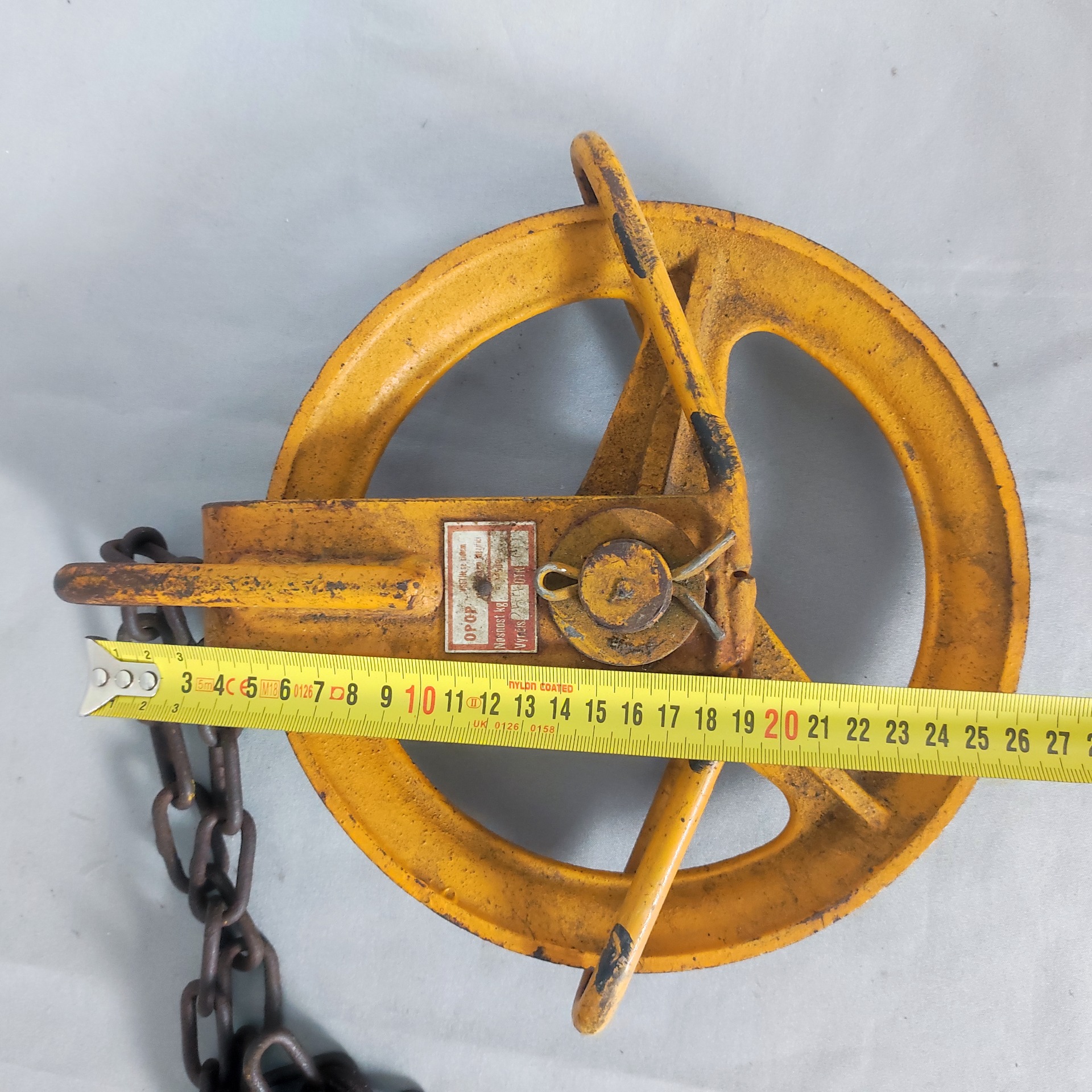 Tenhle kus pochází ze světa dílen a provozů, kde věci nebyly na okrasu, ale na práci. Litinová kladka s ocelovým řetězem, těžká, poctivá, natřená typickou průmyslovou žlutí. Nese jasné stopy používání – ošoupaná barva, patina, rez tam, kde se léta točilo železo o železo.