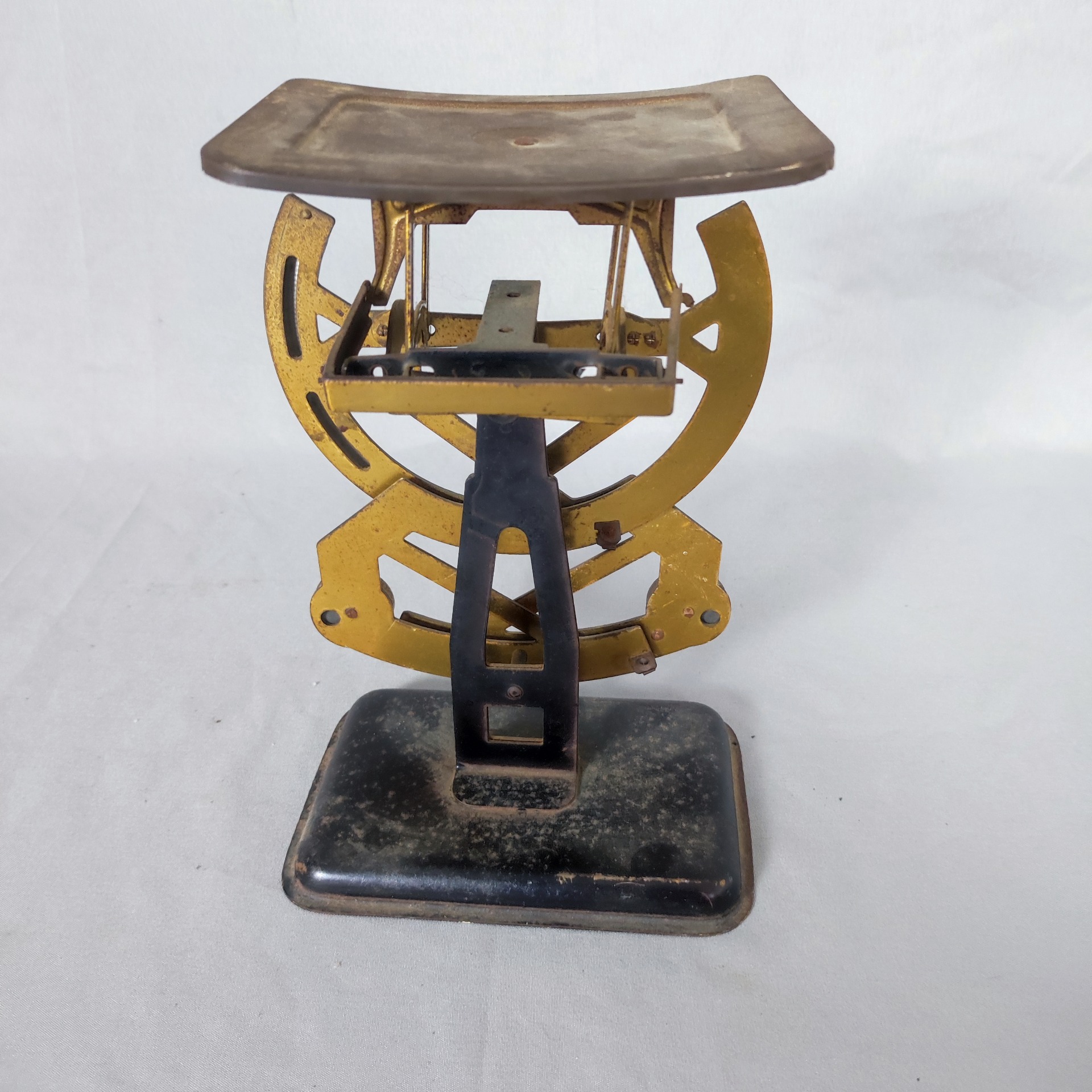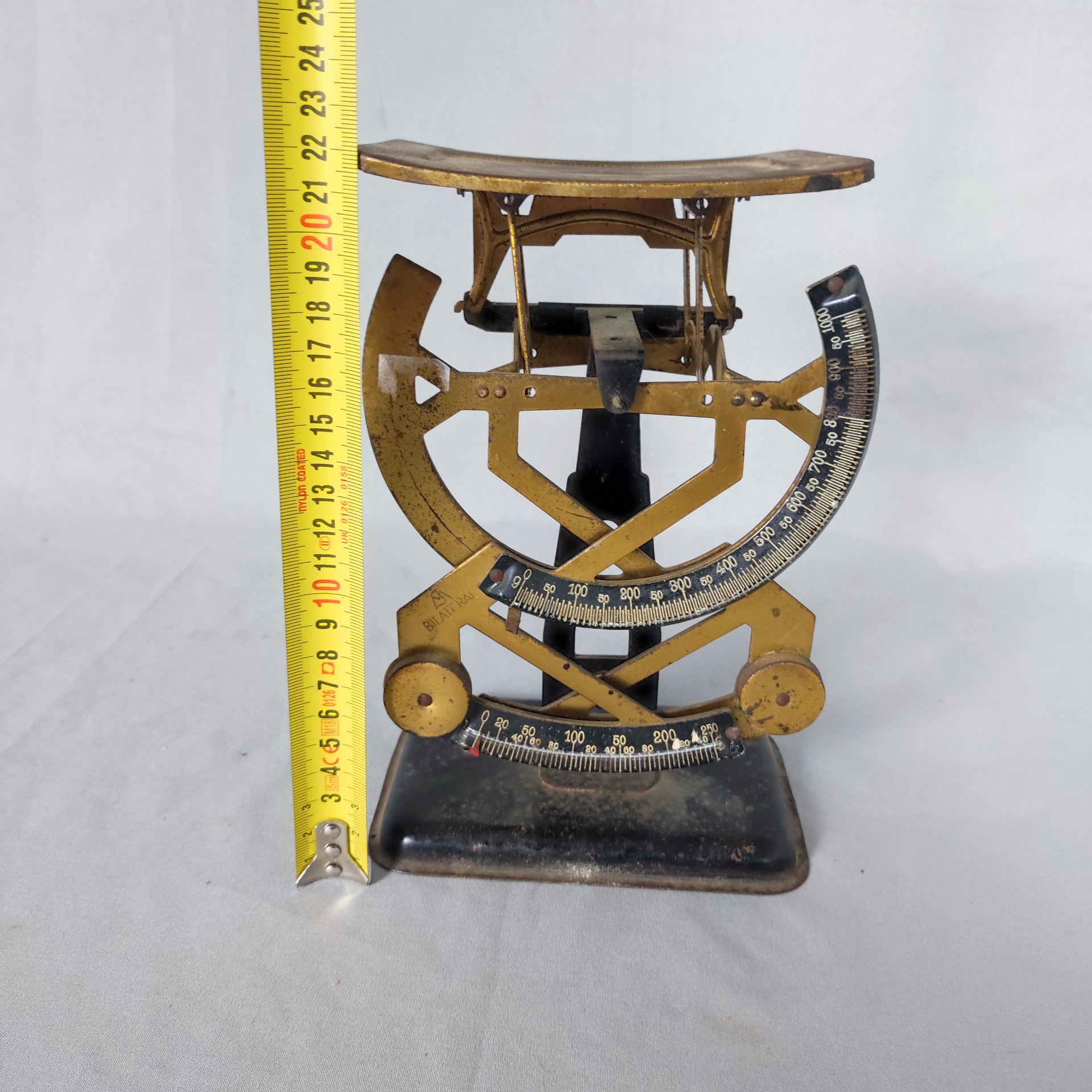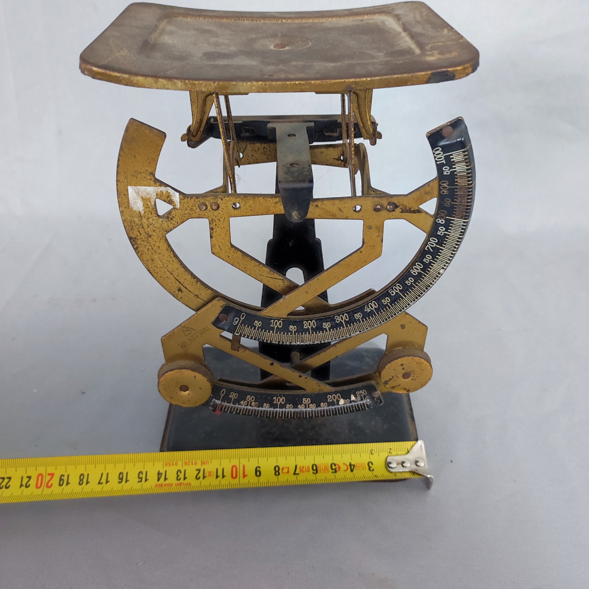 Kovová mechanická poštovní váha na dopisy, s obloukovou stupnicí a viditelným mechanismem. Patina, otěry a drobné stopy stáří odpovídají dlouhodobému provozu na poště. Konstrukce je stabilní, celek kompletní. Rozměry jsou patrné z fotografie s metrem.