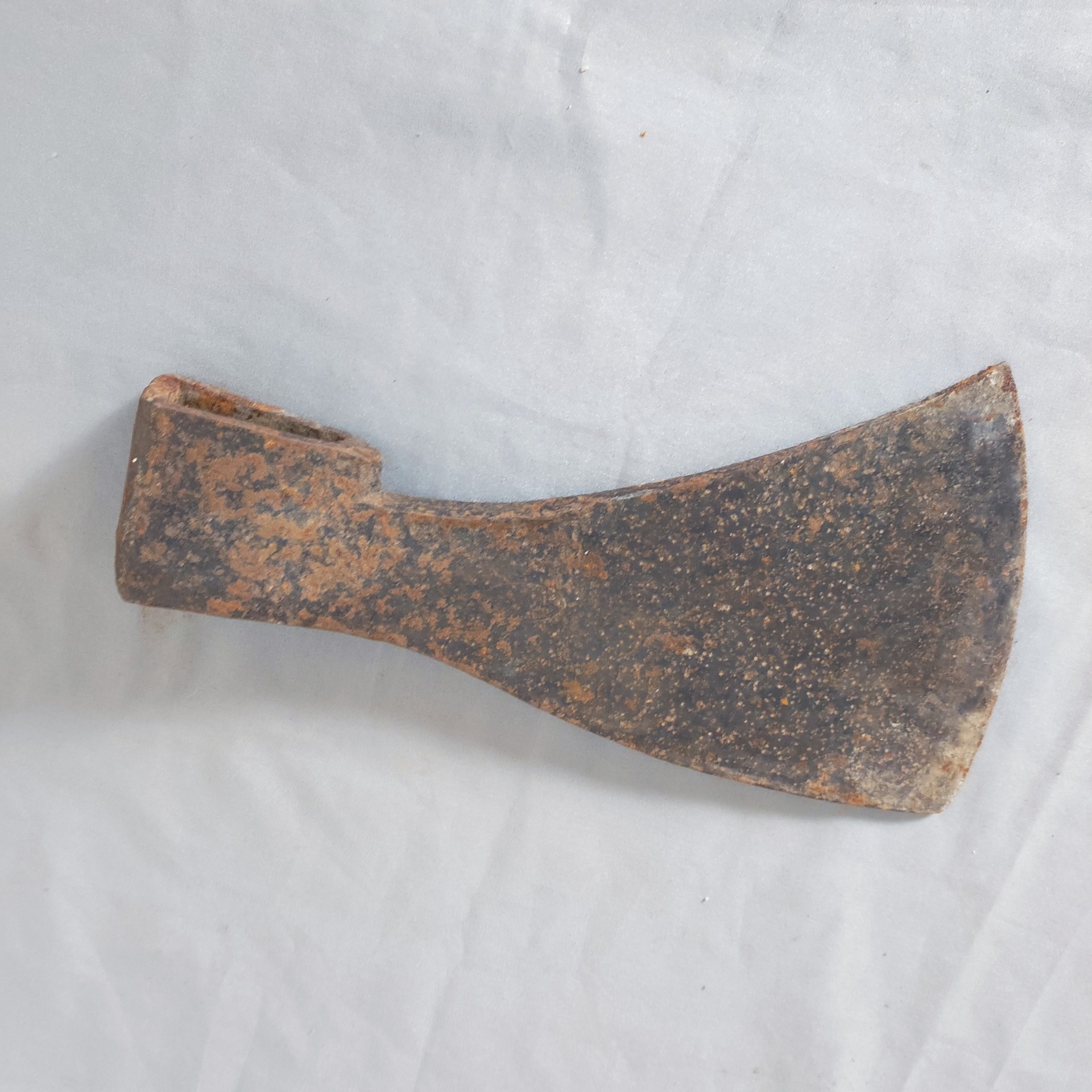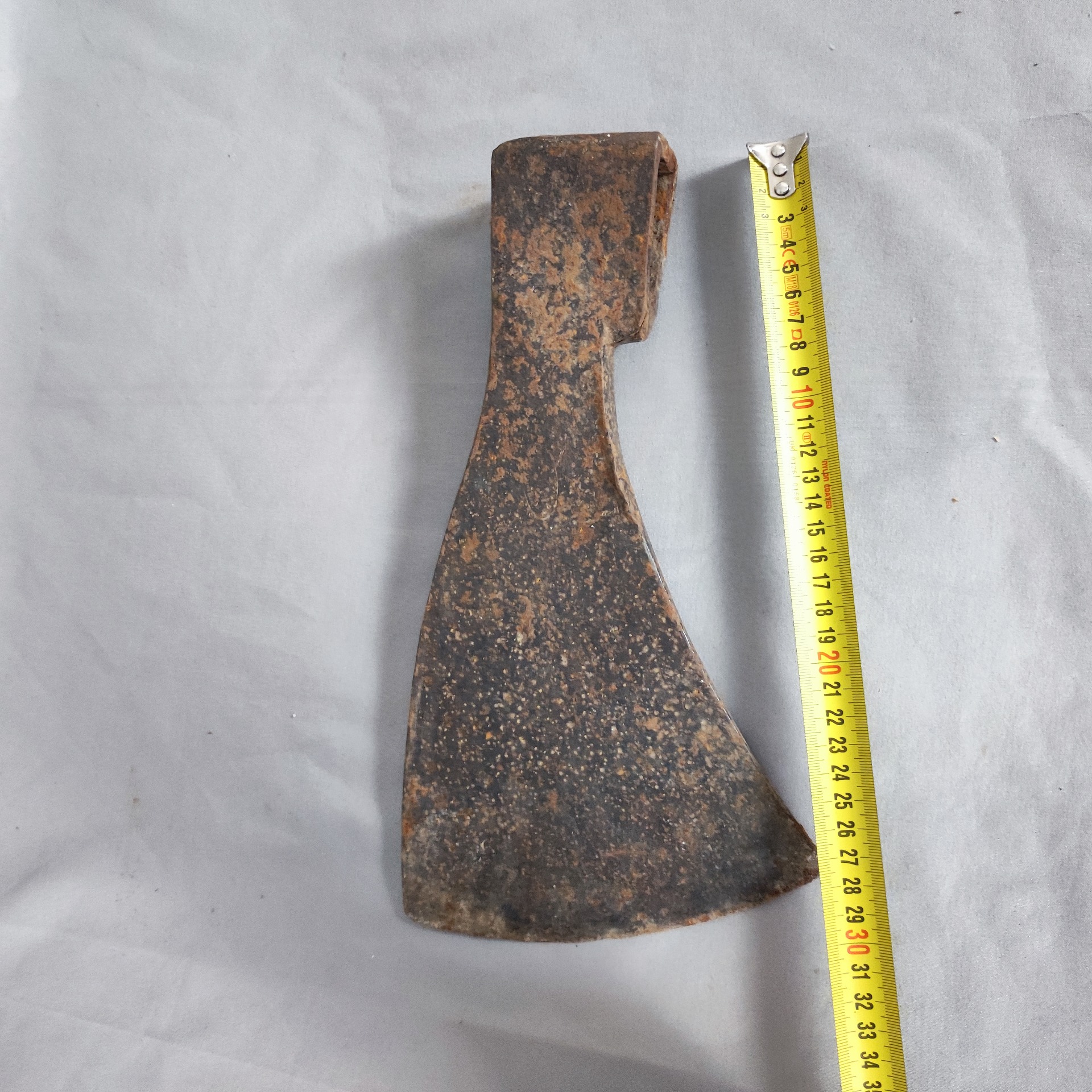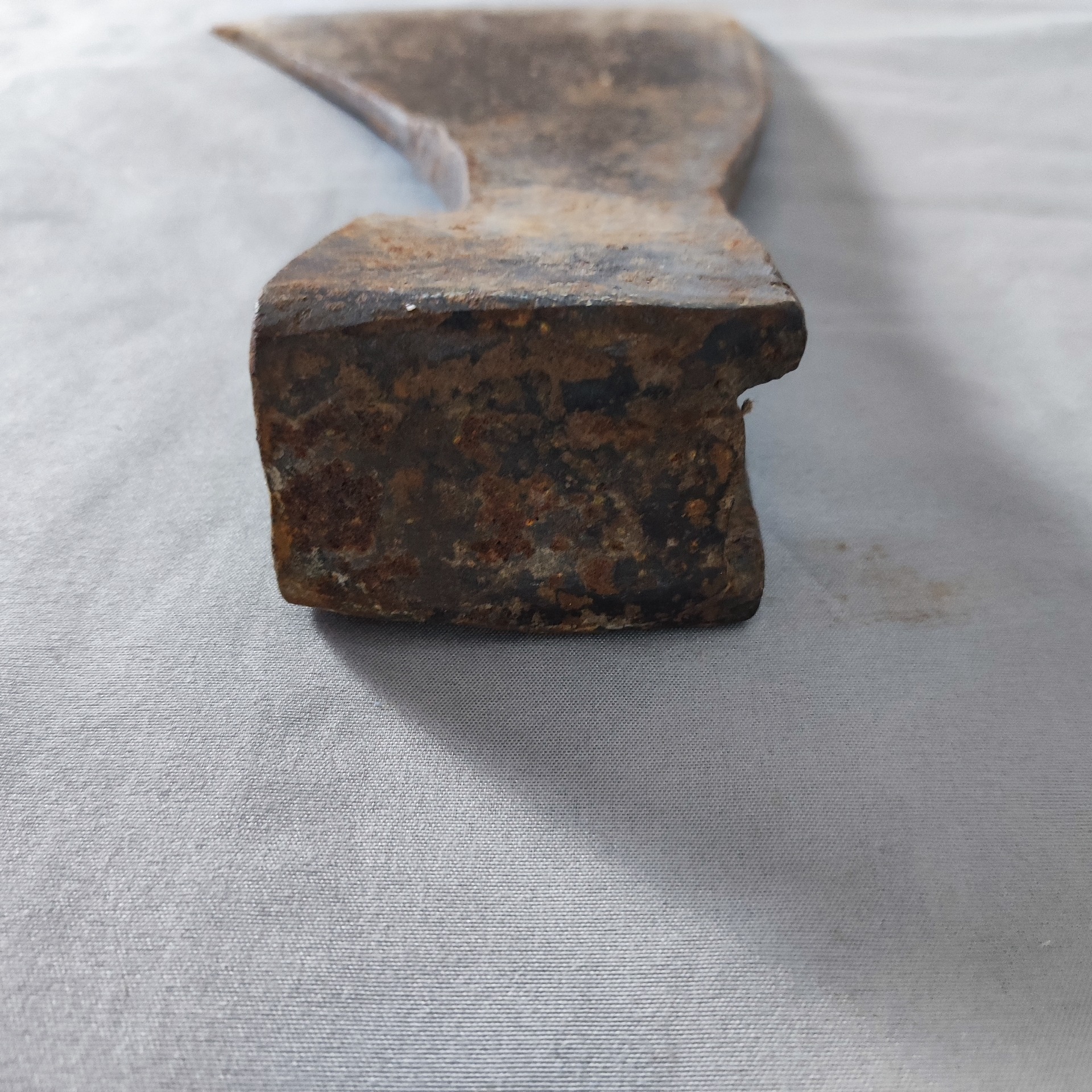 Masivní kované železo, původní stav, bez topora. Povrchová koroze odpovídající stáří, konstrukčně pevné, nepoškozené. Ostří nese stopy používání, bez zásadního vyštípnutí. Nečištěno do „novoty“, ponecháno v autentickém stavu.