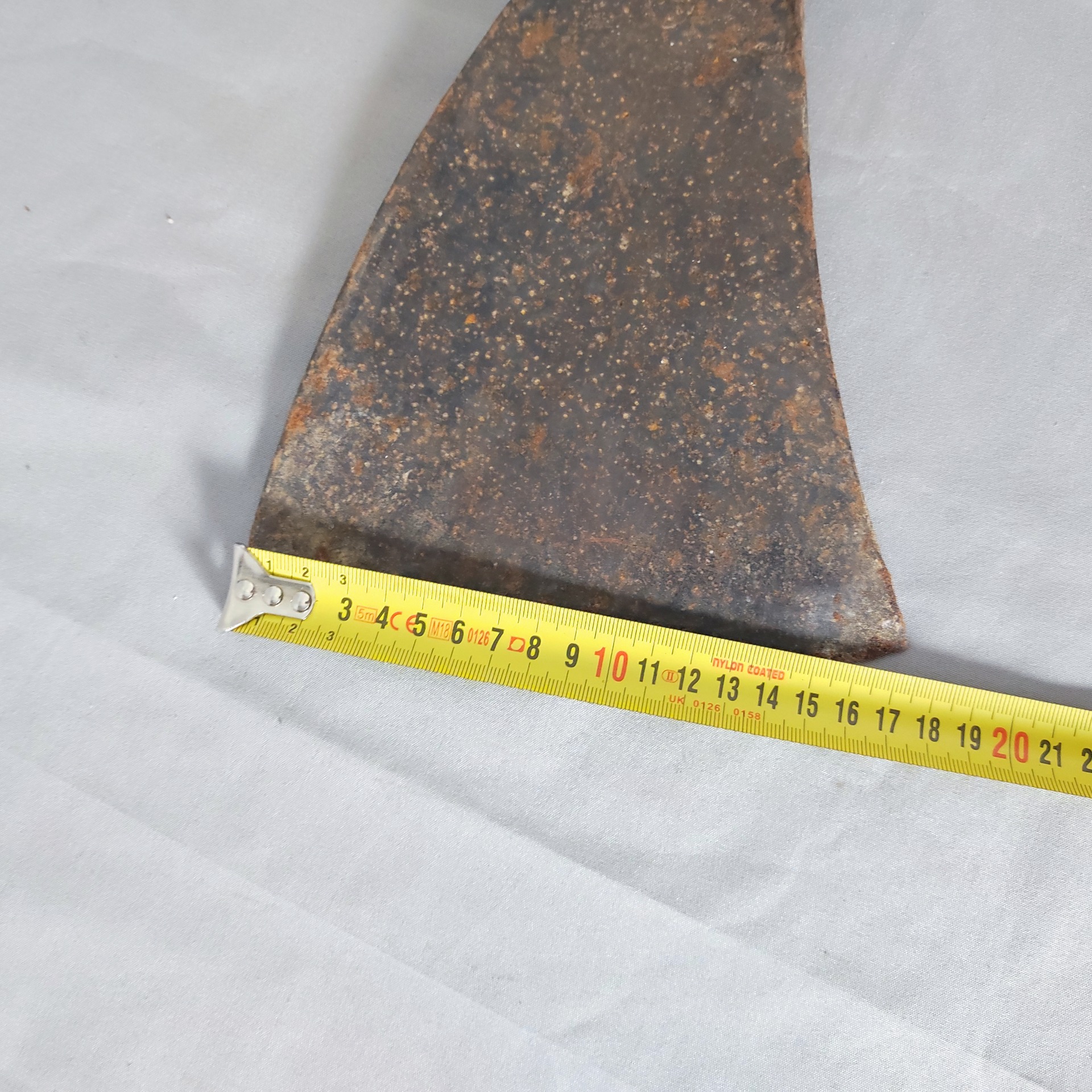 Tvar je vyvážený, ostří rovné, žádné praskliny ani zlomy. Je to kus, který má za sebou práci a je to na něm vidět. Právě proto funguje i dnes – buď jako autentické staré nářadí, nebo jako silný industriální objekt.