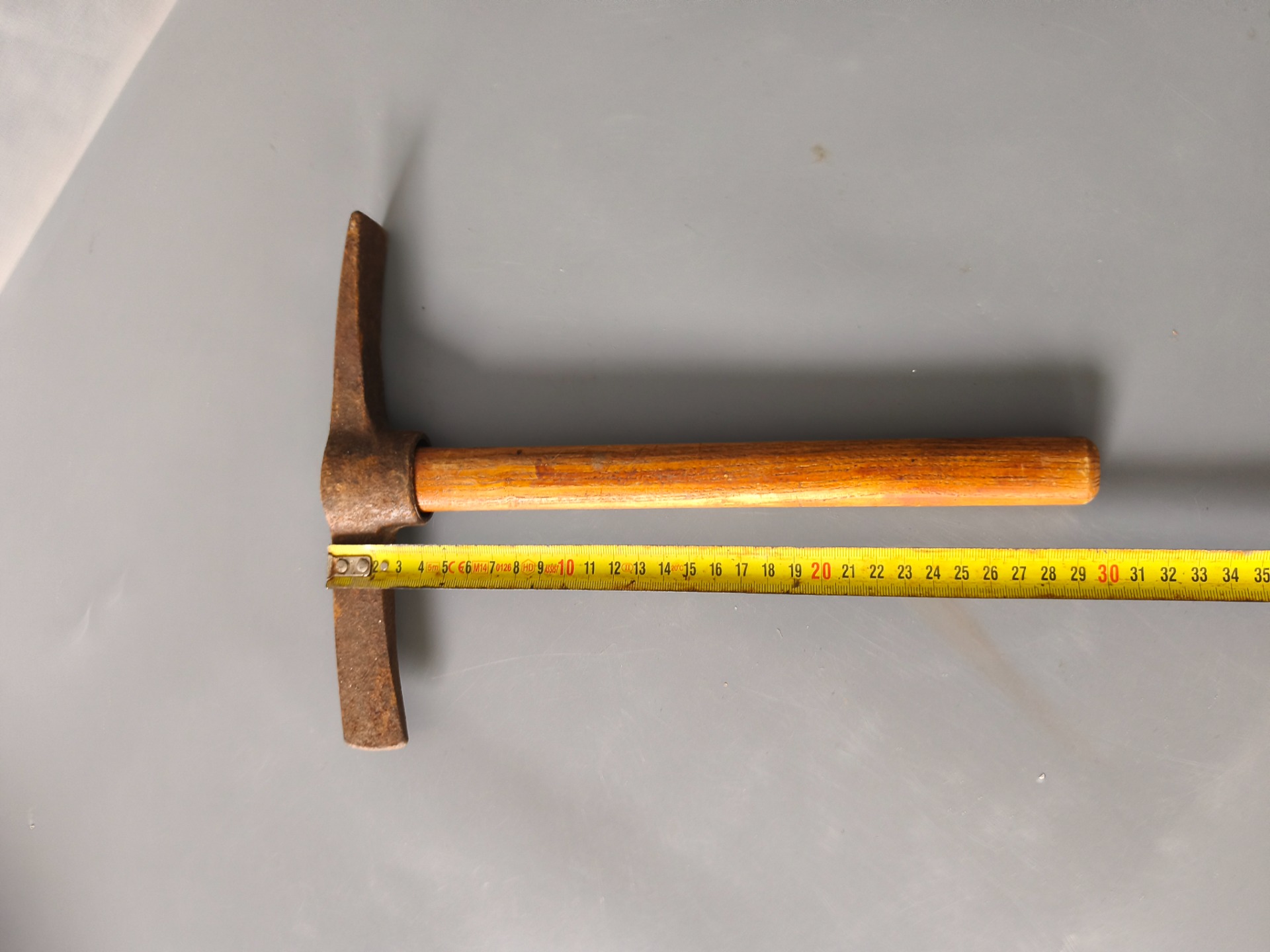 Dřevěná rukojeť je hladká tam, kde ji svírala dlaň. Letokruhy jsou vidět, lak už dávno není nový, ale drží. Celek působí klidně a vyváženě, přesně tak, jak má ruční nářadí působit. Nářadí z doby, kdy se věci nedělaly na efekt, ale na práci.