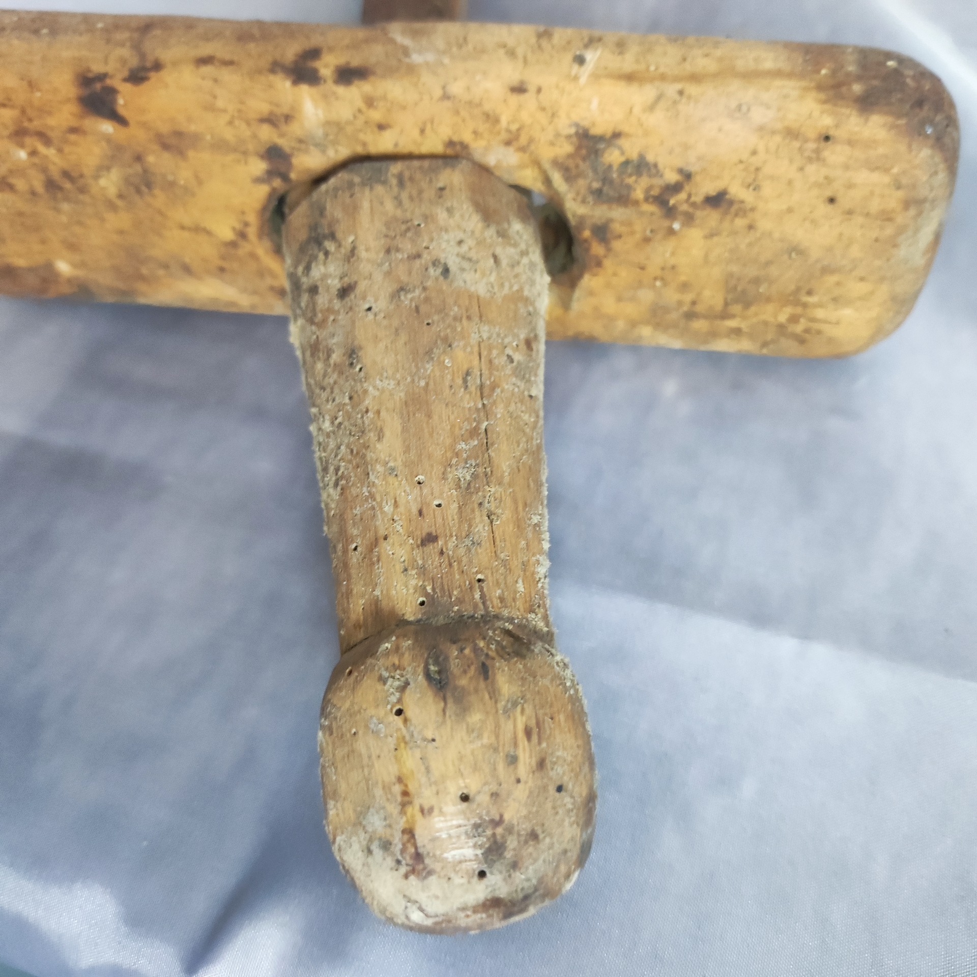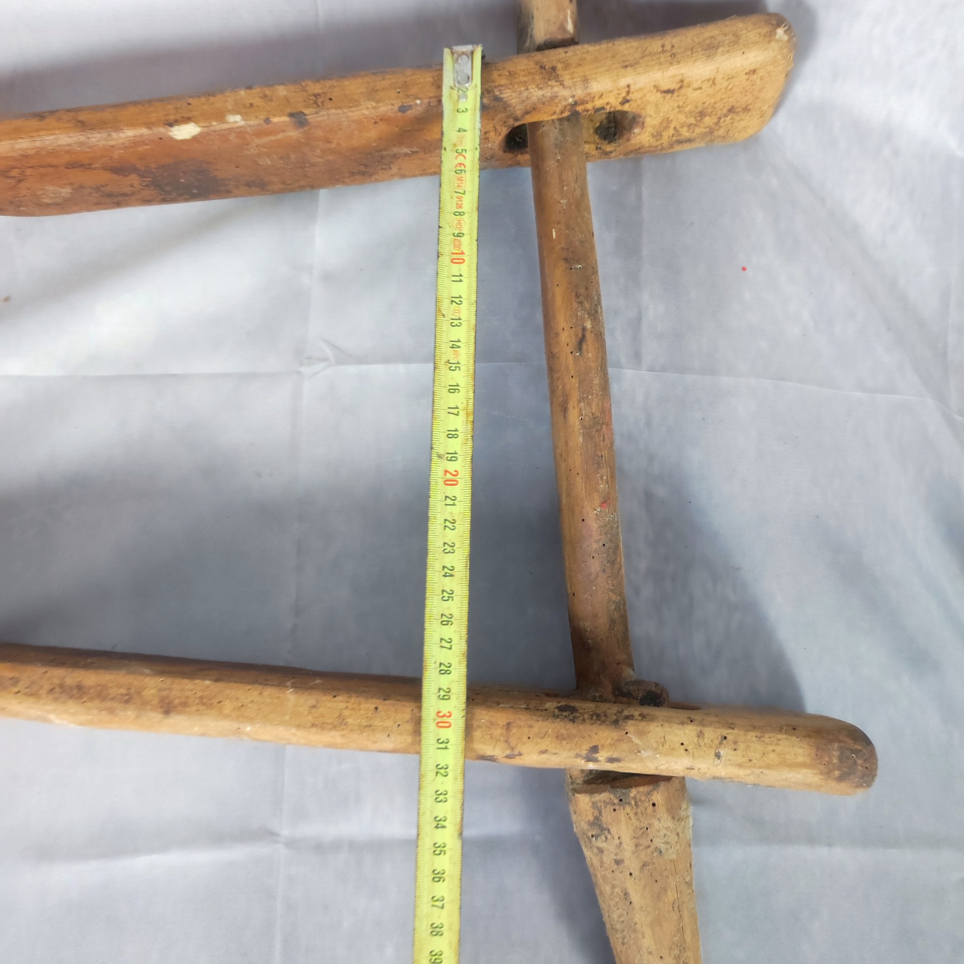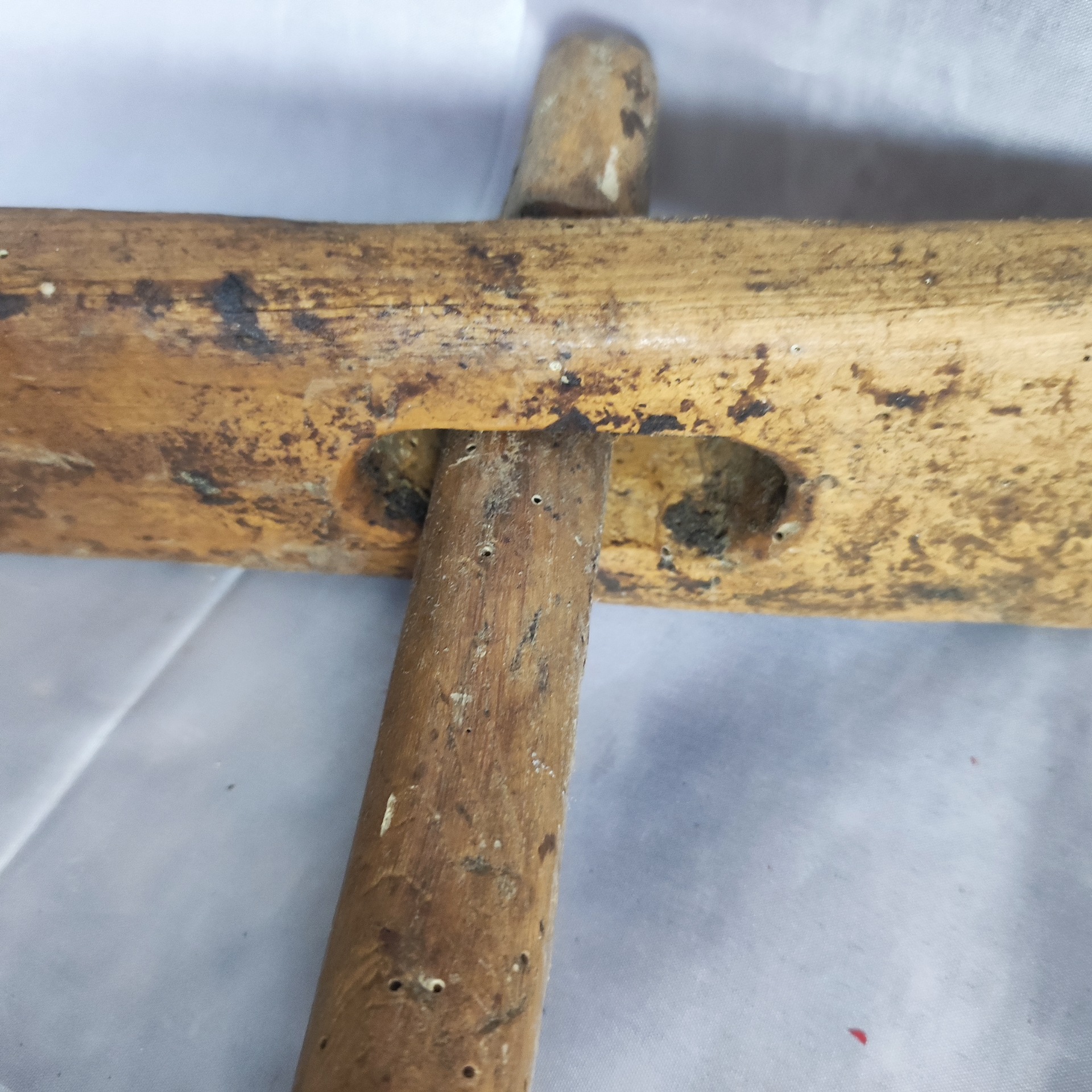 Dřevo tvrdé, vyschlé, s původní patinou a drobnými stopami po červotoči. Pevné spoje, bez prasklin, pouze povrchové šrámy od používání. Přirozeně čistý stav bez úprav, autentická selské řemeslo z přelomu 19. a 20. století.