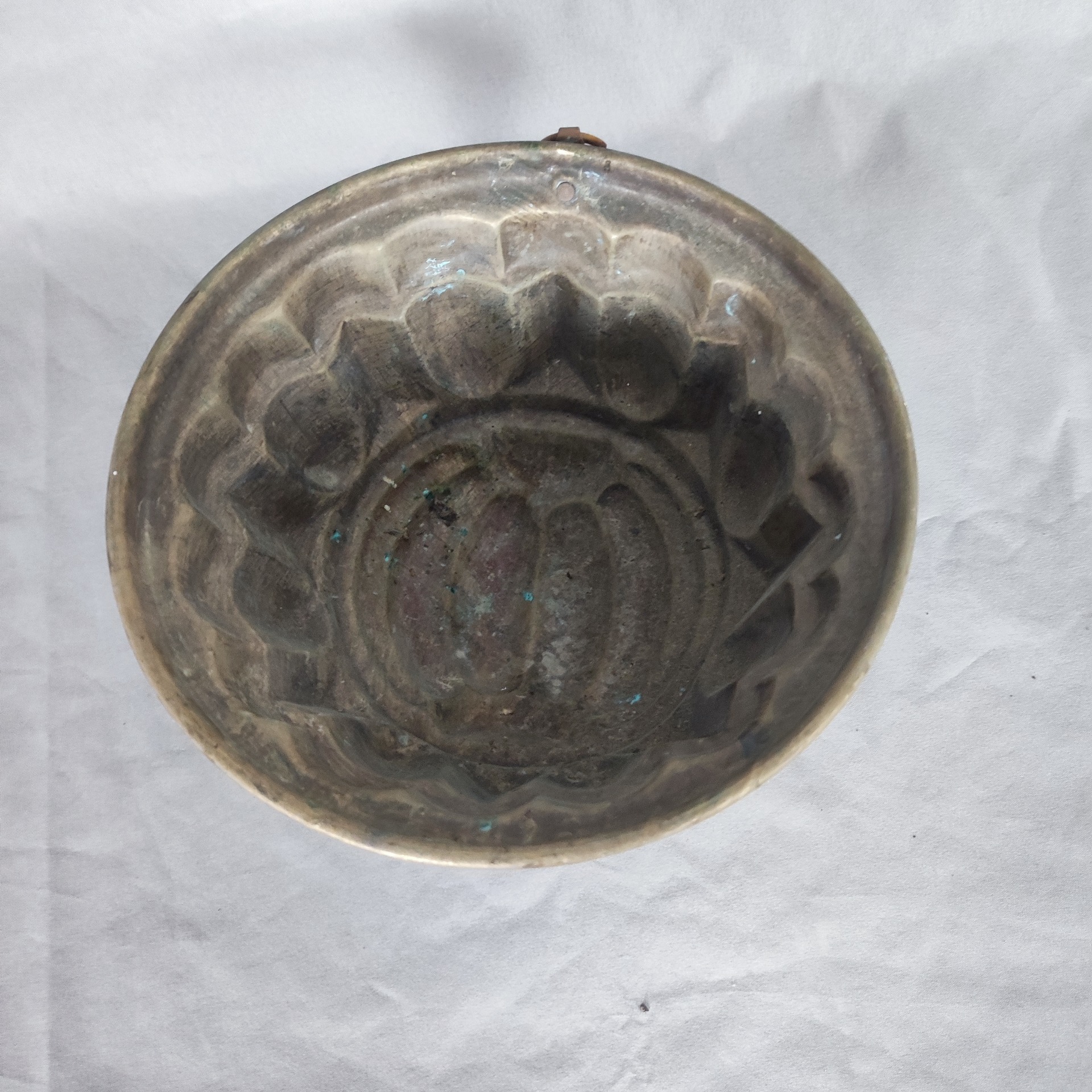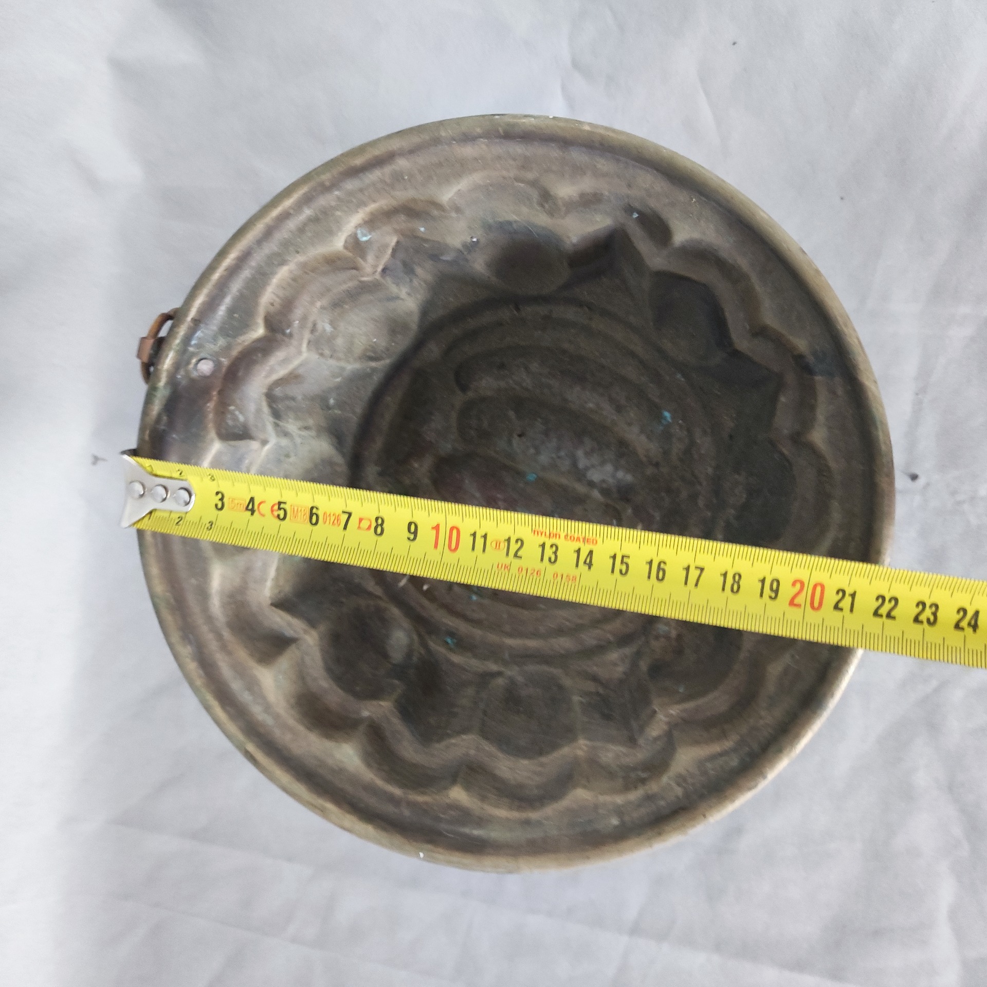 Forma je poctivě stará, s přirozenou patinou, drobnými stopami používání a lehkým starým měděným oxidem na povrchu. Konstrukčně pevná, neohnutá, neprolitá.