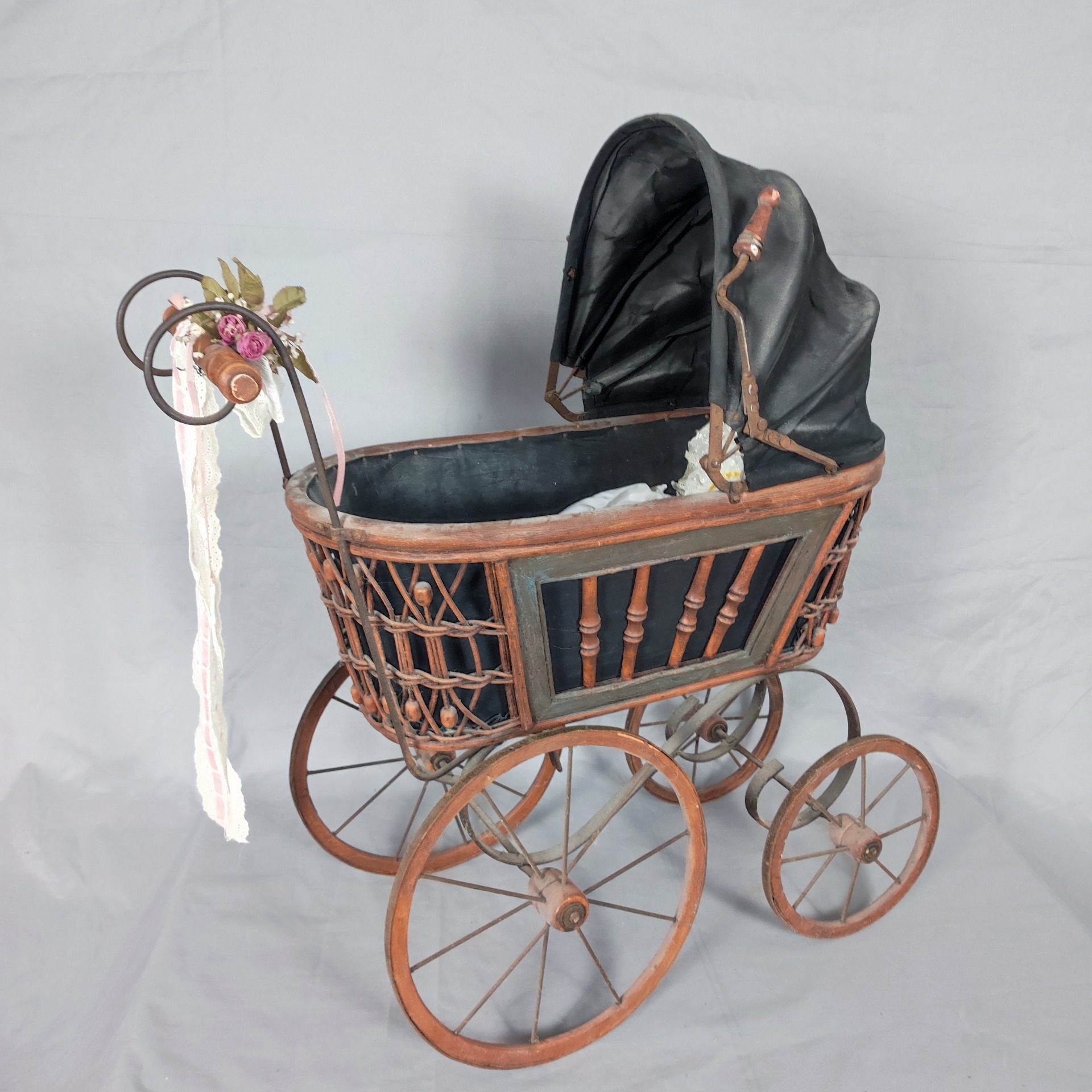 Tenhle kočárek nevozil děti, ale jejich světy. Na dvorech a v průjezdech v něm jezdily panenky zabalené do hadrů, dřevěné figurky i poklady nalezené cestou. Děti se střídaly, kdo bude tlačit, kdo rozhodne, kam se jede, a kolečka skřípala o kameny, jako by patřila k tomu. Nebyla to hračka na parádu, ale poctivý kus, který měl vydržet každodenní hraní.