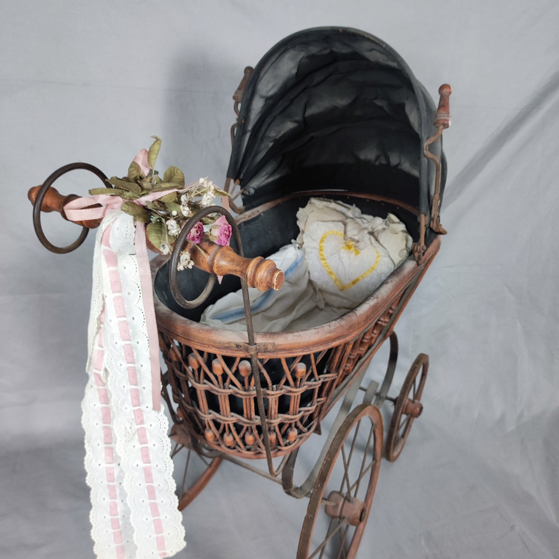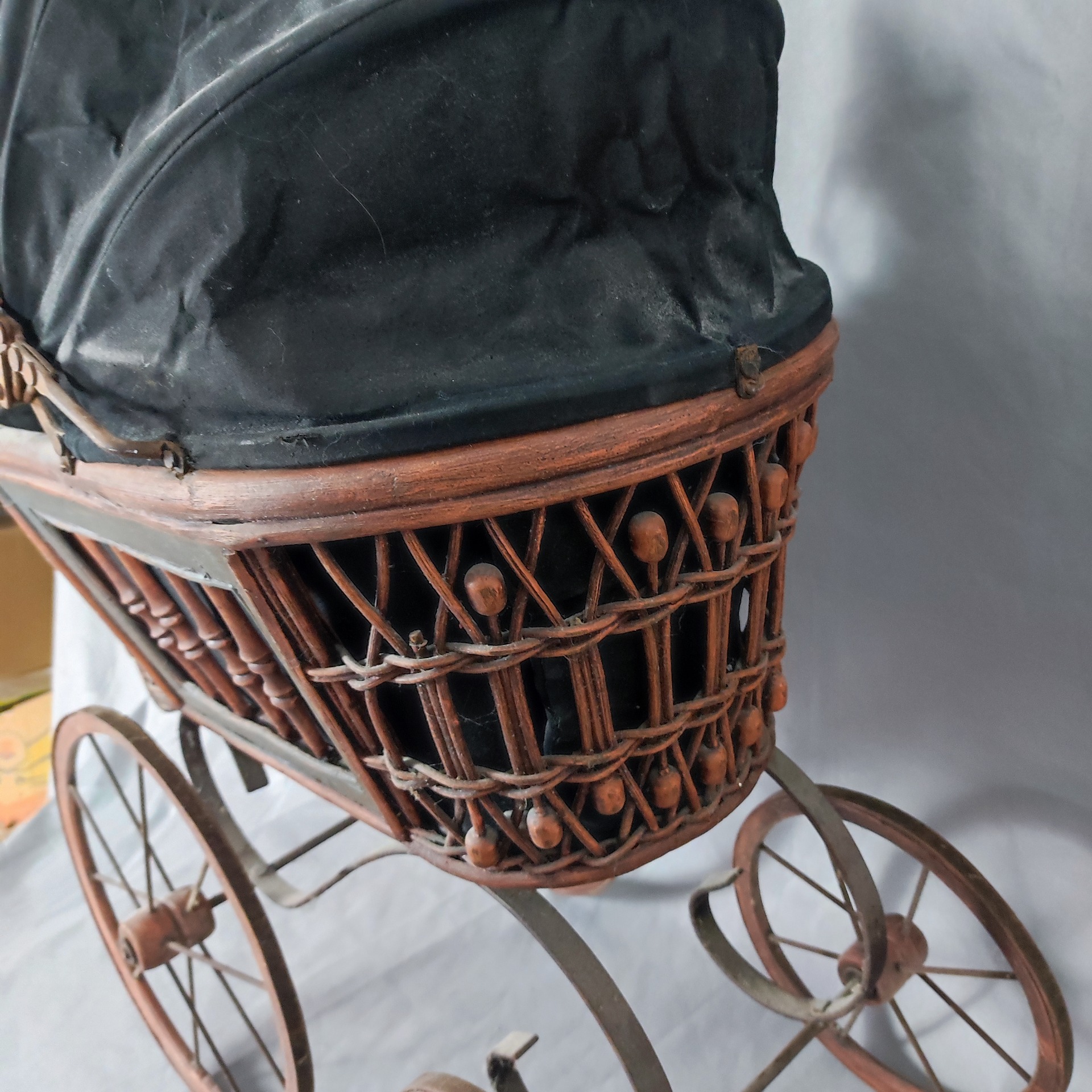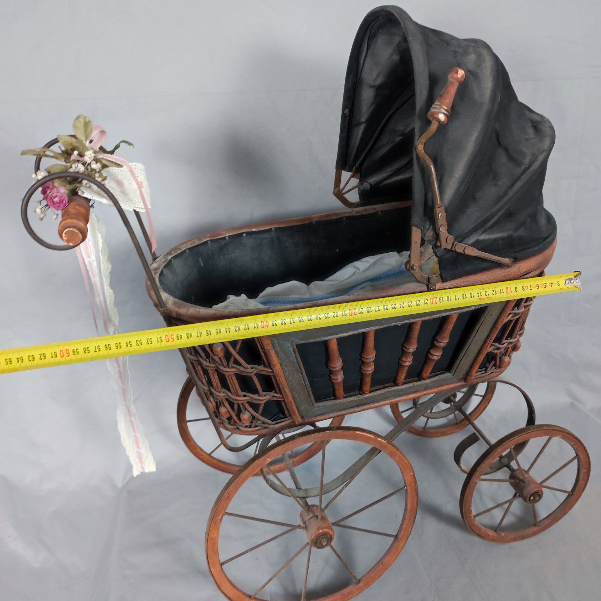 Kočárek je ve výrazné autentické patině. Konstrukce je pevná, dřevěné i kovové části drží, textil je původní a odpovídá stáří. Nejde o funkční kočárek pro dítě, ale o dekorativní a sběratelský kus s jasnou historií.