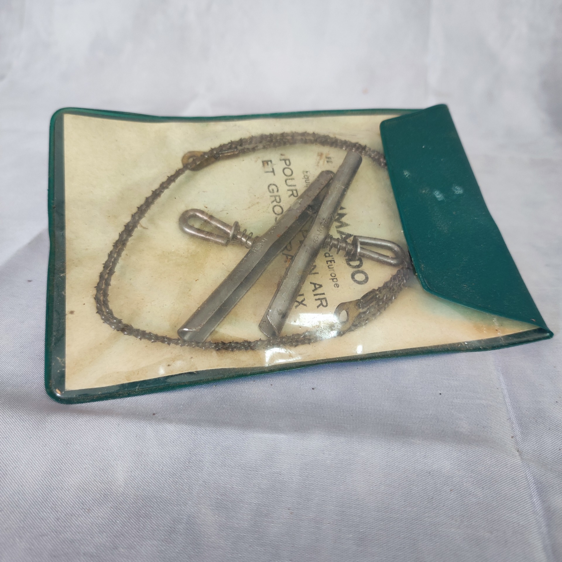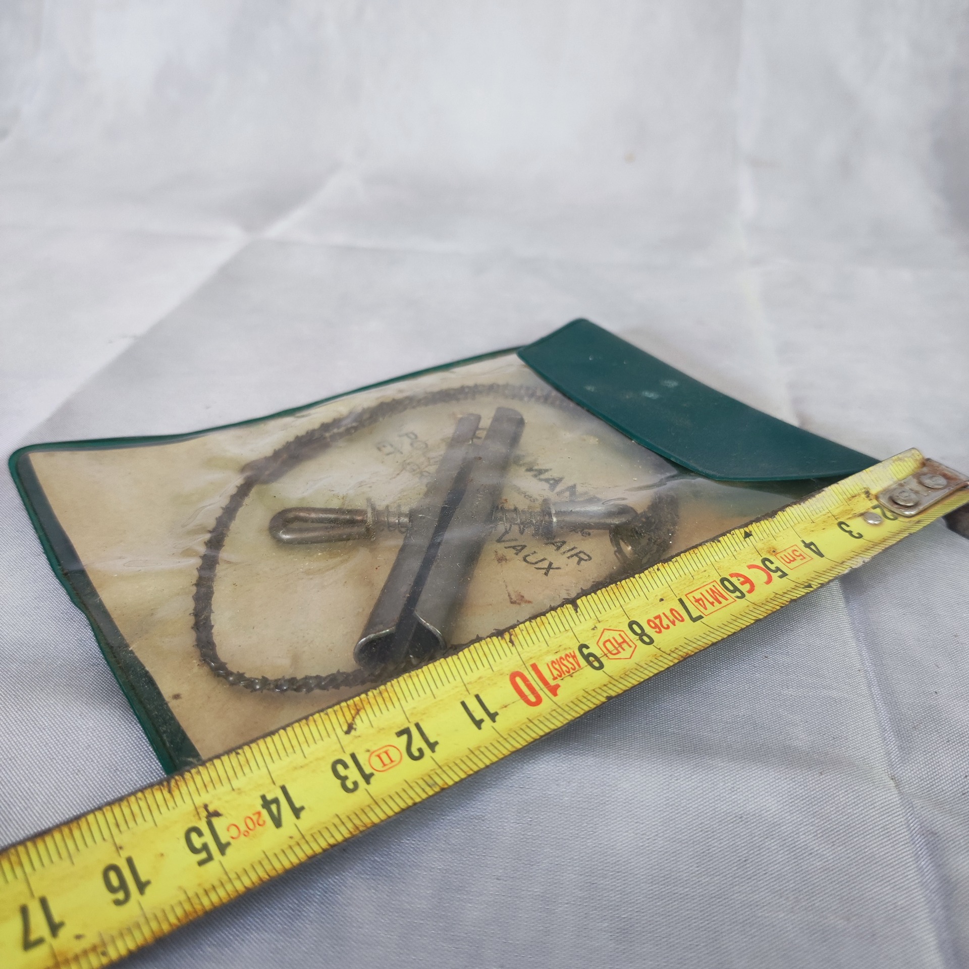 Obal je zažloutlý a měkce zkřehlý časem, plast ještě drží tvar. Řetízek i pilník lehce ošedlé, ale kompletní – tak, jak ležely v zásuvce, do které už nikdo roky nevstoupil. Původní francouzský nápis je stále čitelný.