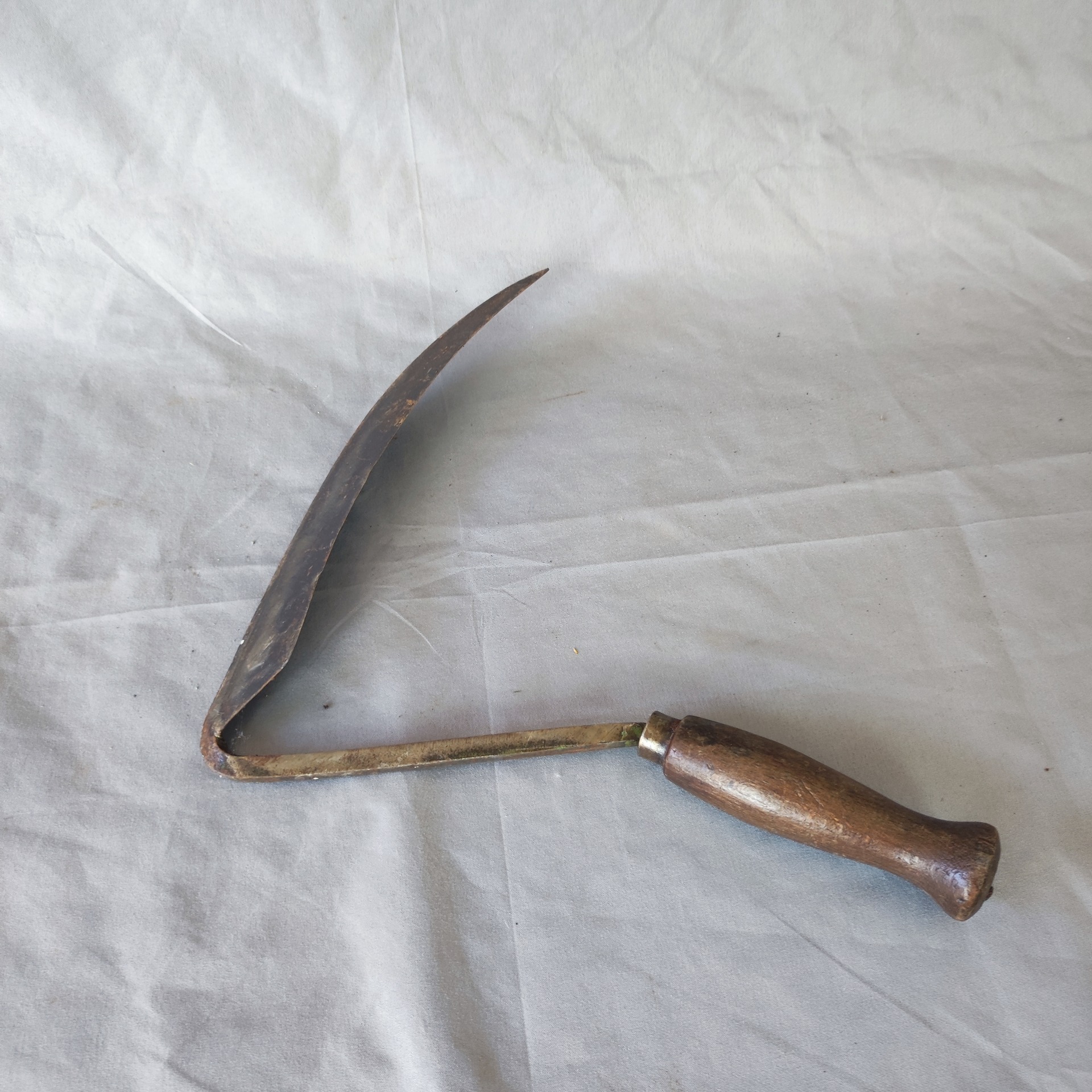 Tvarově odpovídá hákovému srpu používanému k prořezávání chmelu nebo révy, a na čepeli nese zbytky raznice původního výrobce – drobný ovál s písmeny, jaké používali kováři kolem roku 1900 ve Francii nebo Belgii.