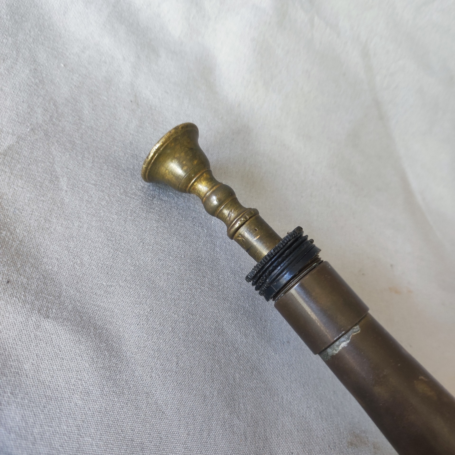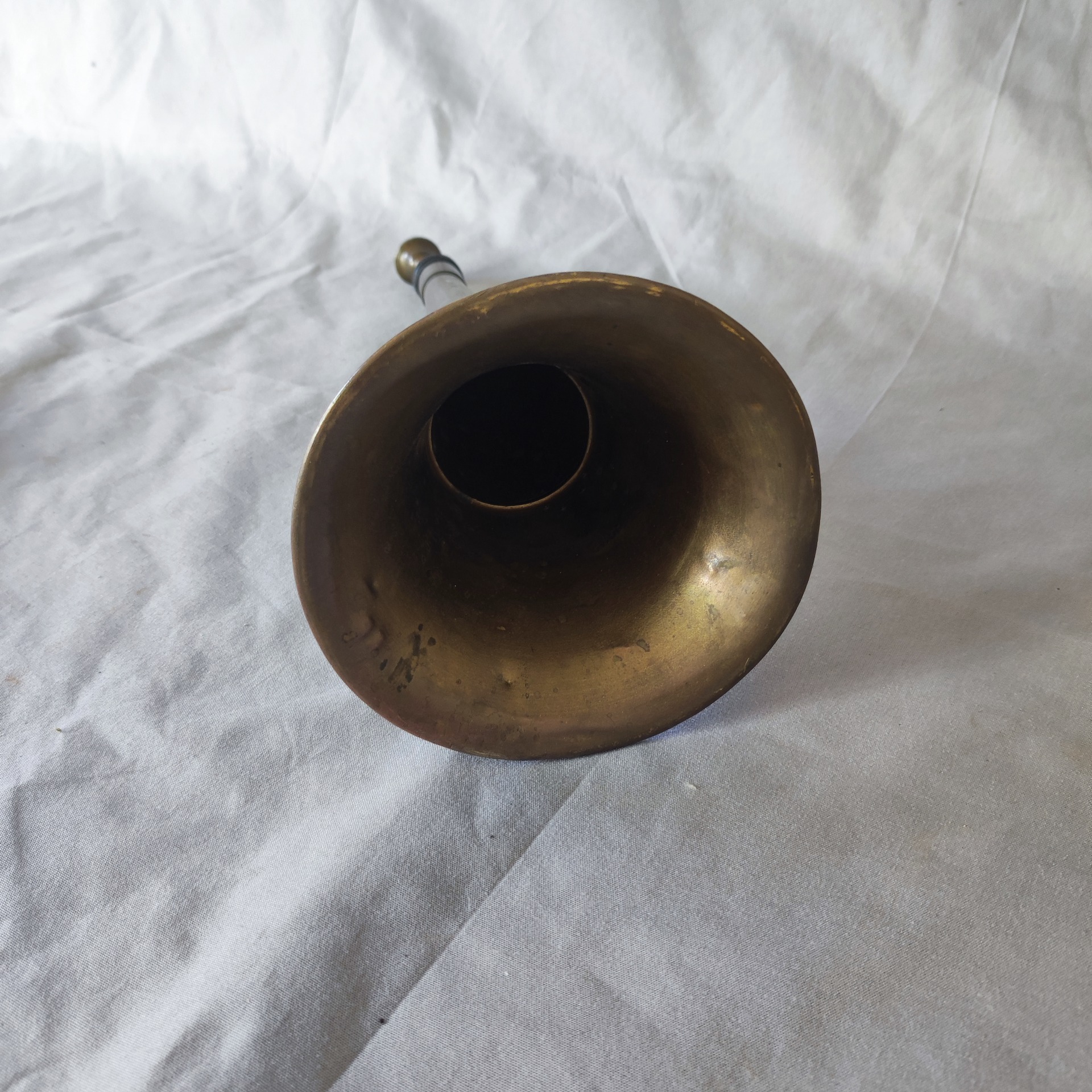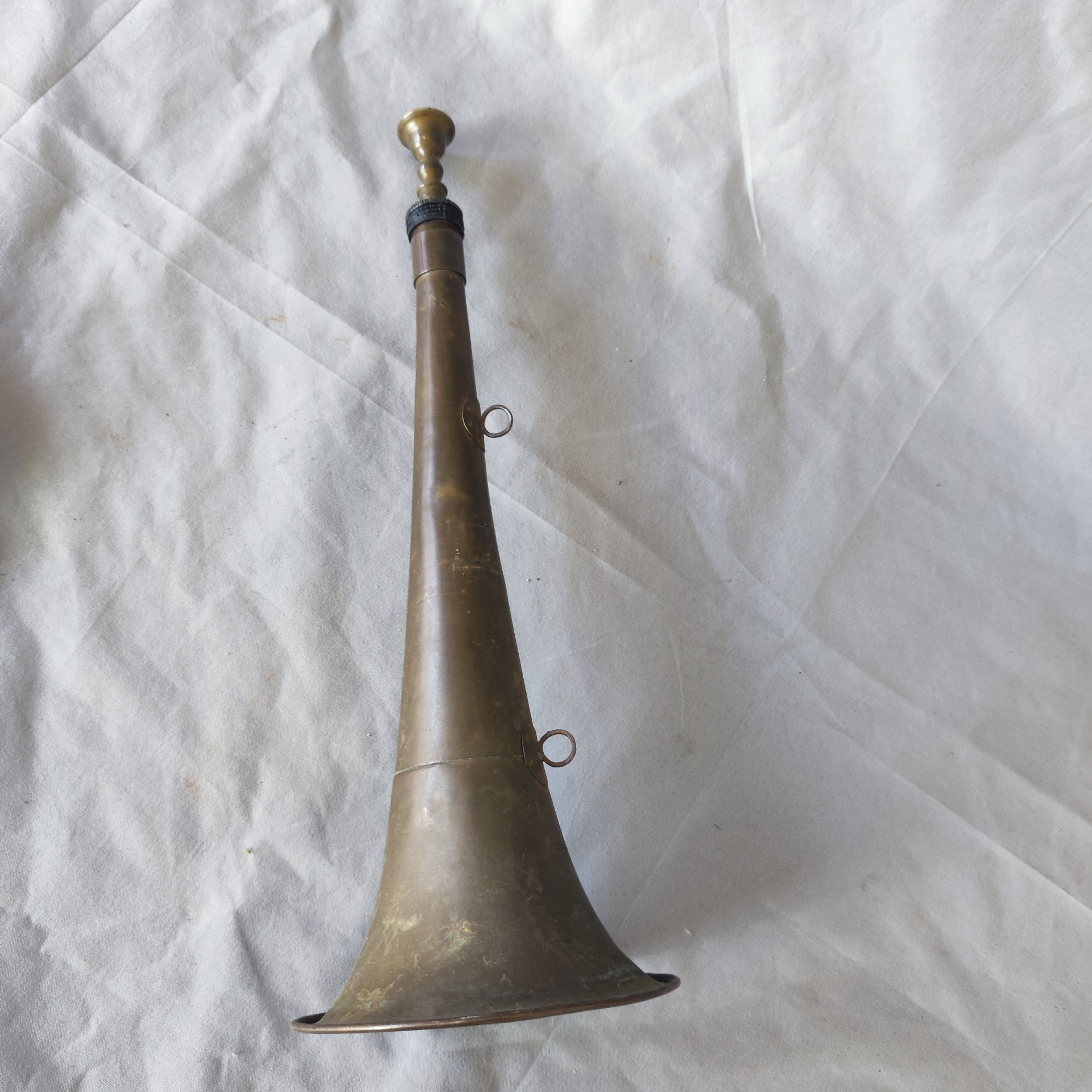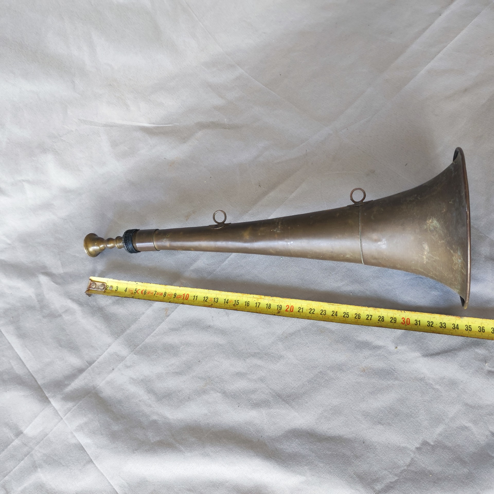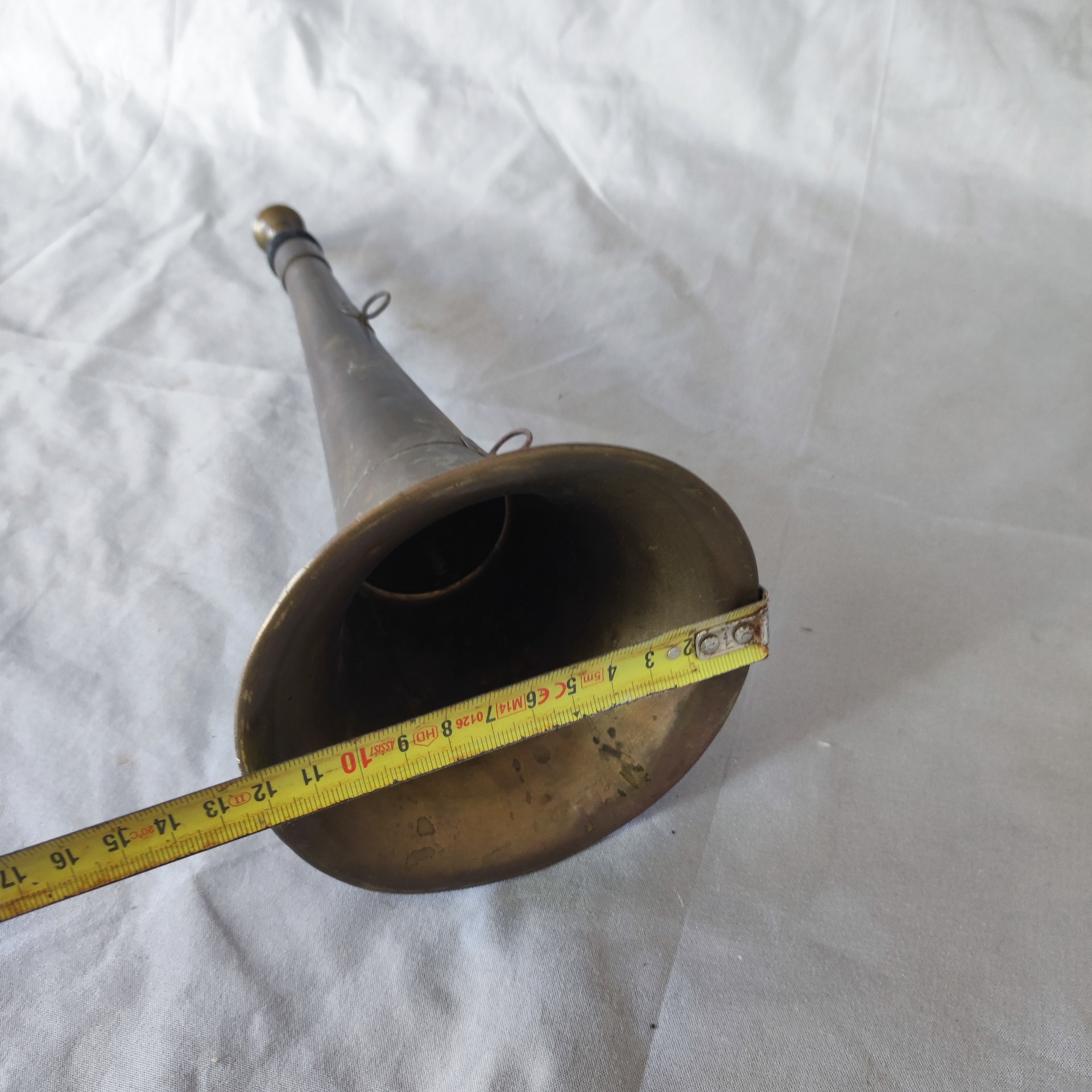 Tělo je z poctivé mědi s krásnou tmavou patinou, ručně pájené spoje, drobné nerovnosti od kladiva. Nátrubek je pozdější doplněk, přidaný, aby zůstal tvar i možnost znovu rozezvučet ten kovový hlas. Celkově působí silně, klidně a opravdově – přesně tak, jak to má u staré mědi být.