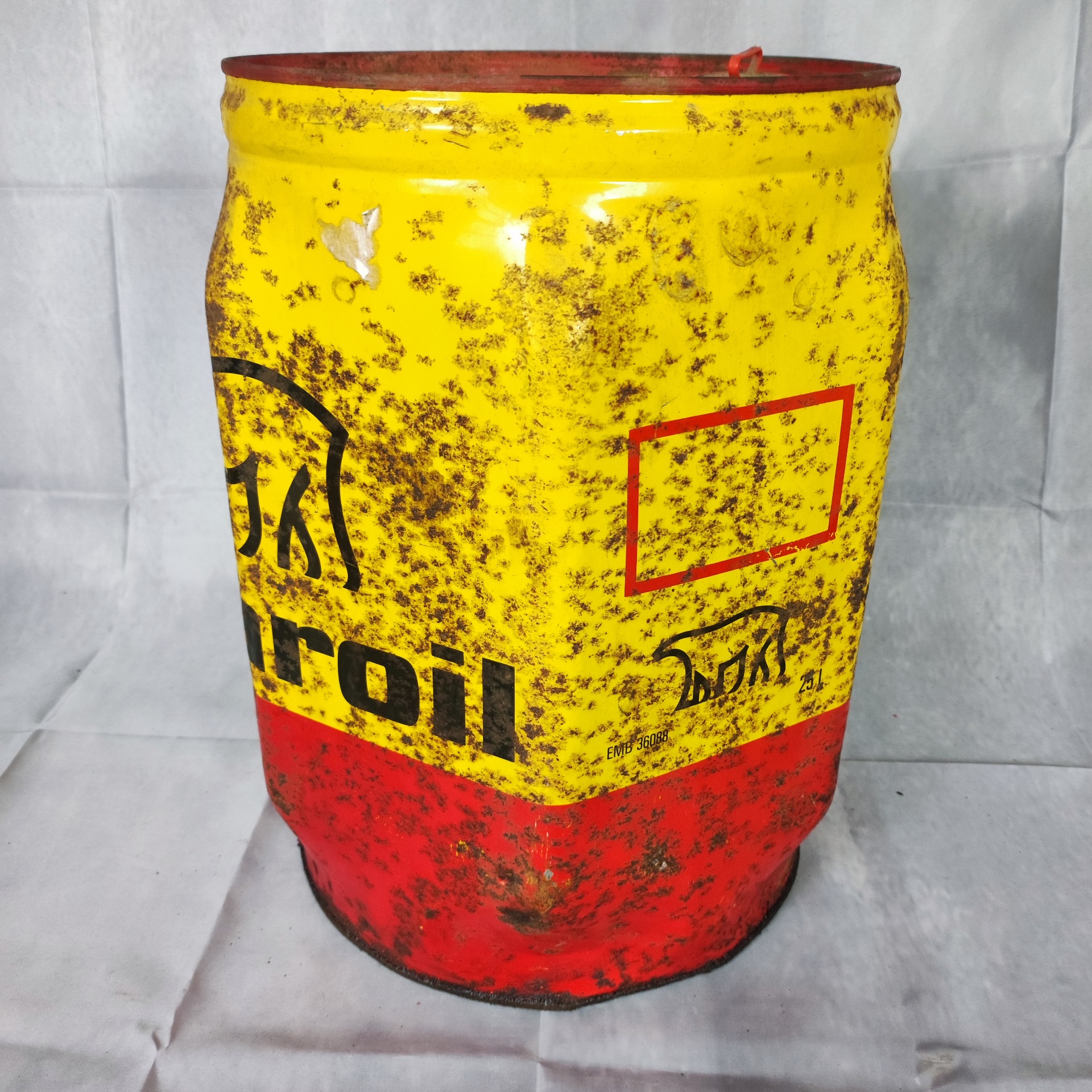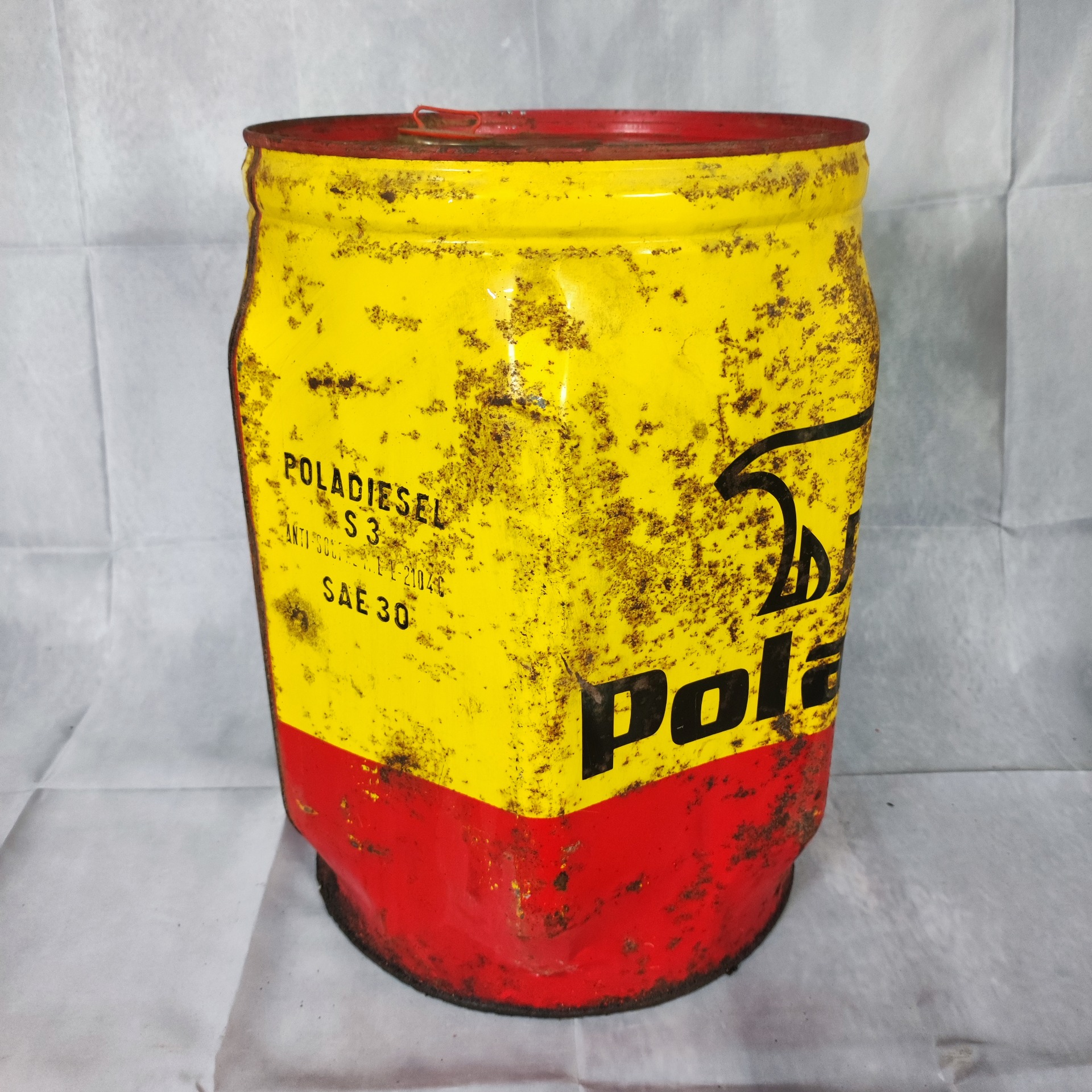 Plech s patinou, místy rez, barvy původní, dobře čitelné logo Polaroil s medvědem. Sud pevný, uzávěr zachovaný, lehce promáčklý po obvodu.